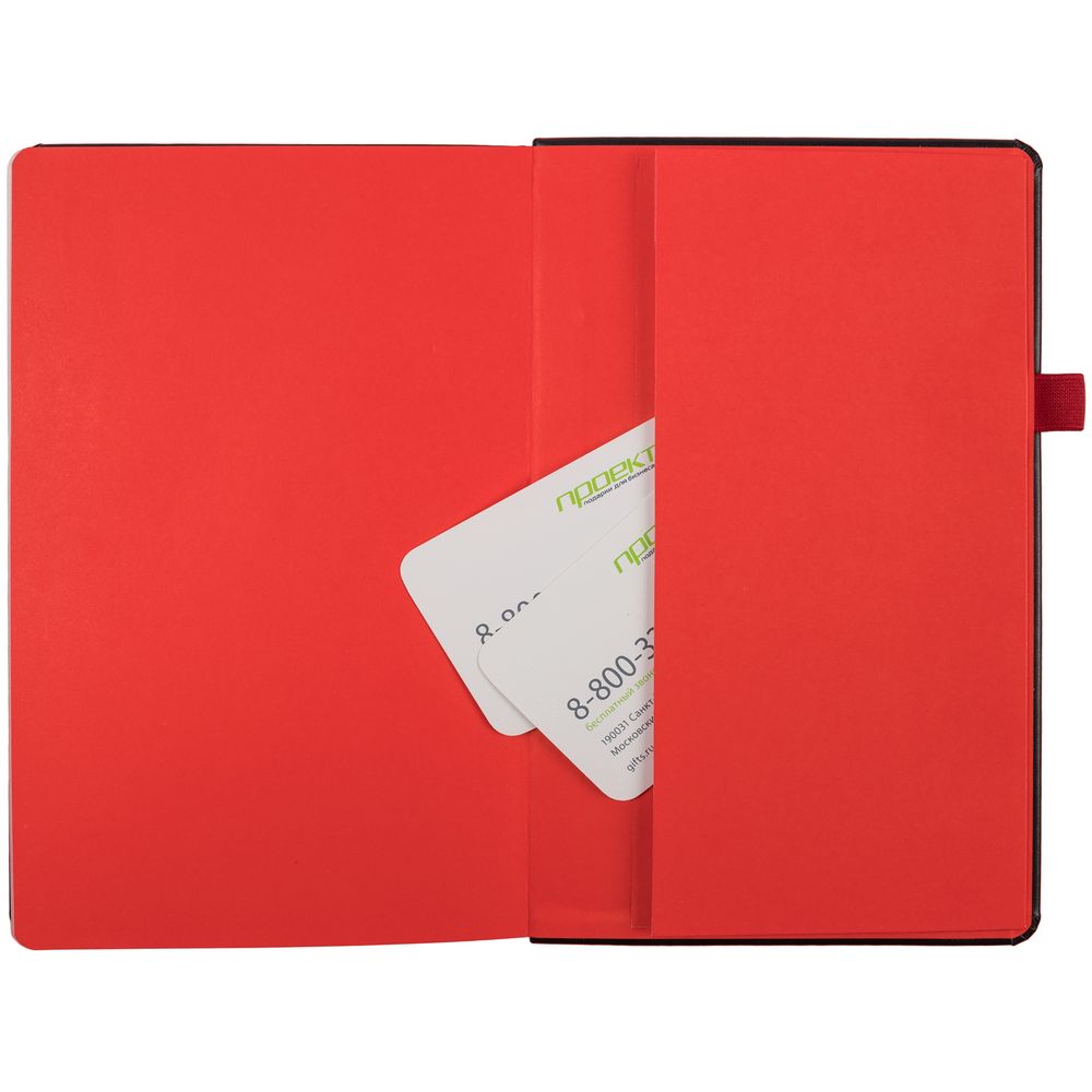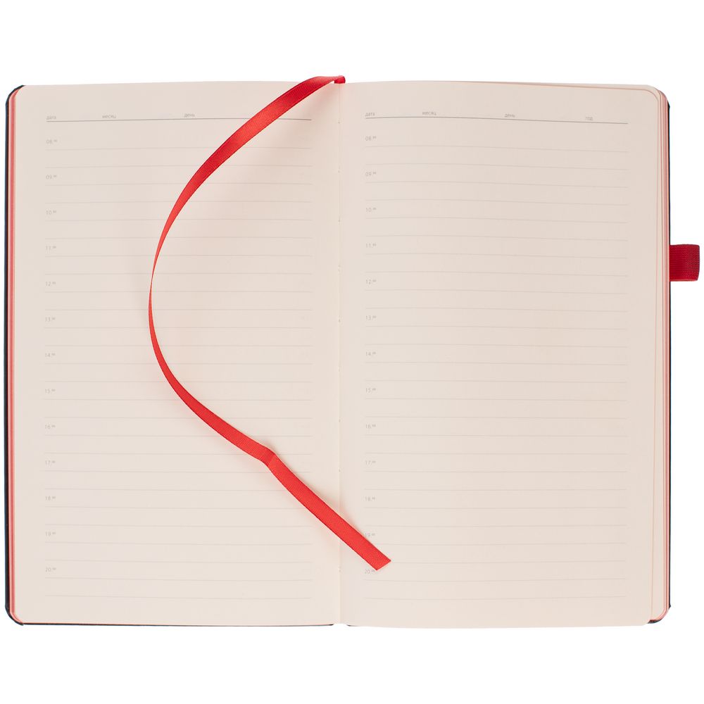 Ежедневник с твердой обложкой, выполнен из материала Waltz, черный АА, дополнен красной резинкой с металлическим шильдом и ляссе.