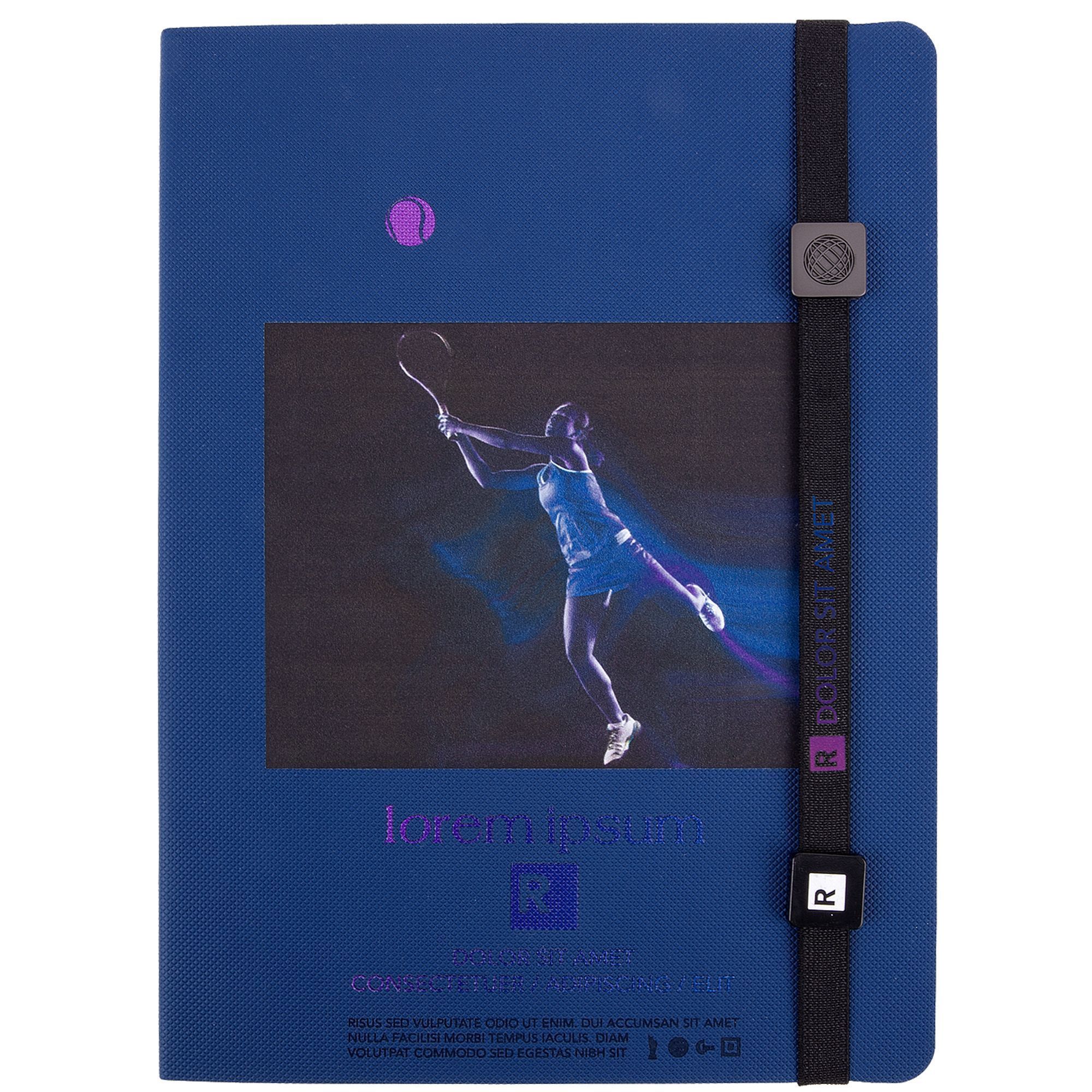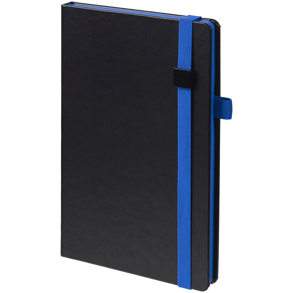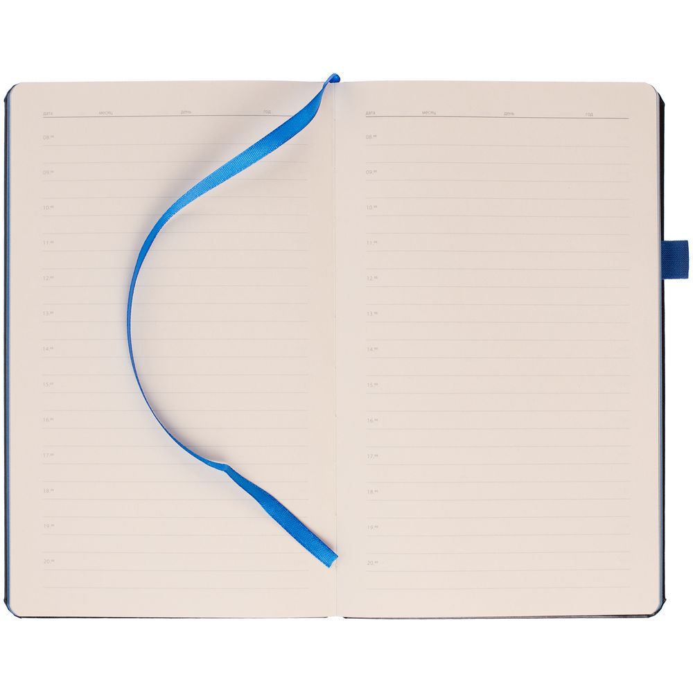 Ежедневник с твердой обложкой, выполнен из материала Waltz, черный АА, дополнен синей резинкой с металлическим шильдом и ляссе.