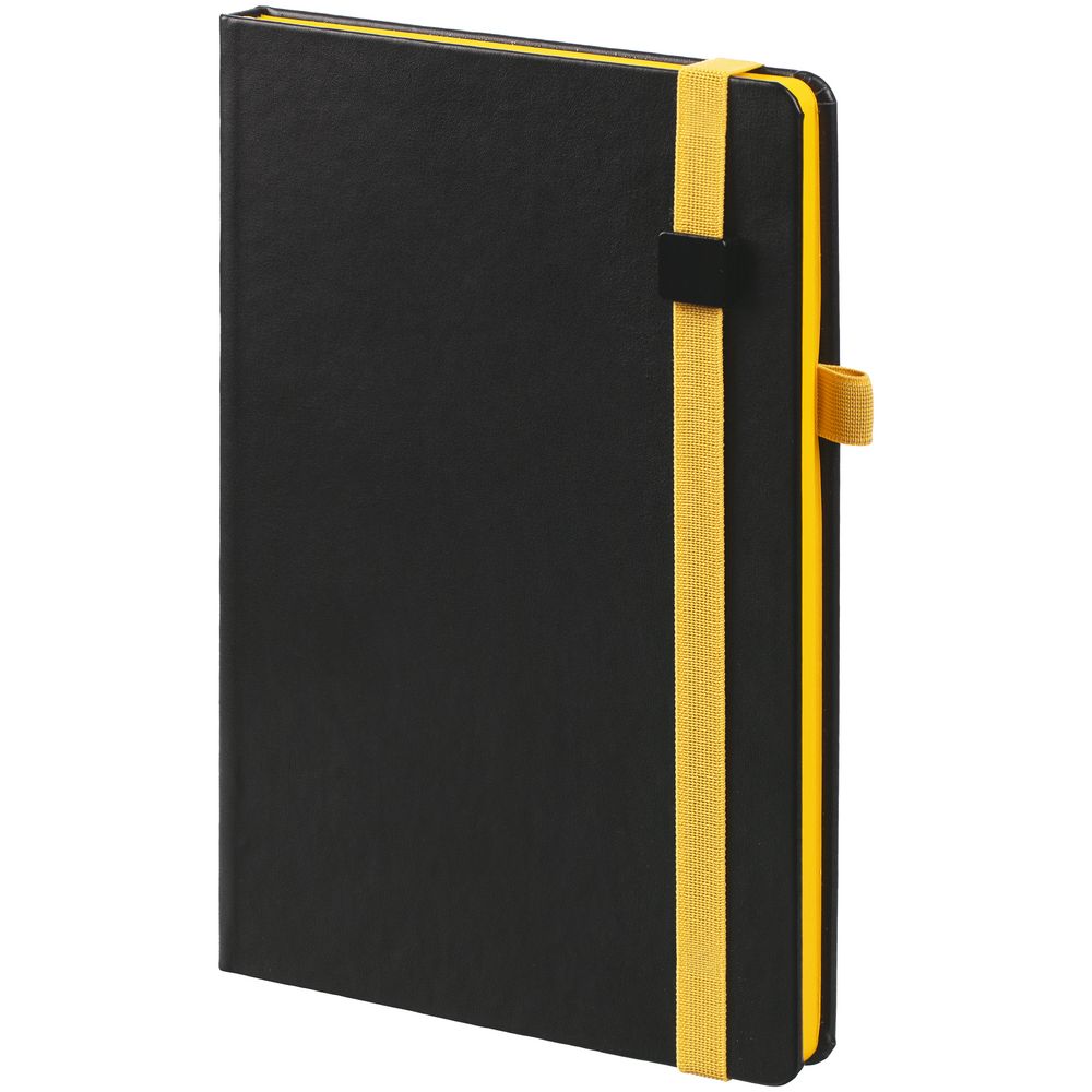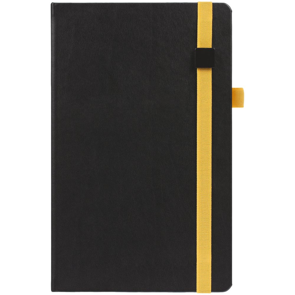 Ежедневник с твердой обложкой, выполнен из материала Waltz, черный АА, дополнен желтой резинкой с металлическим шильдом и ляссе.