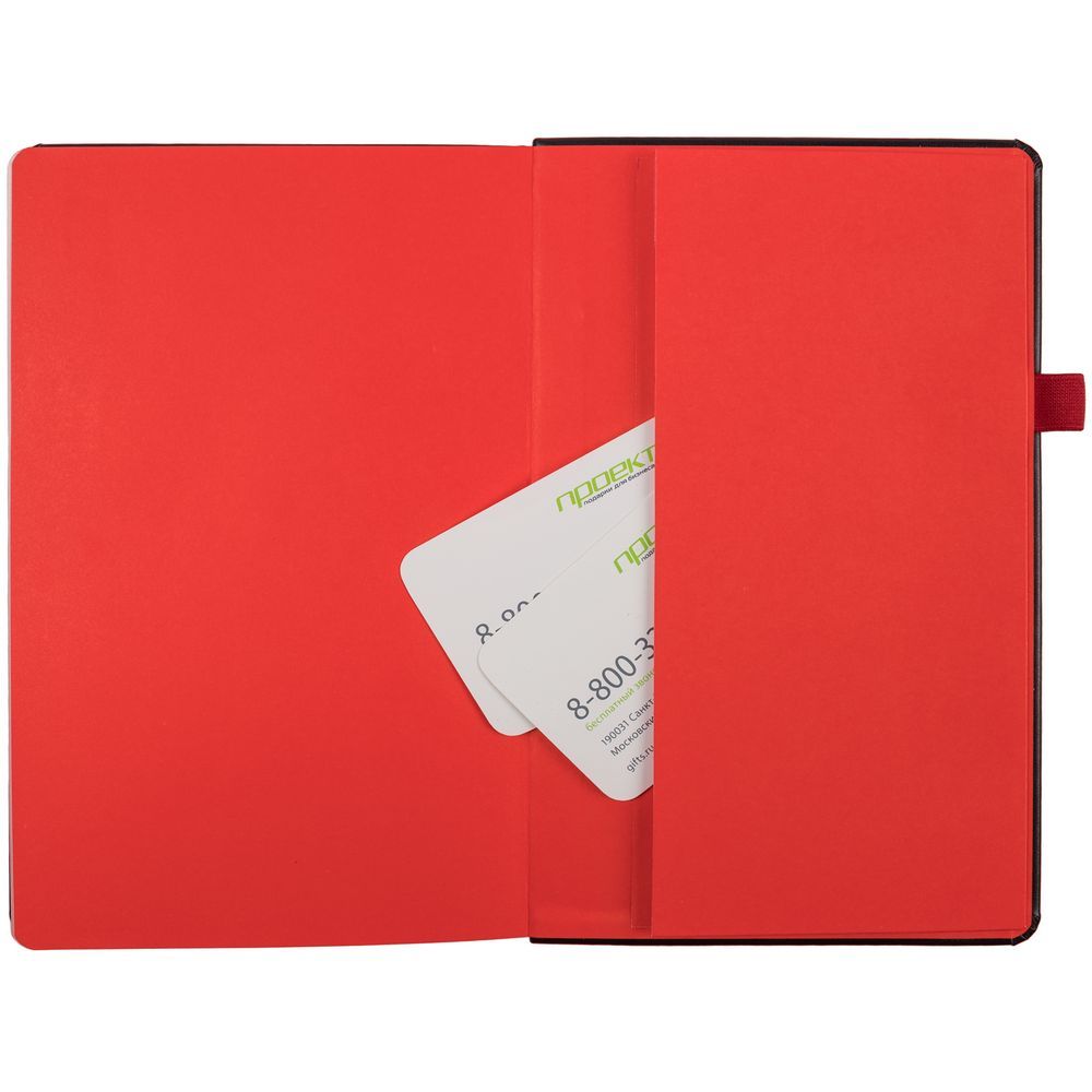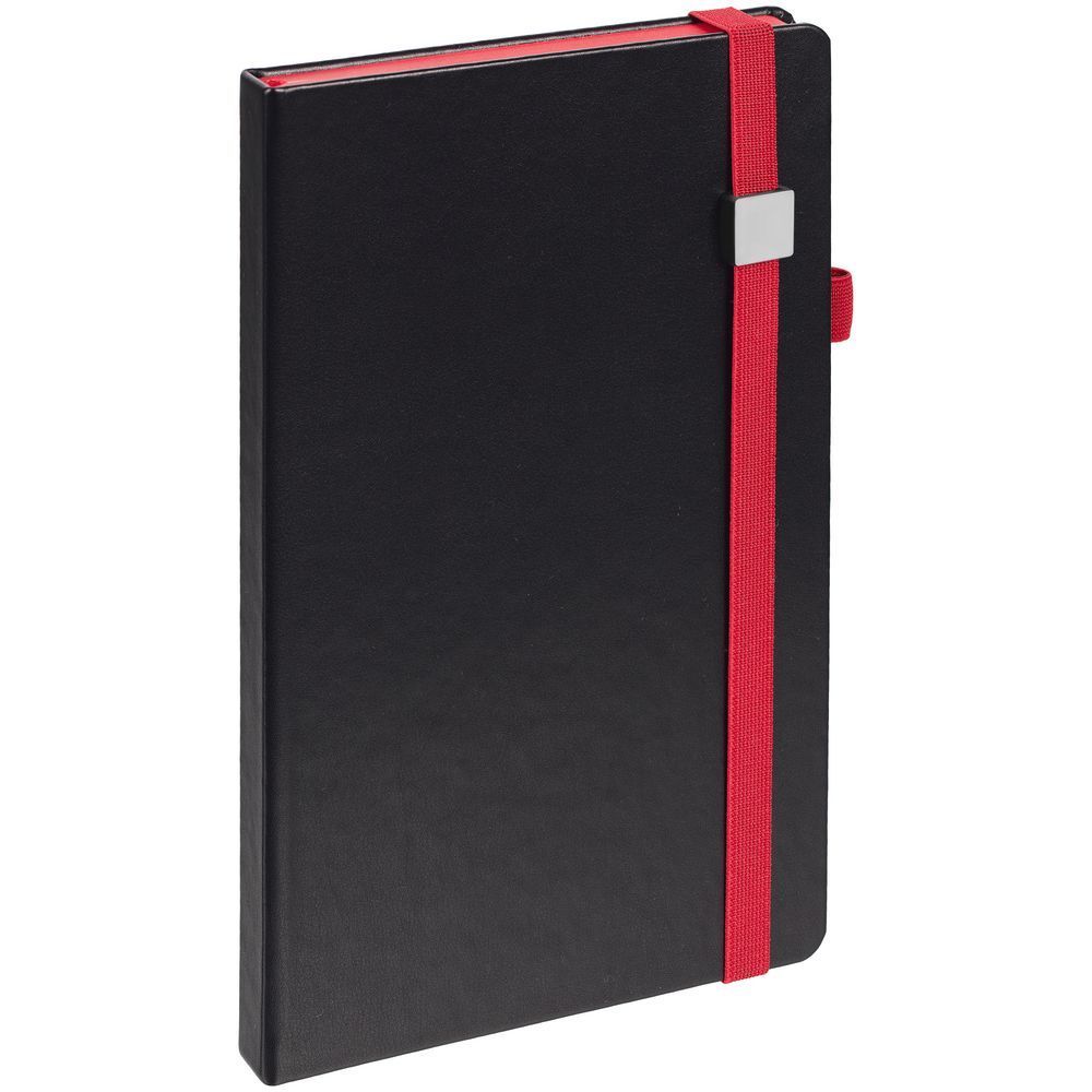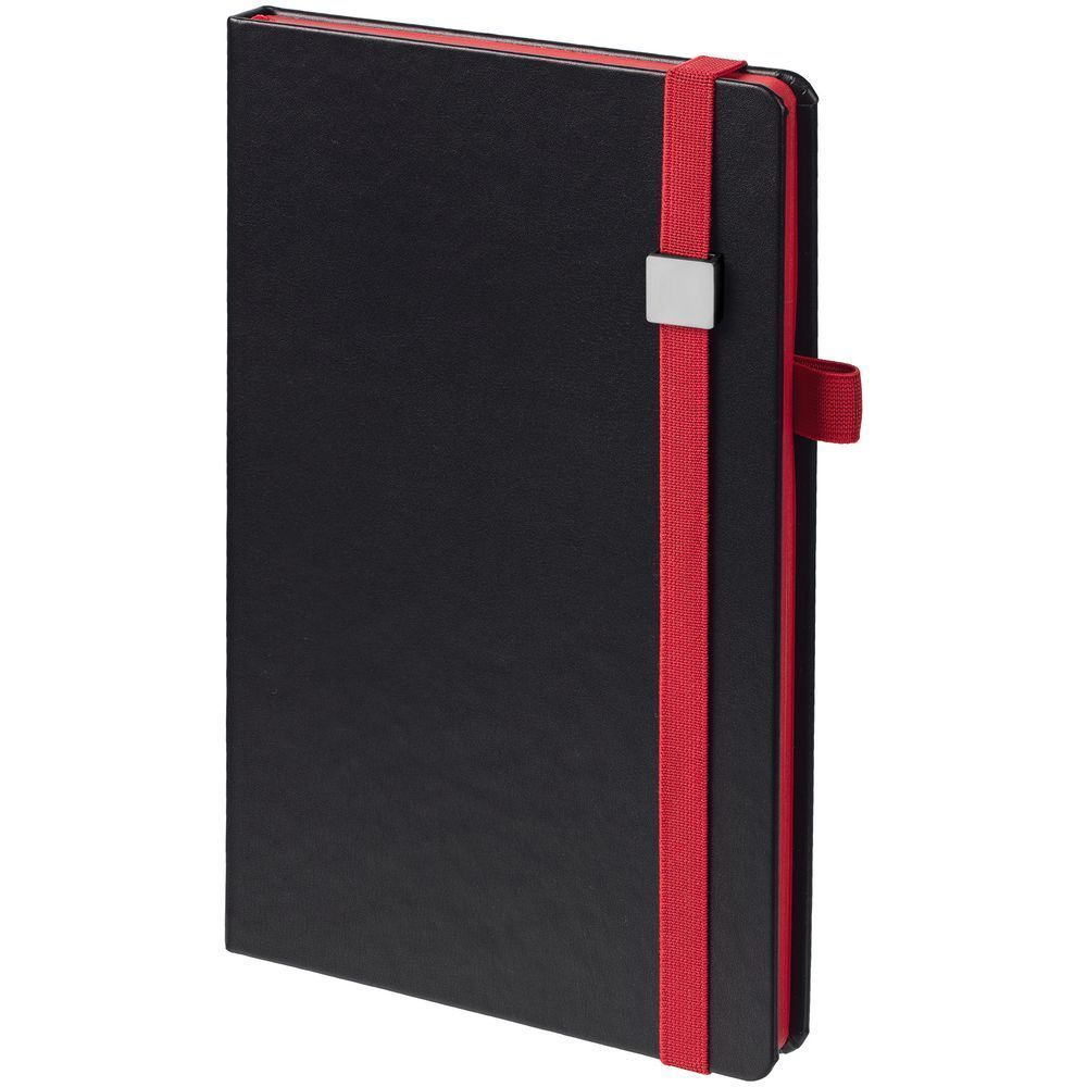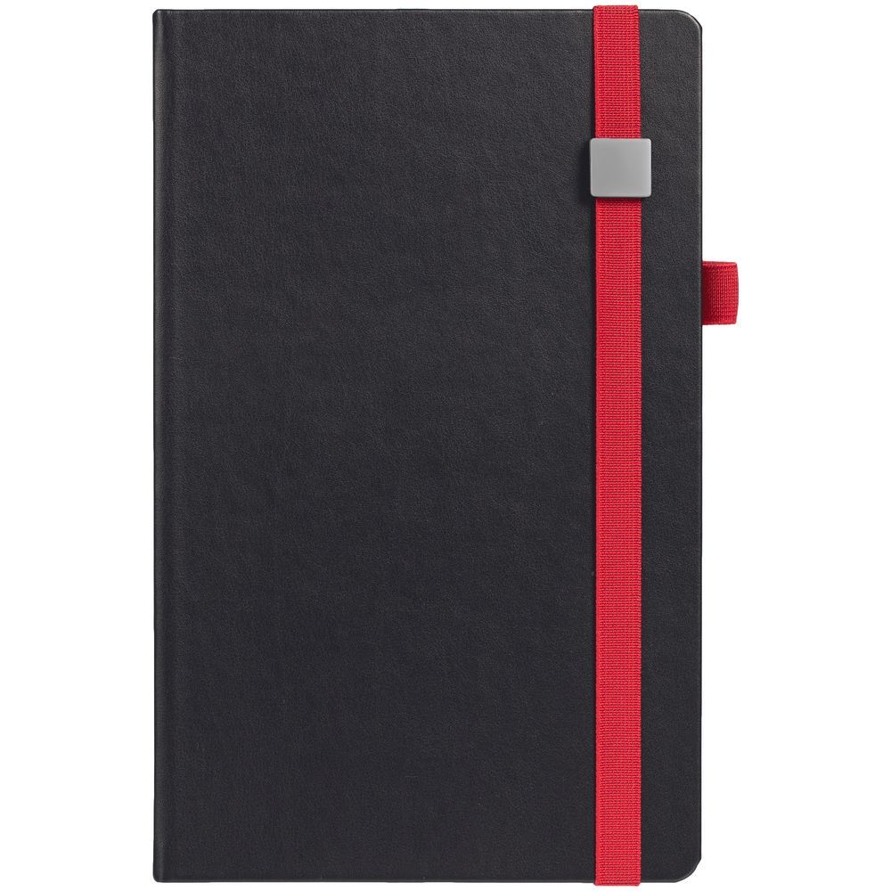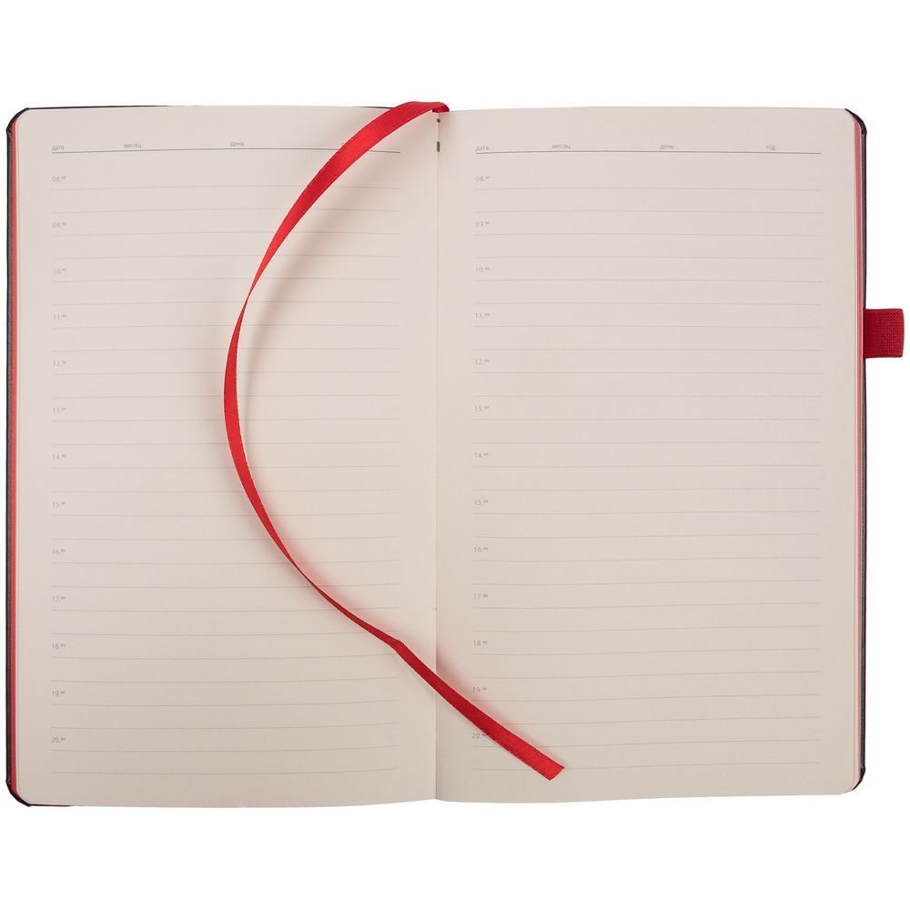 Ежедневник с полутвердой обложкой, выполнен из материала Waltz, черный АА, дополнен красными резинкой с металлическим шильдом и ляссе.