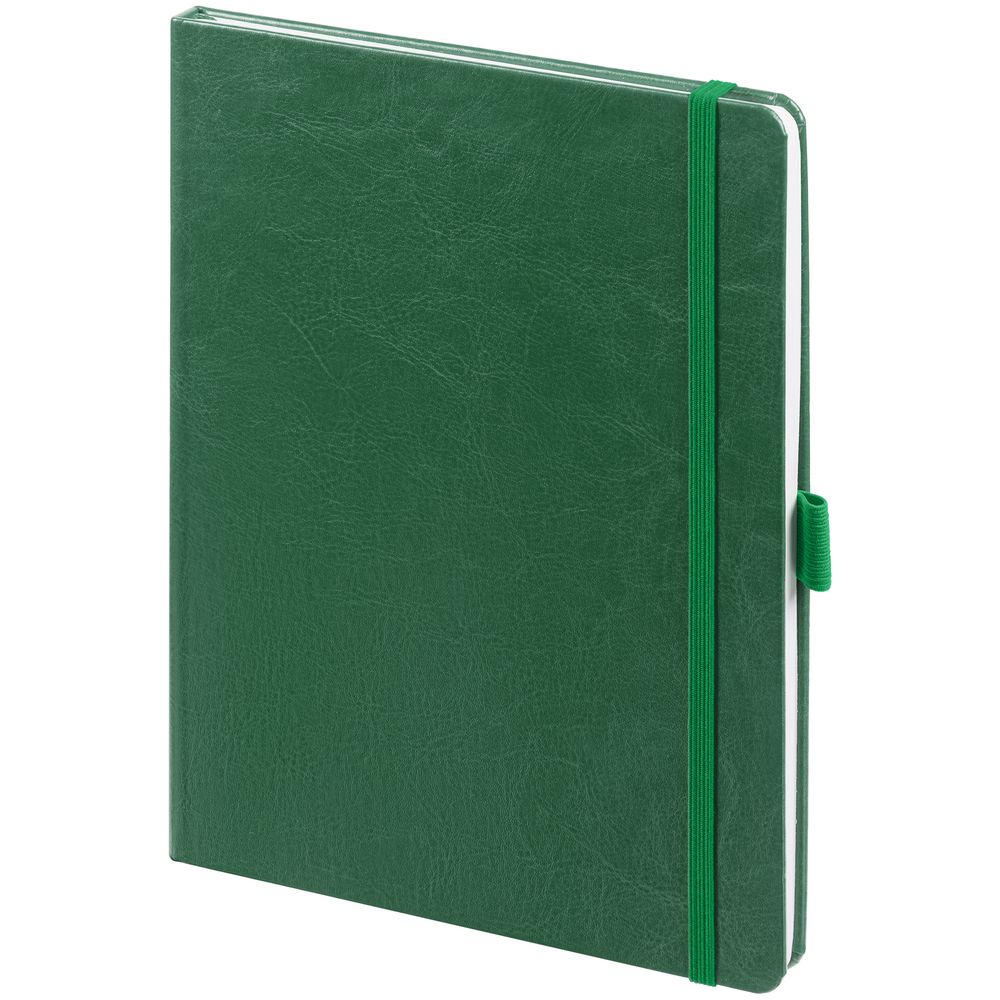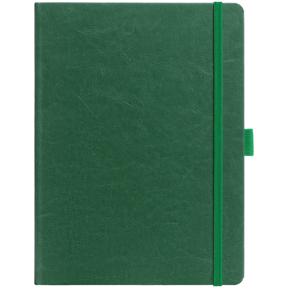 Еженедельник в твердой обложке выполнен из материала Nebraska, зеленый FF, дополнен резинкой, петлей для ручки и ляссе зеленого цвета.