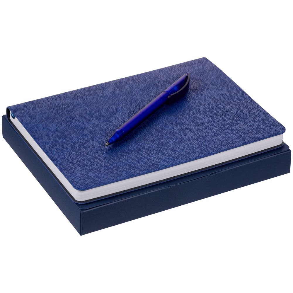 Недатированный ежедневник с гибкой обложкой из фактурного материала La Fite и металлическим шильдом на ляссе и ручка в тон, упакованные в подарочную коробку из дизайнерского картона.