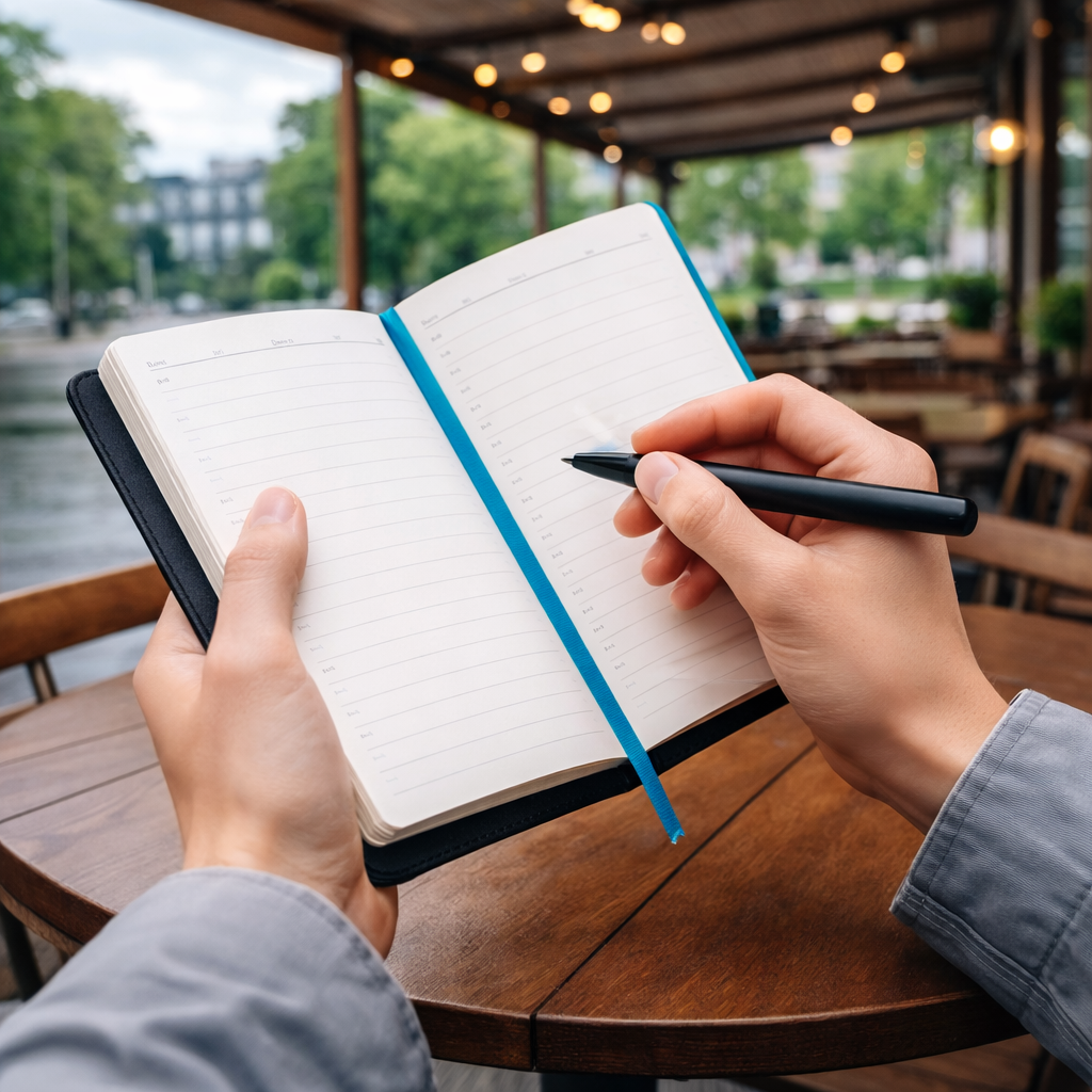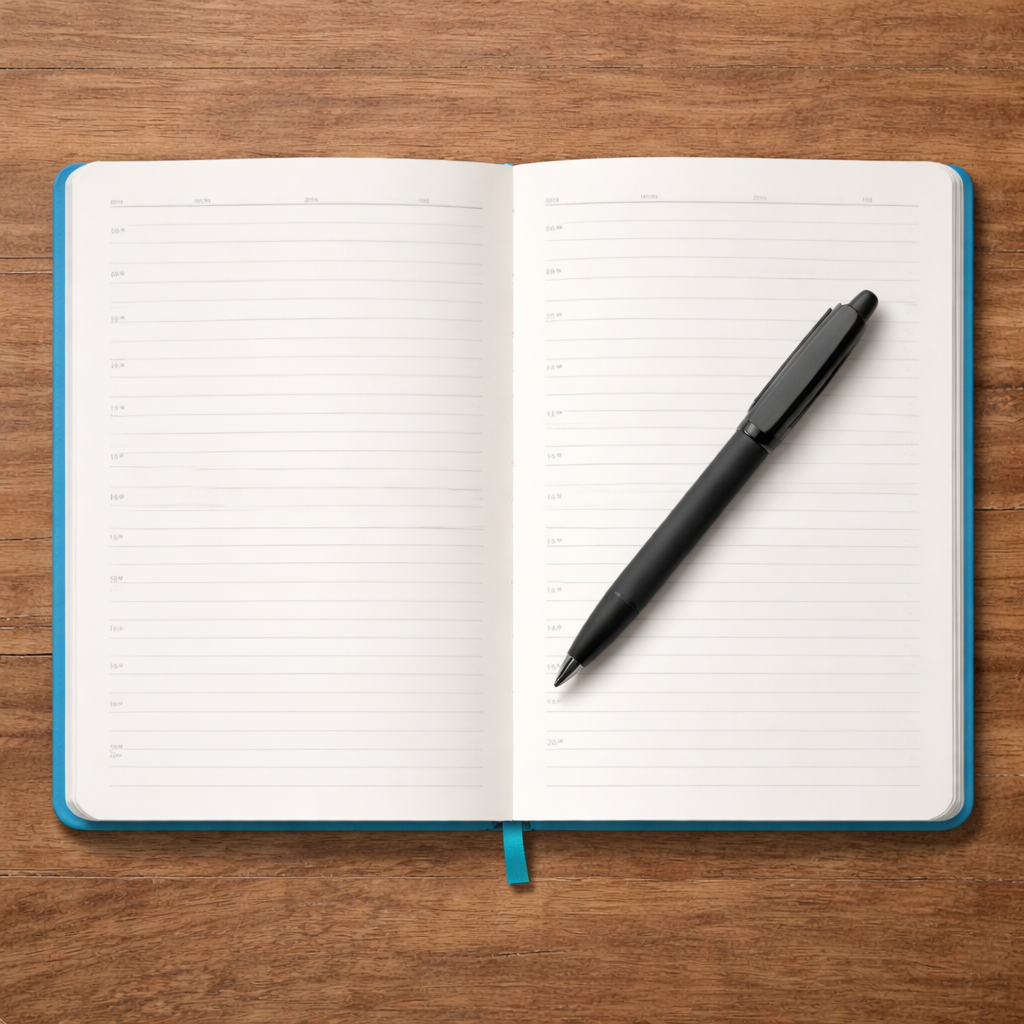 - Недатированный ежедневник с голубым обрезом — пространство для планов, идей и заметок без ограничений по датам.