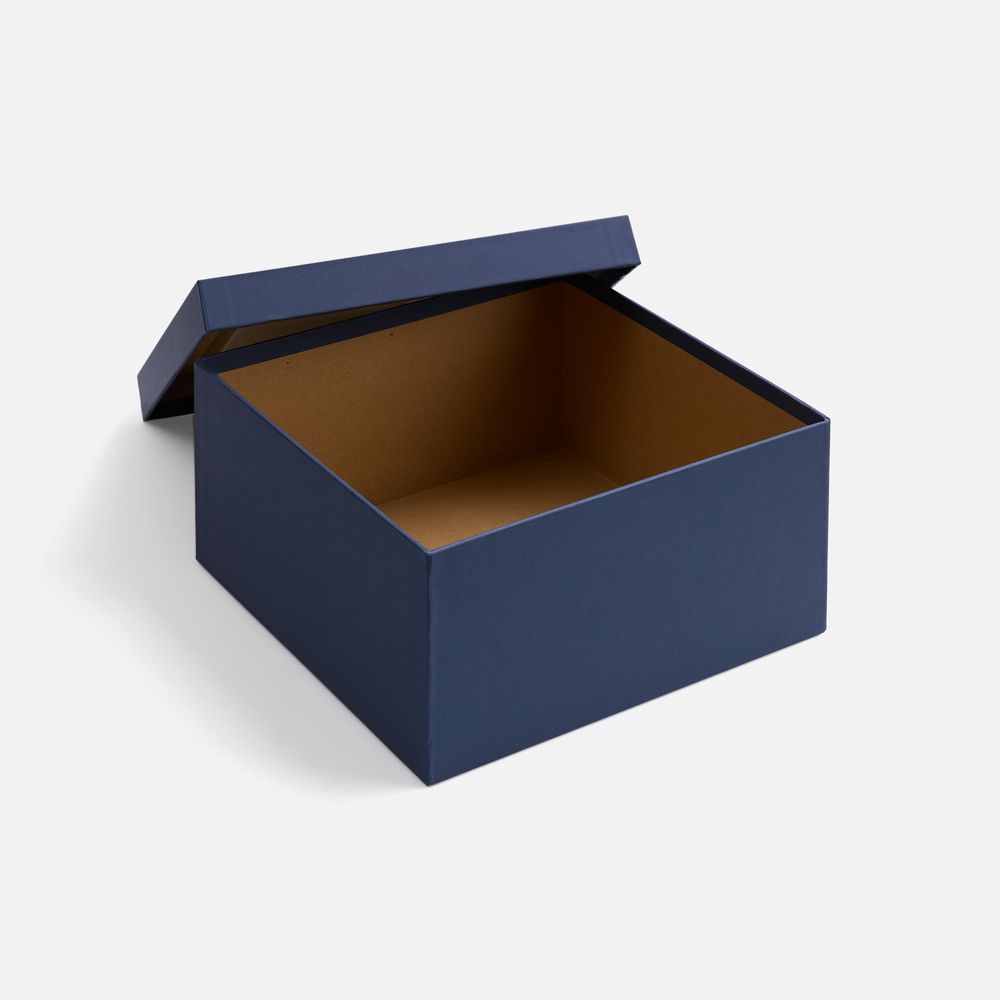 Коробка из переплетного картона, кашированного синей дизайнерской бумагой.