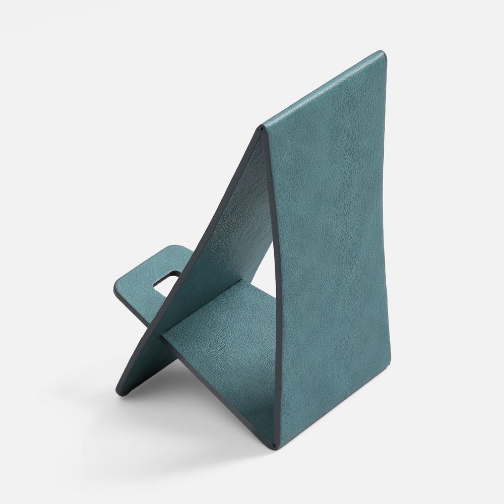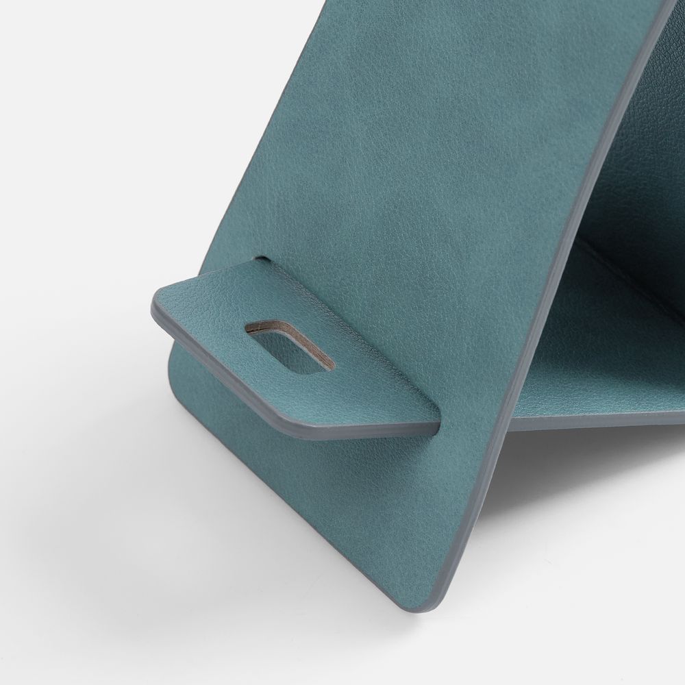 Складная подставка для телефона с вырубкой под шнур зарядного устройства. Выполнена из материала Petrus.