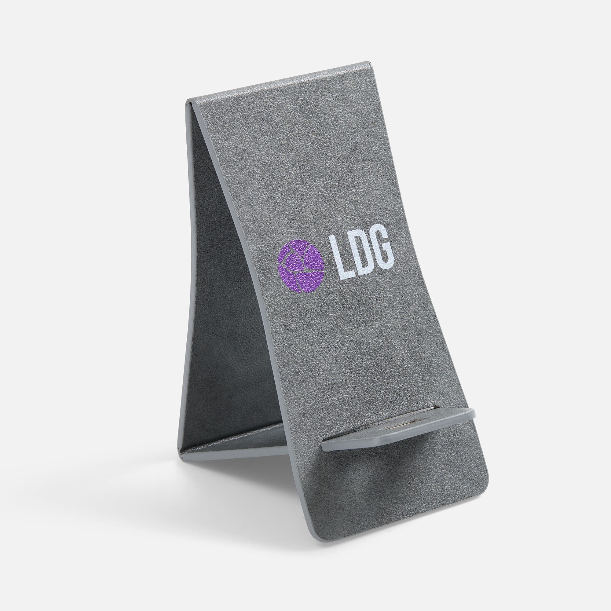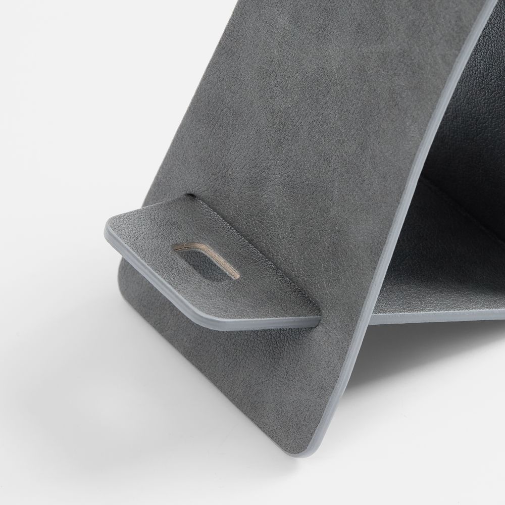 Складная подставка для телефона с вырубкой под шнур зарядного устройства. Выполнена из материала Petrus.