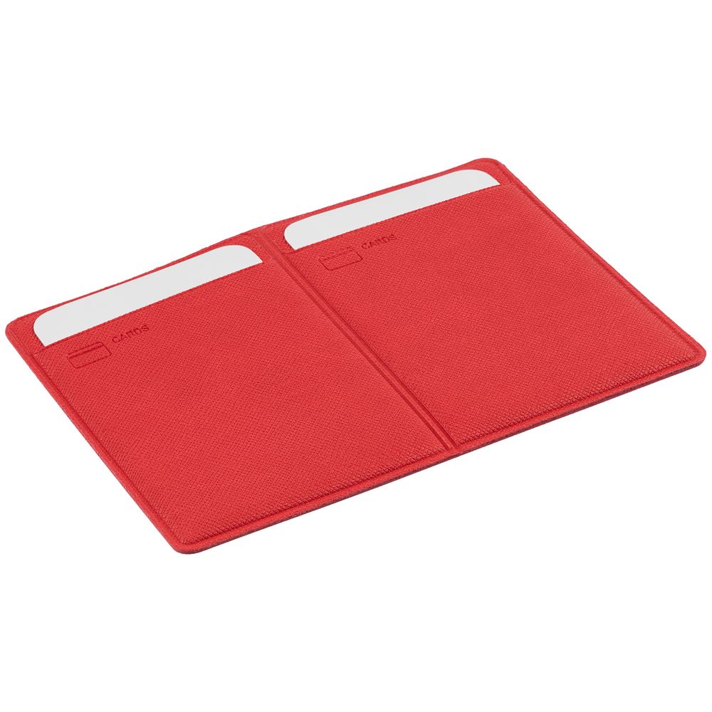 Обложка из искусственного материала, имитирующего сафьяновую кожу, с четырьмя карманами: для водительского удостоверения, свидетельства о регистрации, денег и пластиковых карт.