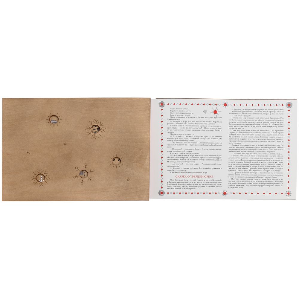 Новогодняя книга «Щелкунчик» способна вызвать тот неповторимый трепет от встречи с чем-то волшебным. Это сразу два чудесных подарка в одном необычном воплощении: резную книгу можно не только читать, любуясь каждой страницей, но и преобразовывать в настоящие деревянные елочные игрушки. Так история оживает прямо на глазах — как в лучших сказках и самой богатой фантазии, а сам презент впечатлит оригинальной задумкой и исполнением.В наборе книга Э.Т.А. Гофмана «Щелкунчик» в сокращении и 11 деревянных подвесок на елку.
