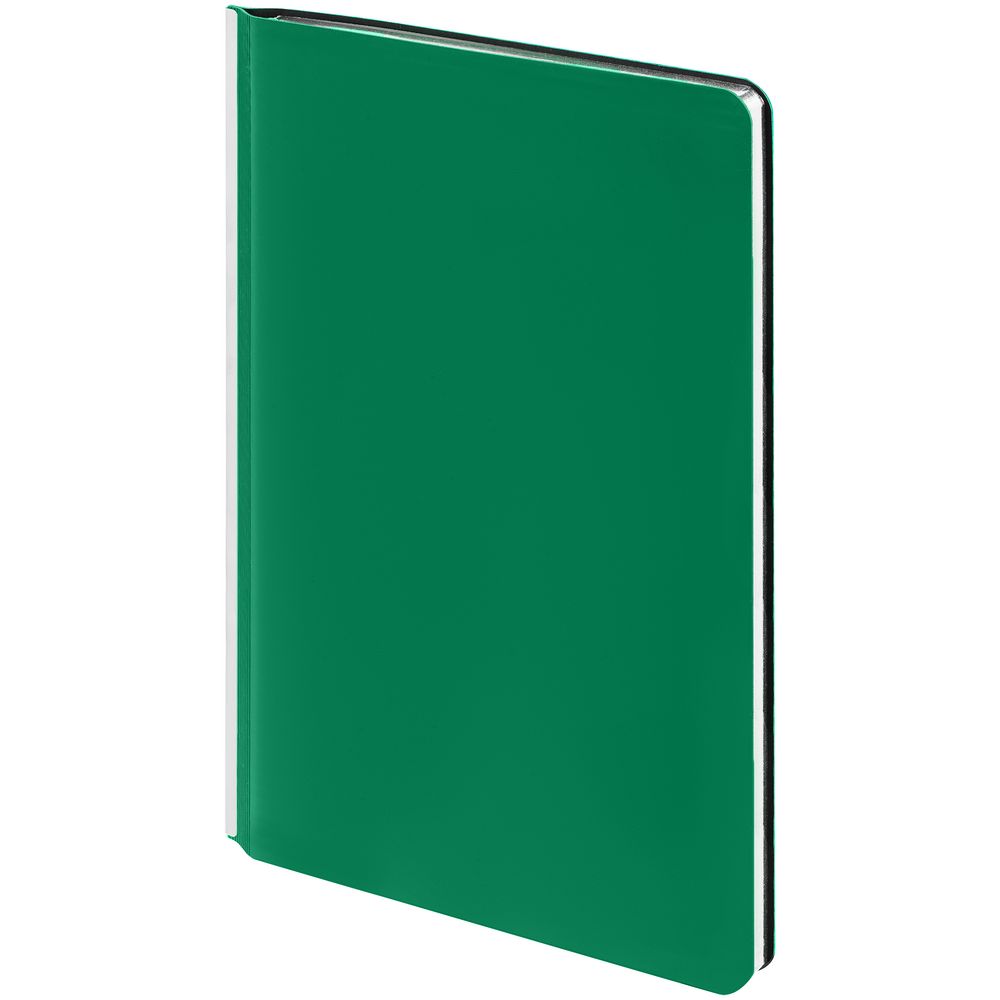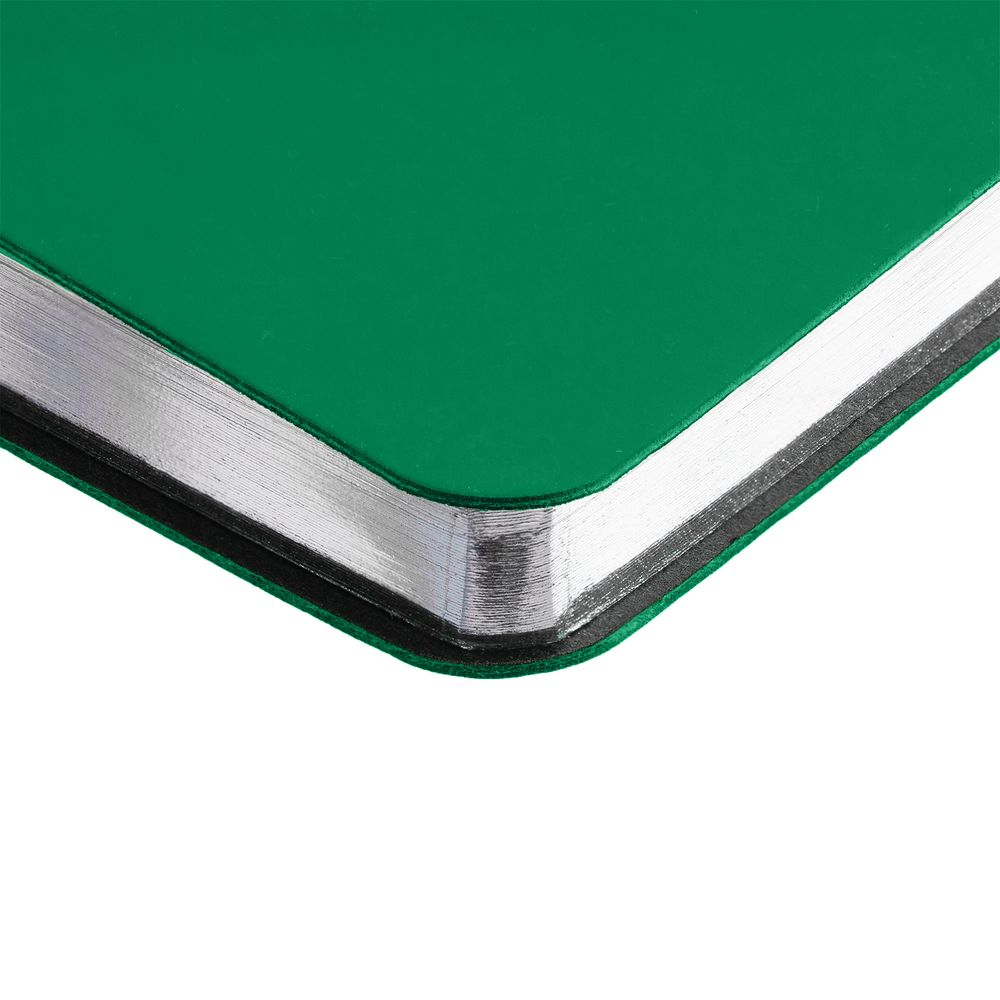 Ежедневник с гибкой обложкой и металлическим корешком, выполнен из материала Soft Touch Ultra, зеленый FF, дополнен серебристым обрезом блока и ляссе.