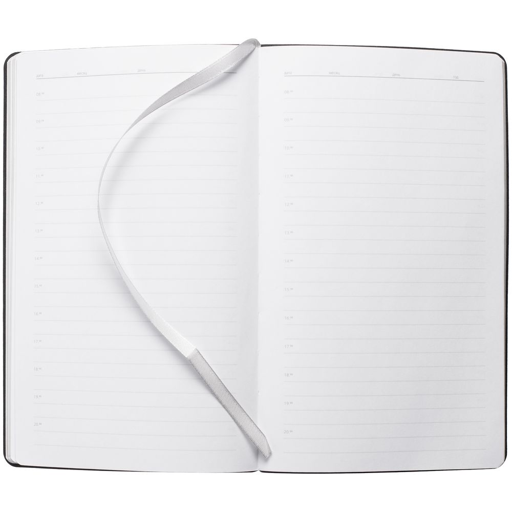 Ежедневник с гибкой обложкой и металлическим корешком, выполнен из материала Soft Touch, желтый КК, дополнен серебристым обрезом блока и ляссе.