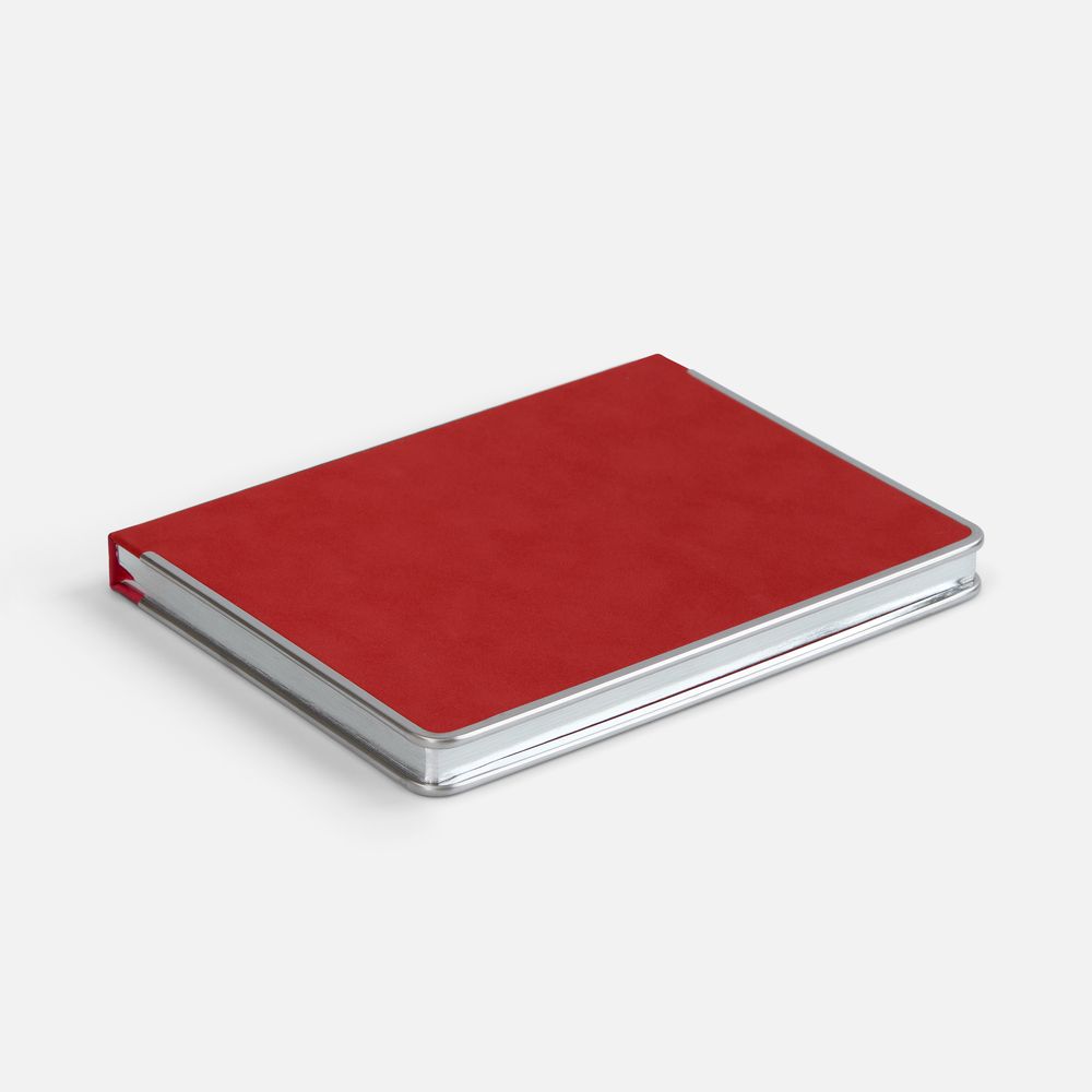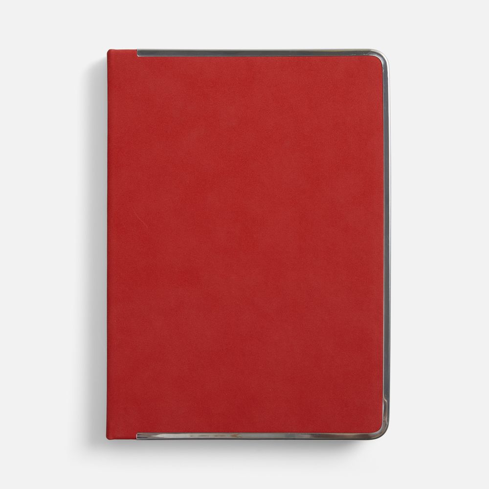 Ежедневник с твердой обложкой и серебристым обрезом блока. Выполнен из материала Nubuck, красный РР, дополнен красным ляссе и металлическими рамками с двух сторон обложки.