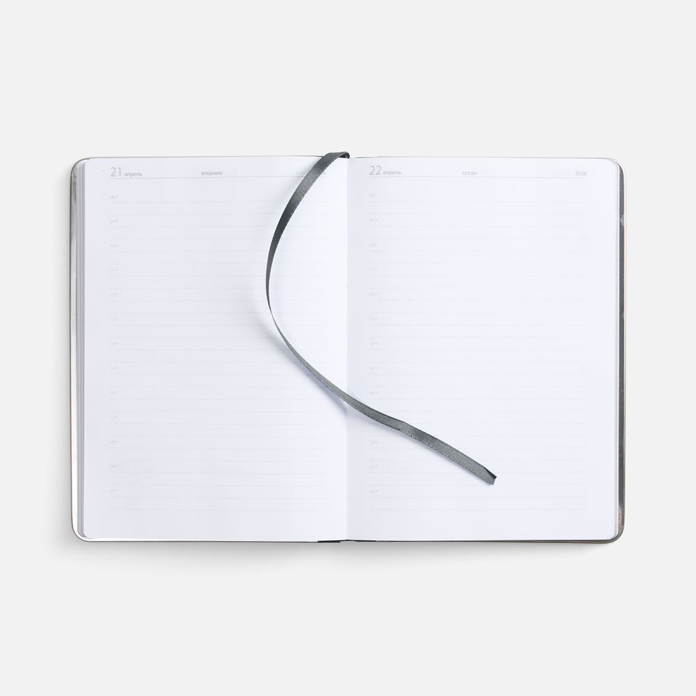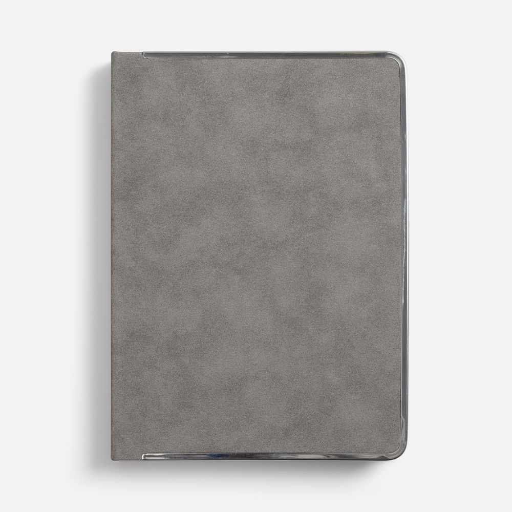 Ежедневник с твердой обложкой и серебристым обрезом блока. Выполнен из материала Nubuck, серый СС, дополнен серым ляссе и металлическими рамками с двух сторон обложки.