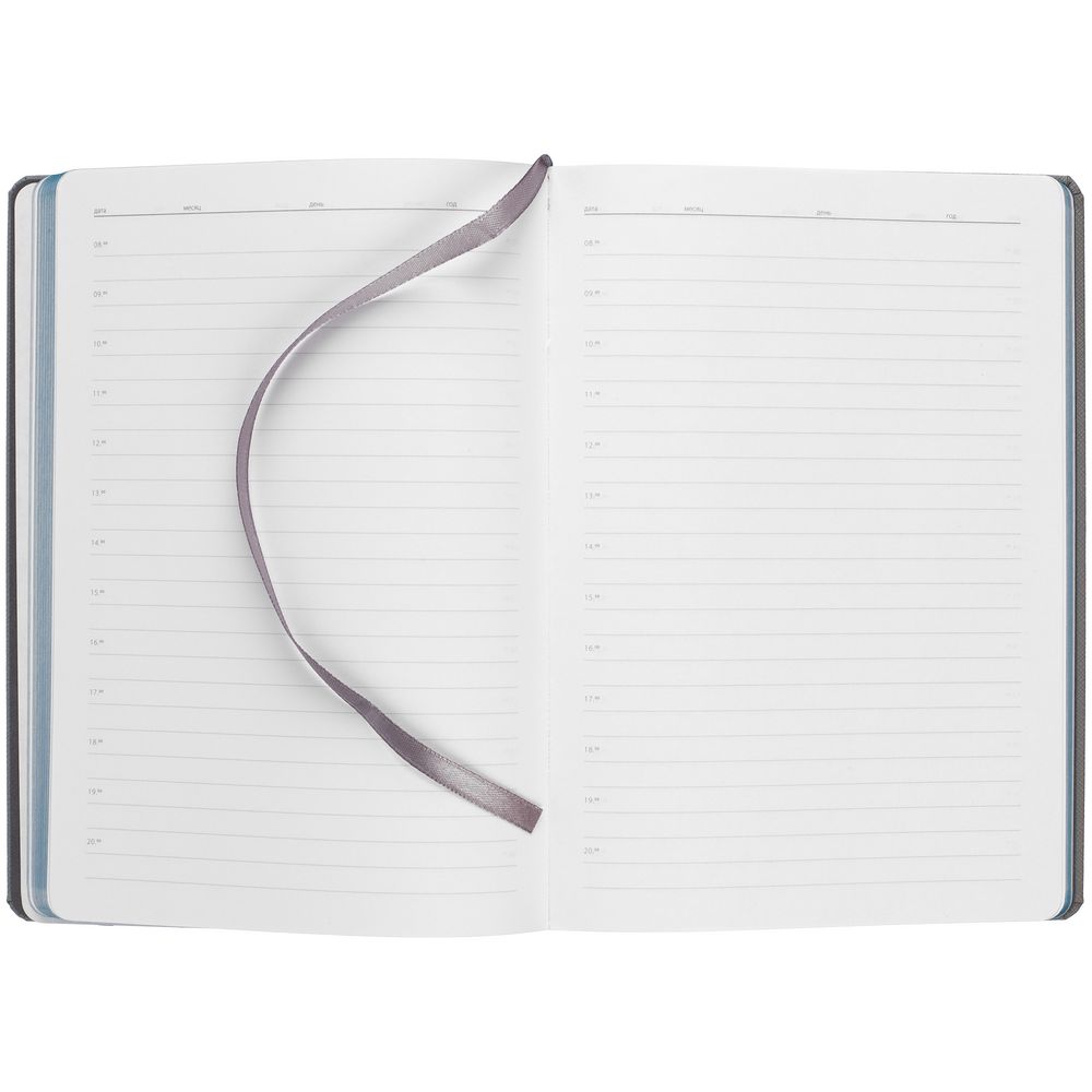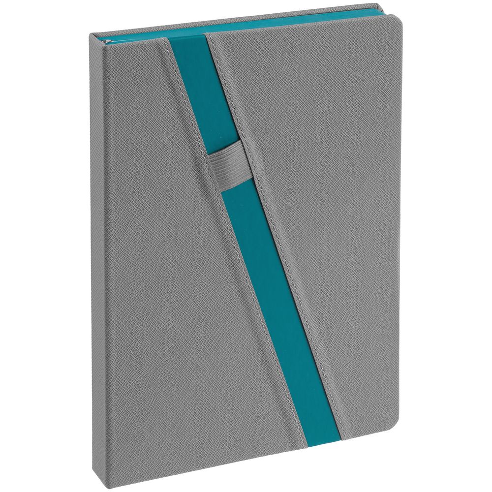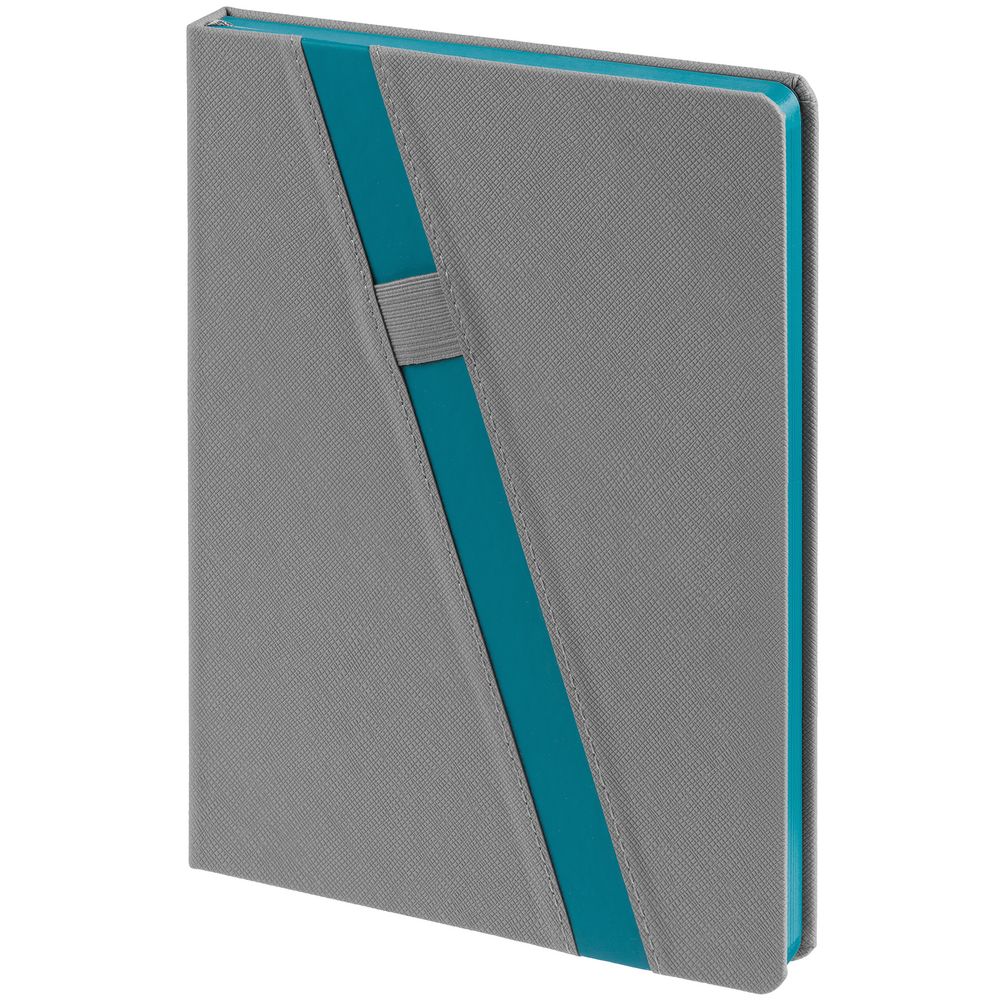Ежедневник с твердой обложкой и тонированным обрезом. Выполнен из материала Nice Touch, серый СС, и Soft Touch, цвет морской волны II, дополнен серым ляссе.