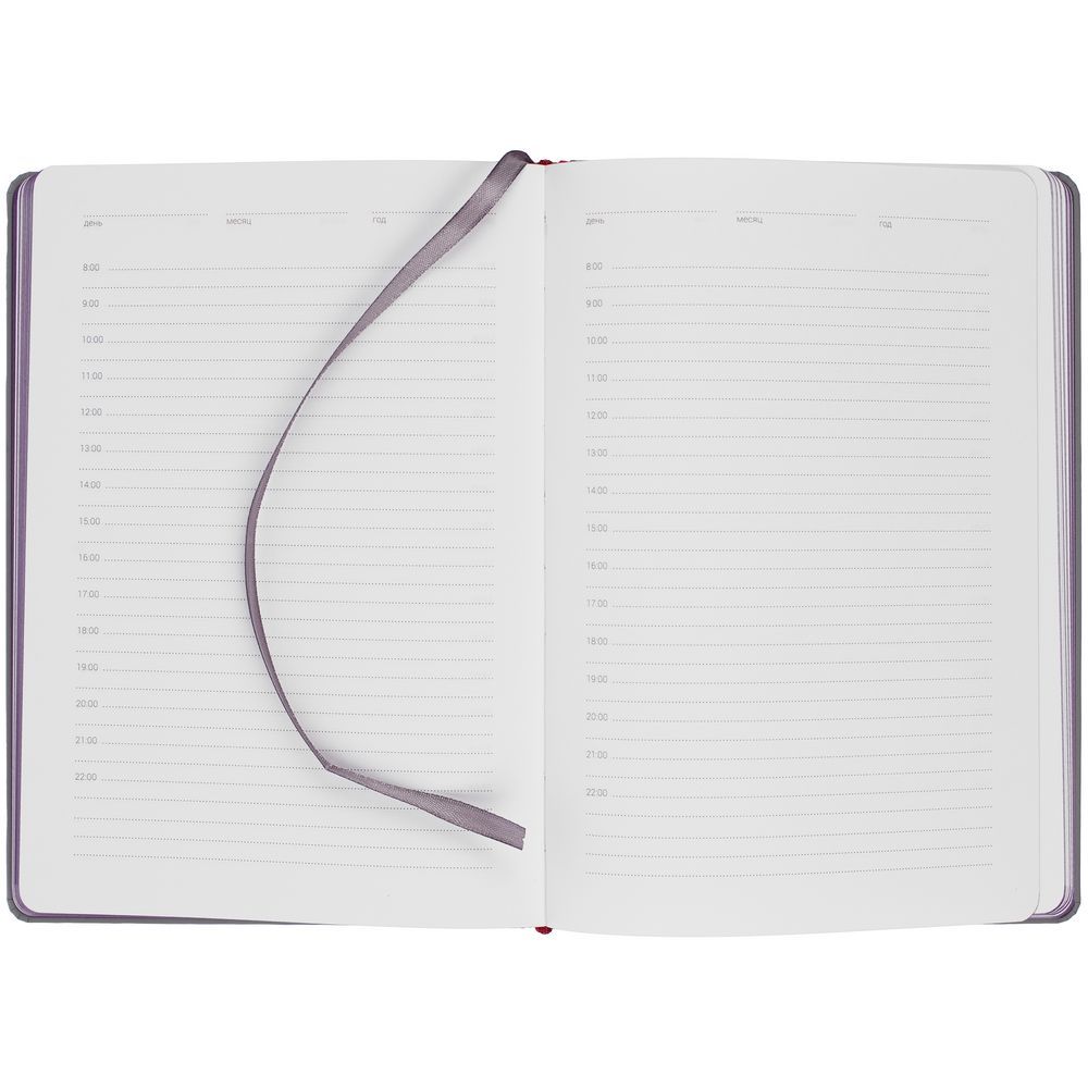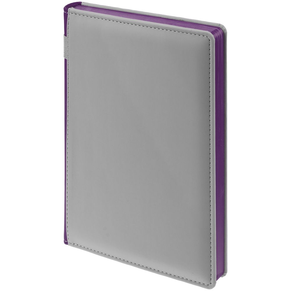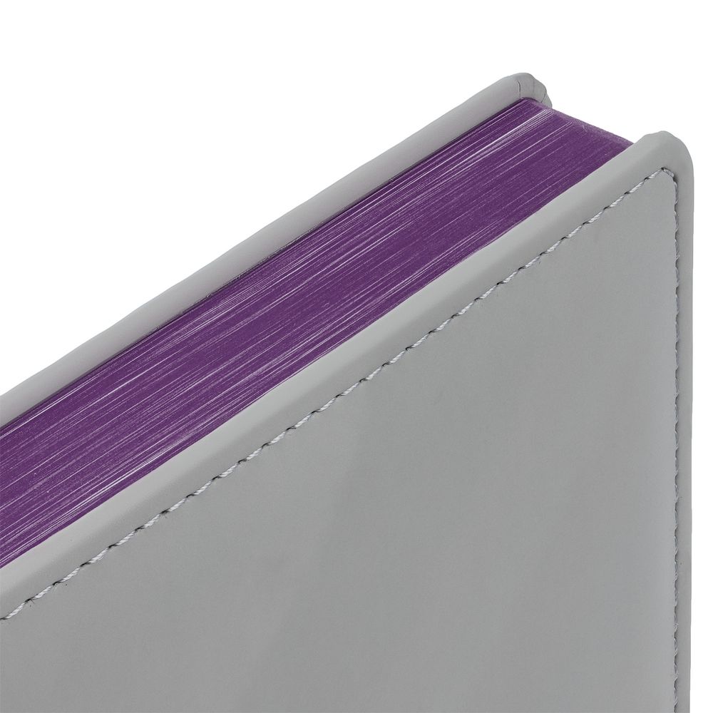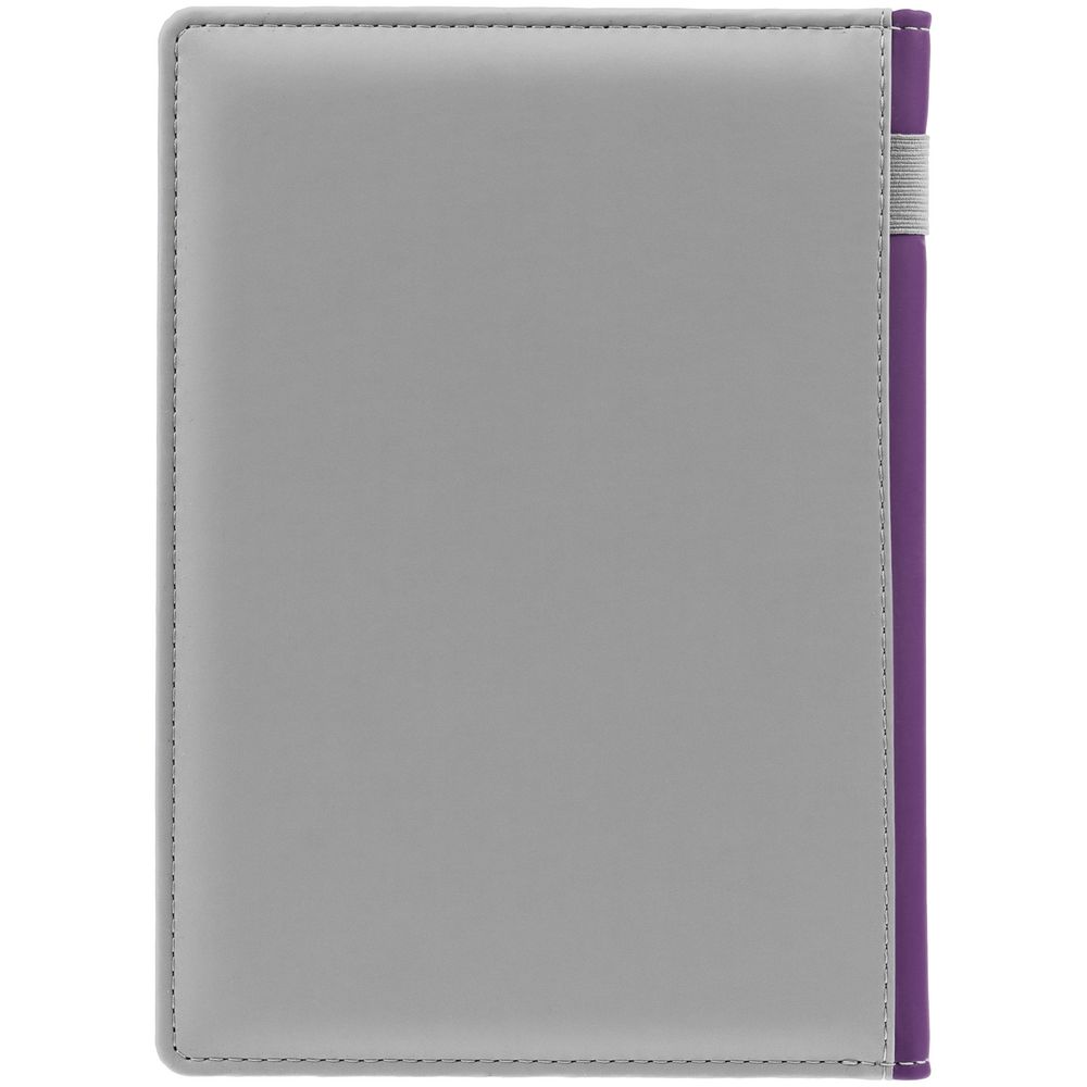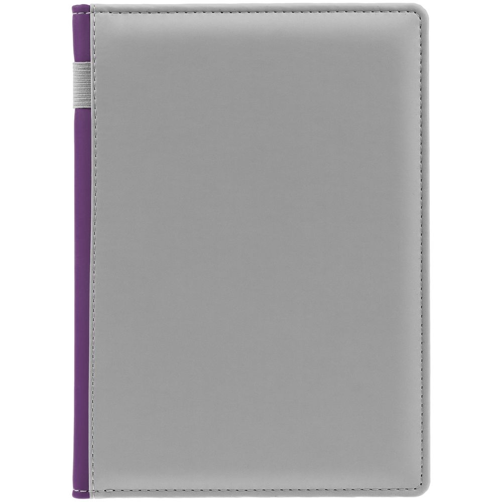 Твердая обложка с поролоном, материал обложки — Soft Touch, серый СС и Soft Touch, фиолетовый UU. На корешке ежедневника находится петля из резинки.
