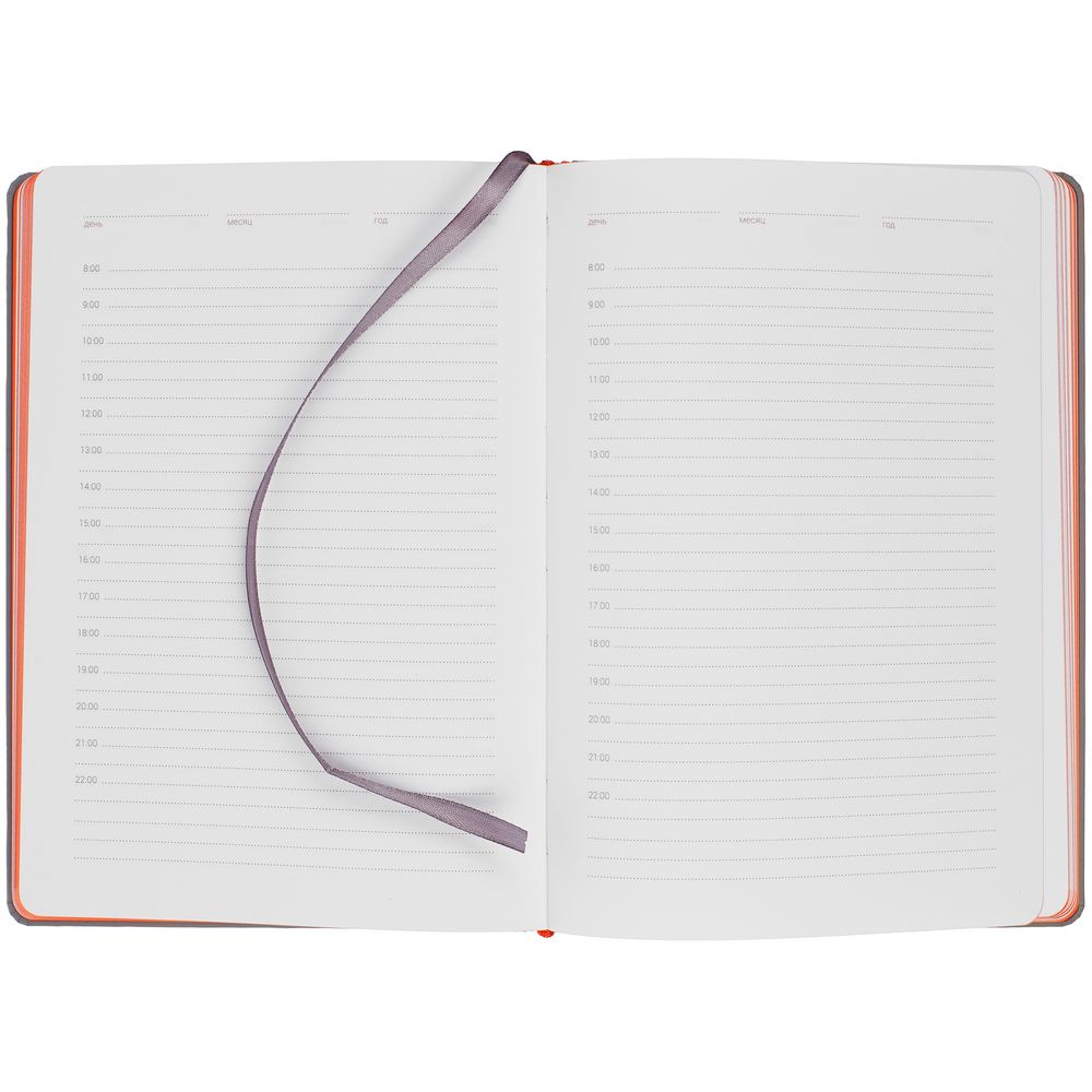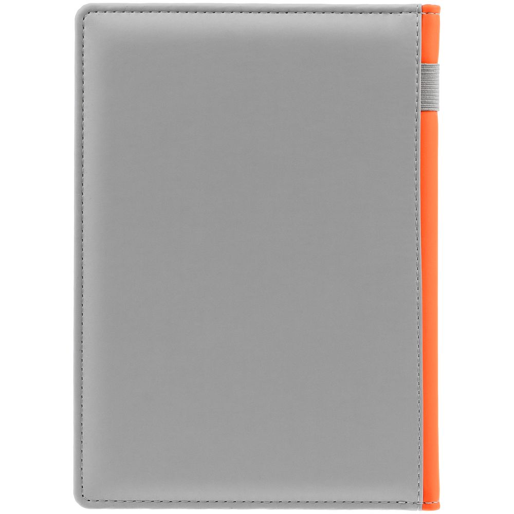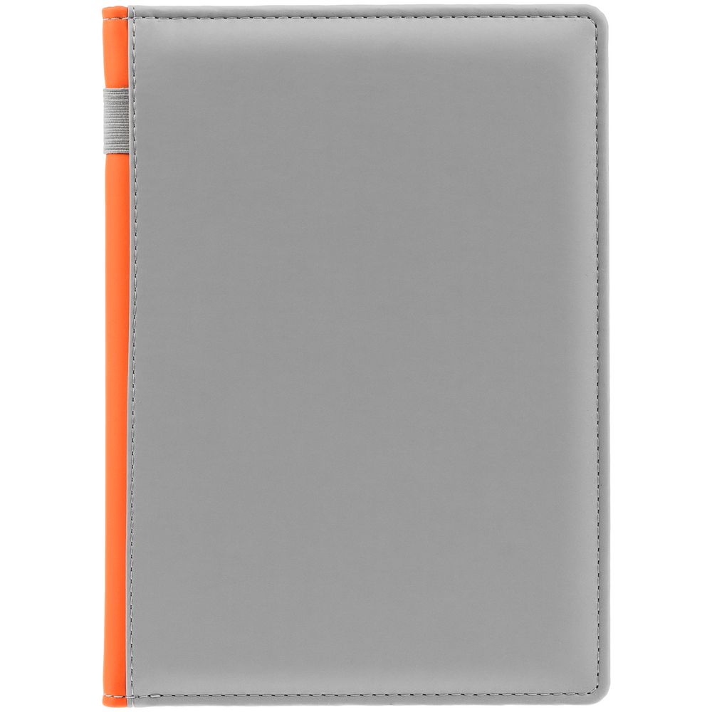 Твердая обложка с поролоном, материал обложки — Soft Touch, серый СС и Soft Touch, оранжевый ОО. На корешке ежедневника находится петля из резинки.