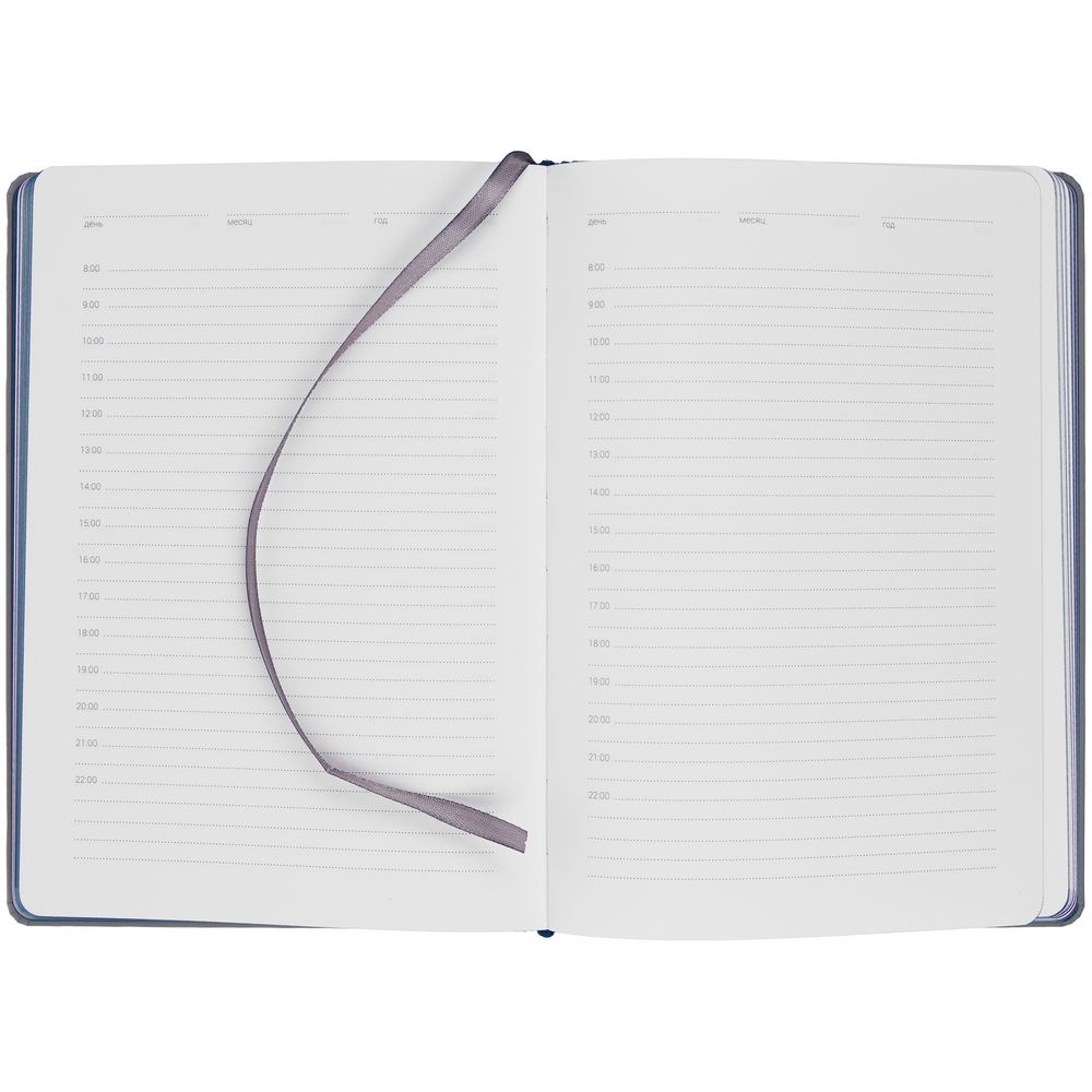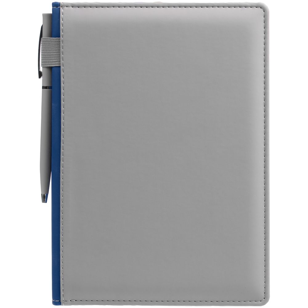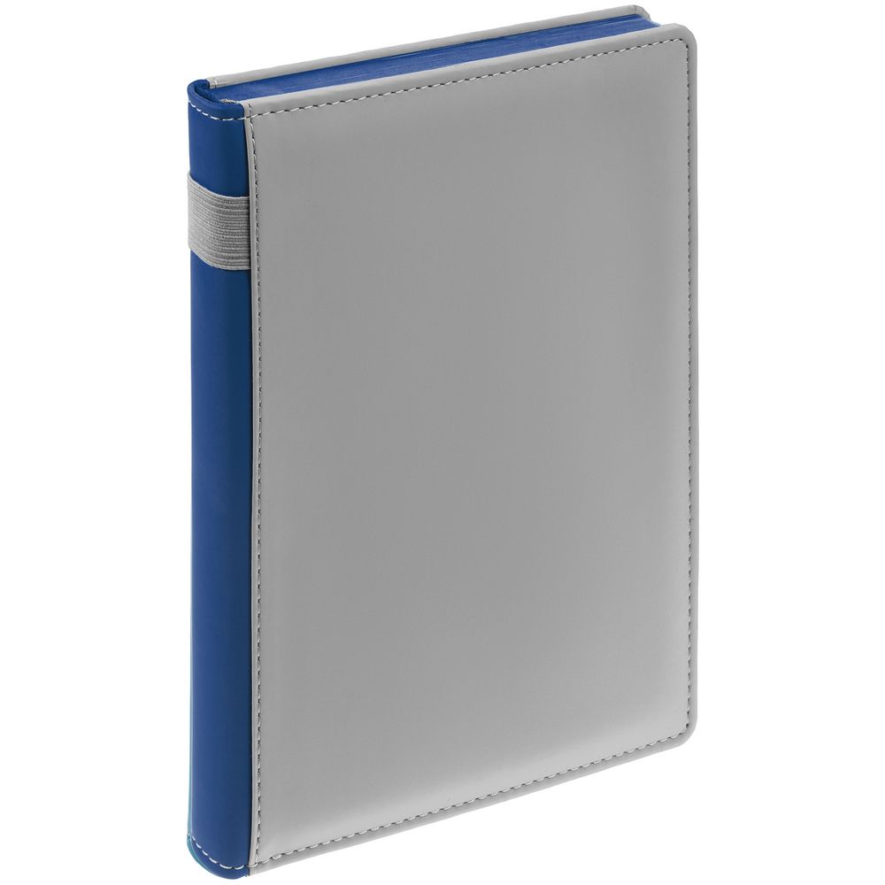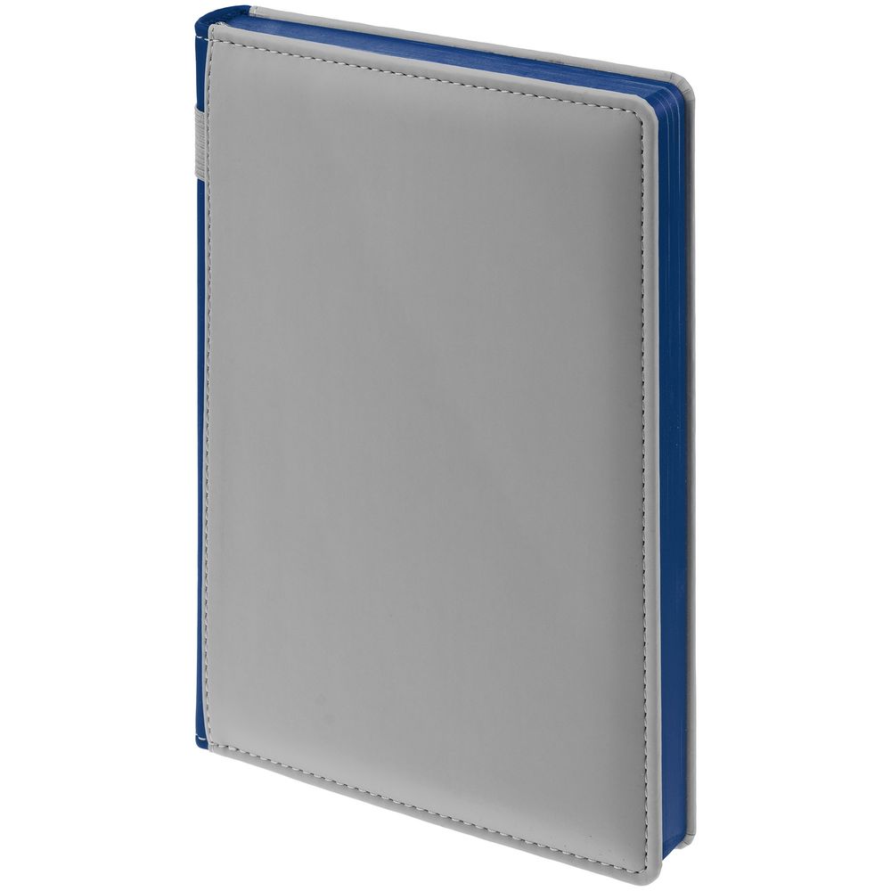 Твердая обложка с поролоном, материал обложки — Soft Touch, серый СС и Soft Touch Ultra, синий НН. На корешке ежедневника находится петля из резинки.