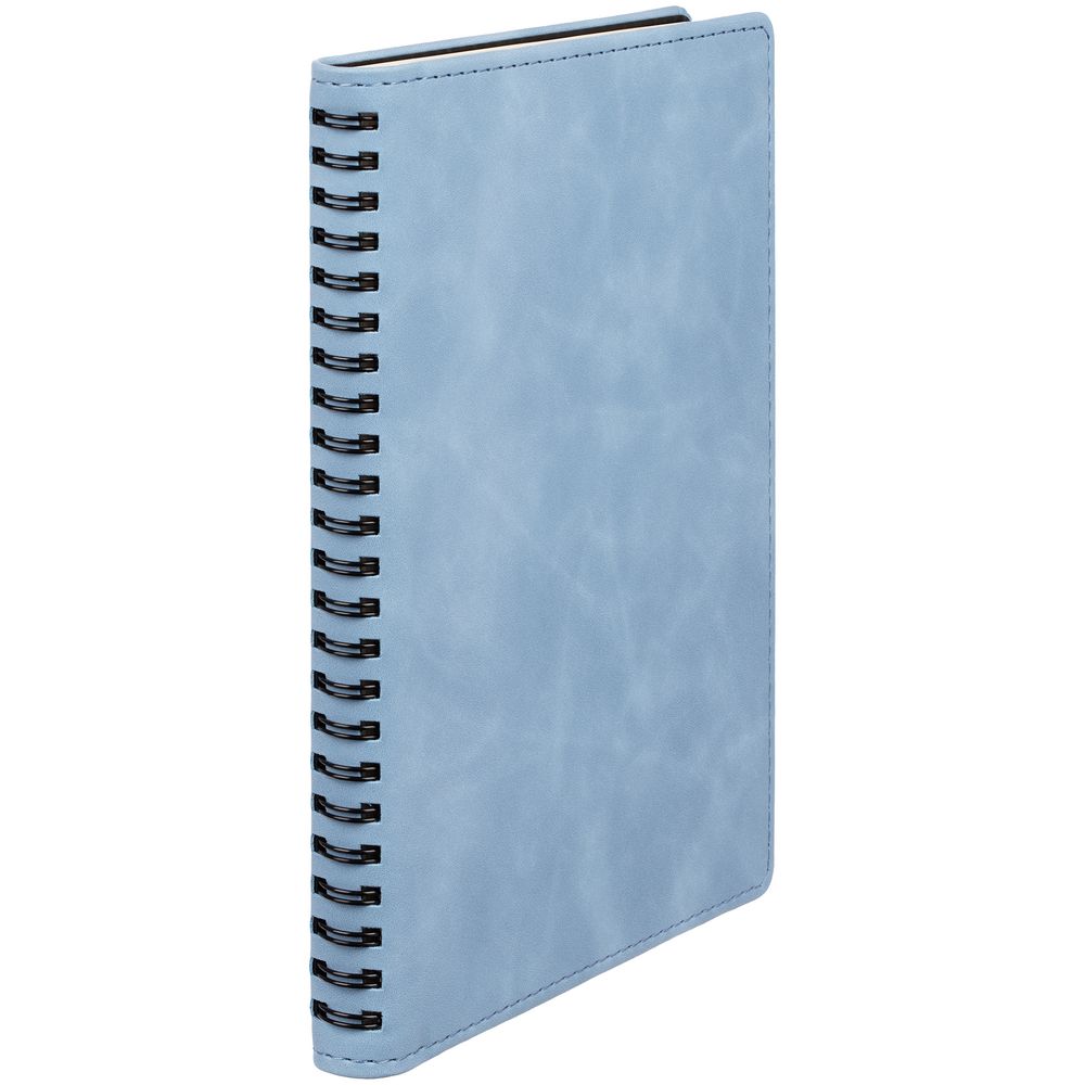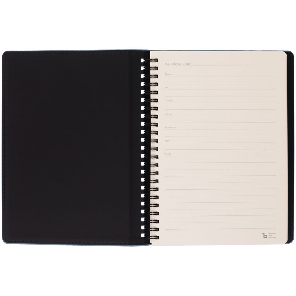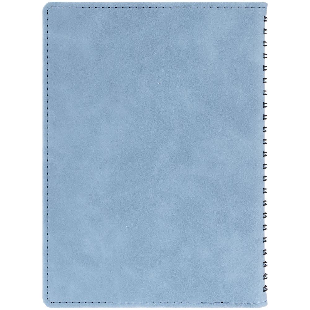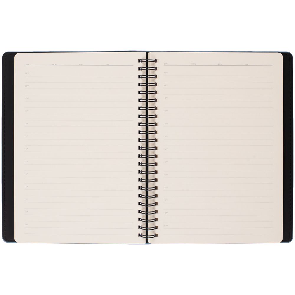 Ежедневник с блоком на пружине в твердой обложке, выполнен из материалов Nubuk Touch, голубой JJ и Soft Touch, черный AA.