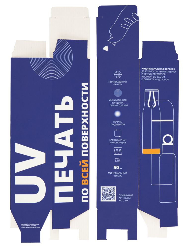 Уникальная возможность оперативно получить коробку с полной запечаткой при небольшом тираже. Коробка изготавливается из микрогофрокартона с белым лайнером на лицевой и изнаночной сторонах.