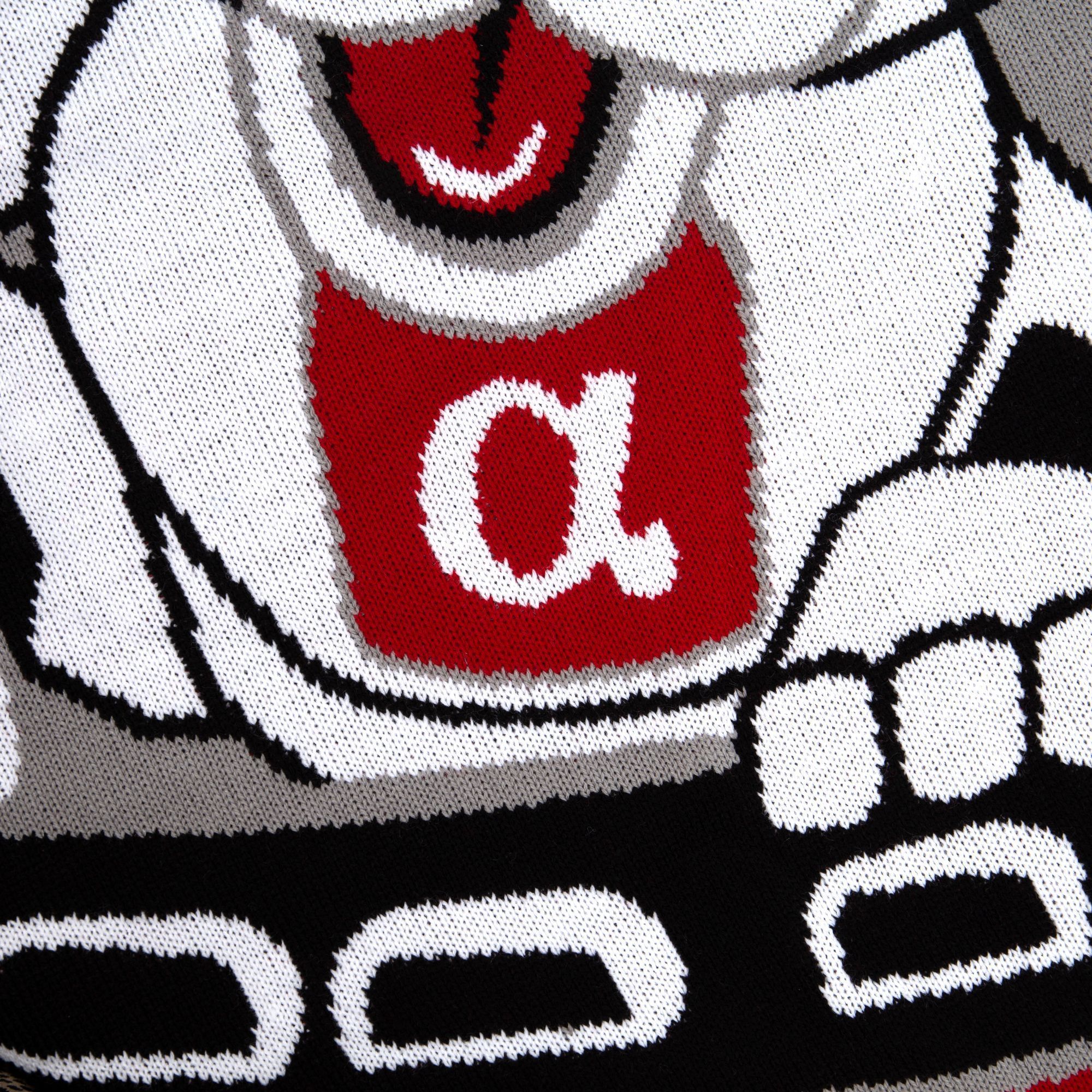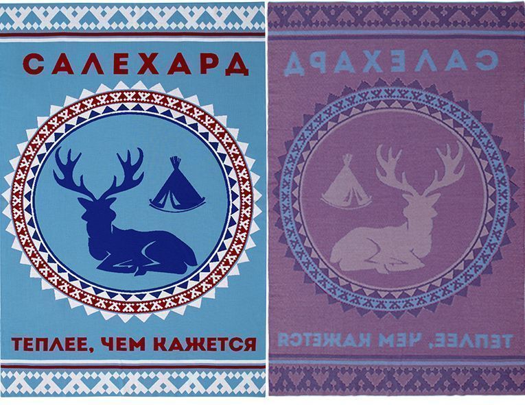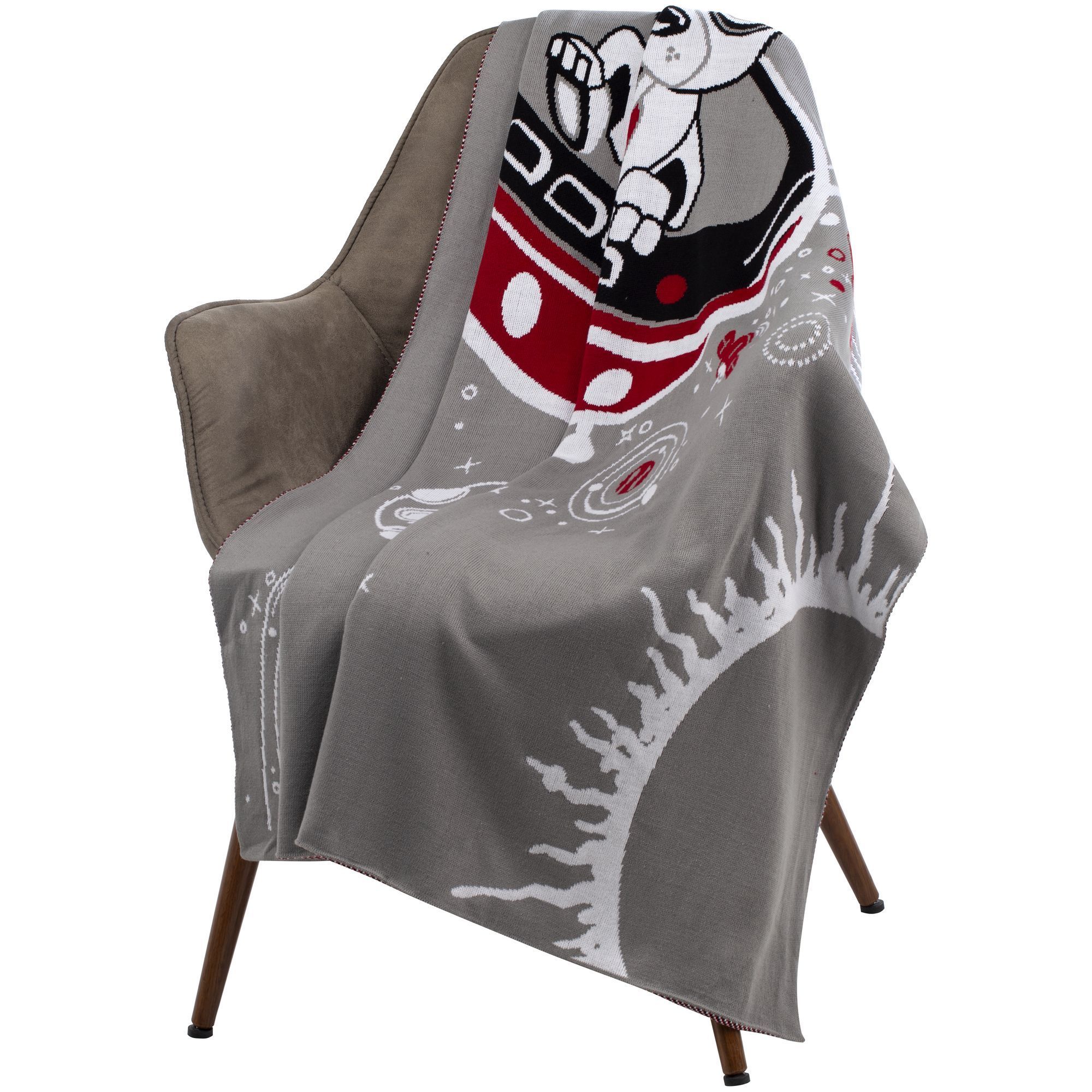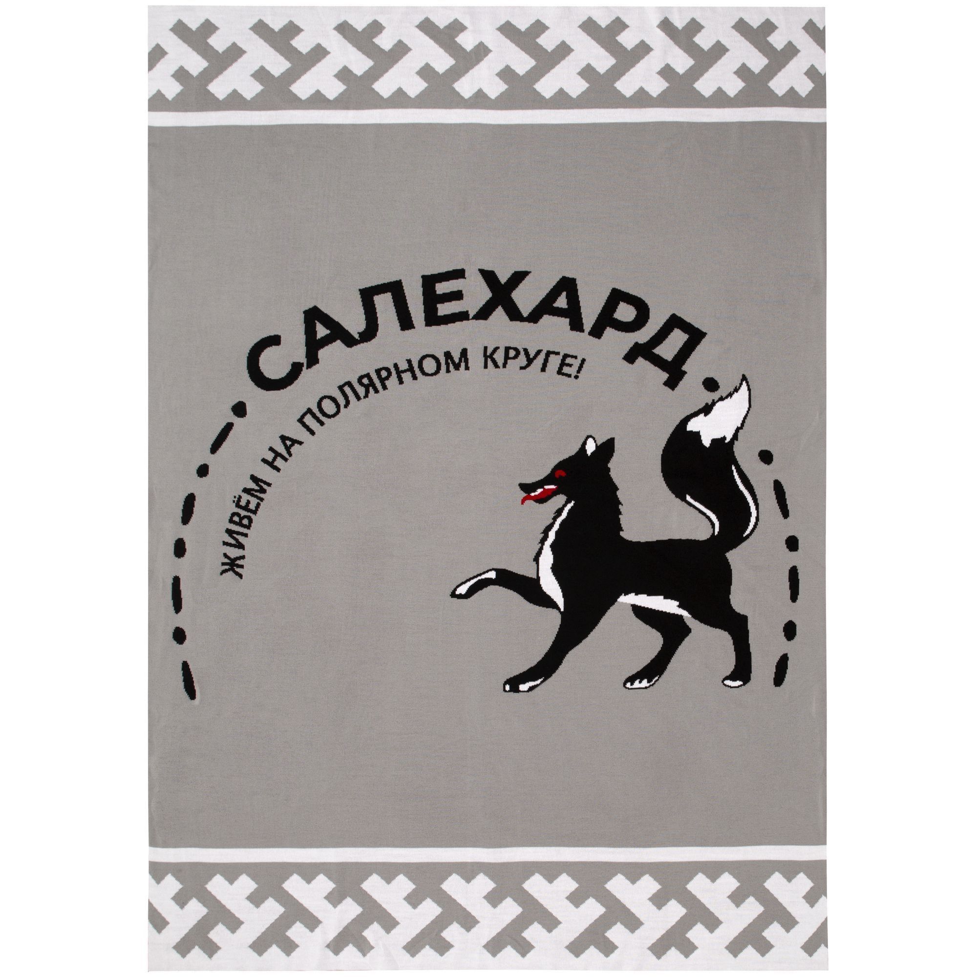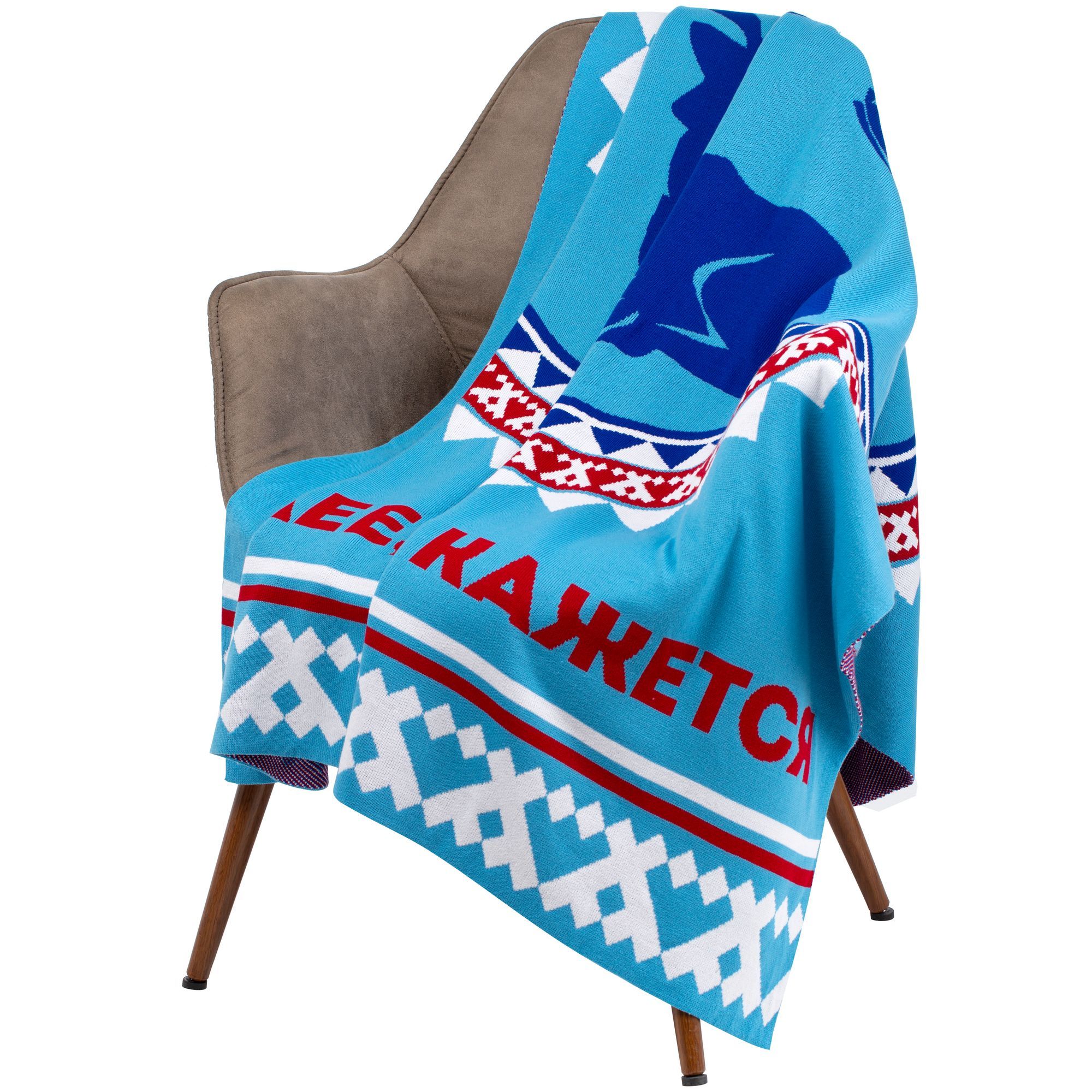 Плед с вывязанным логотипом и индивидуальным рисунком в фирменной цветовой гамме.