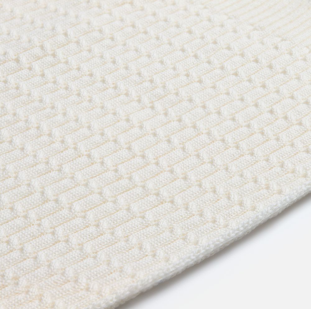 Модель: однотонный плед с фактурной вязкой, которая позволяет сделать его воздушным и объемным. Чередуя различные типы петель на гладком полотне, можно вывязать любую графику — логотип, текст, товарный знак.