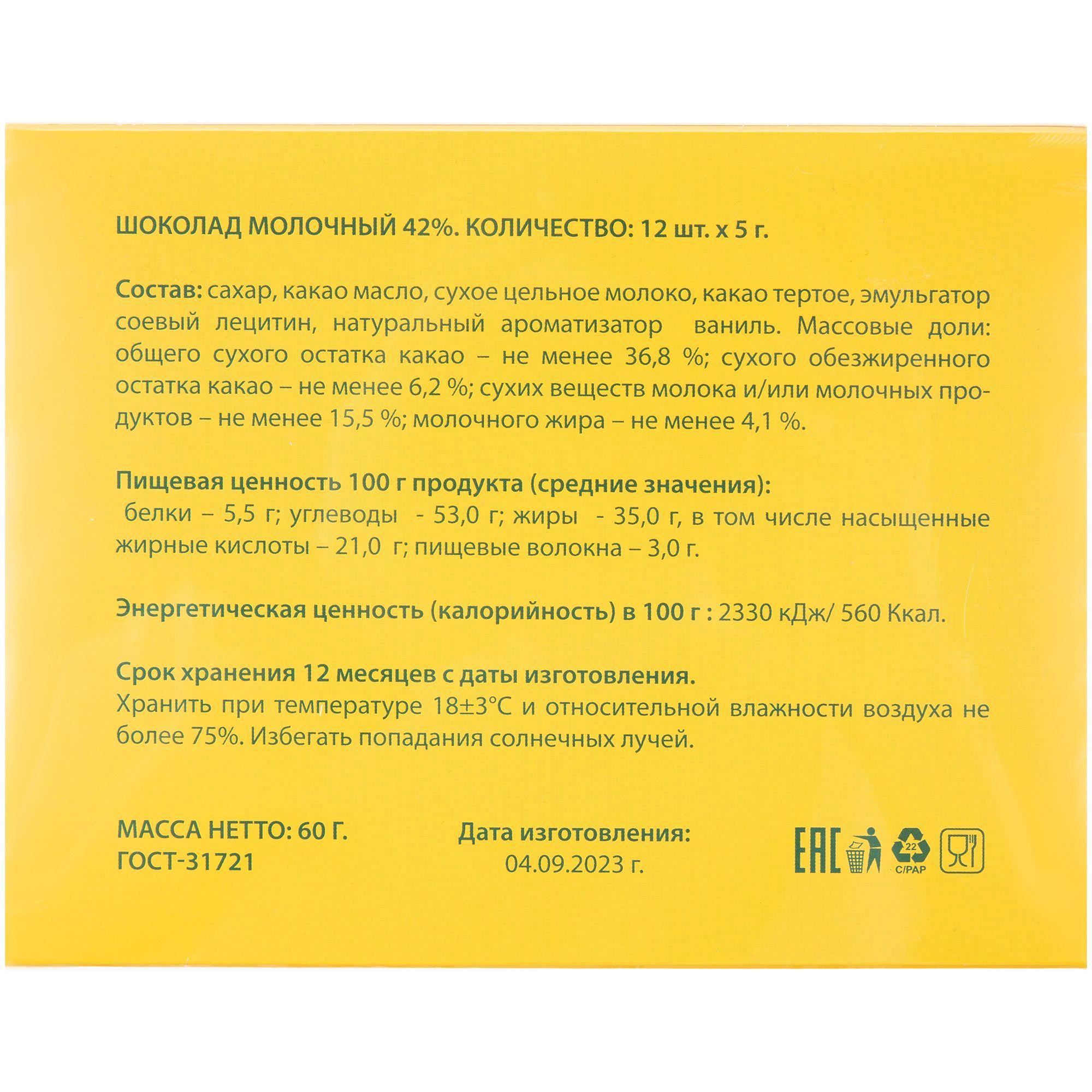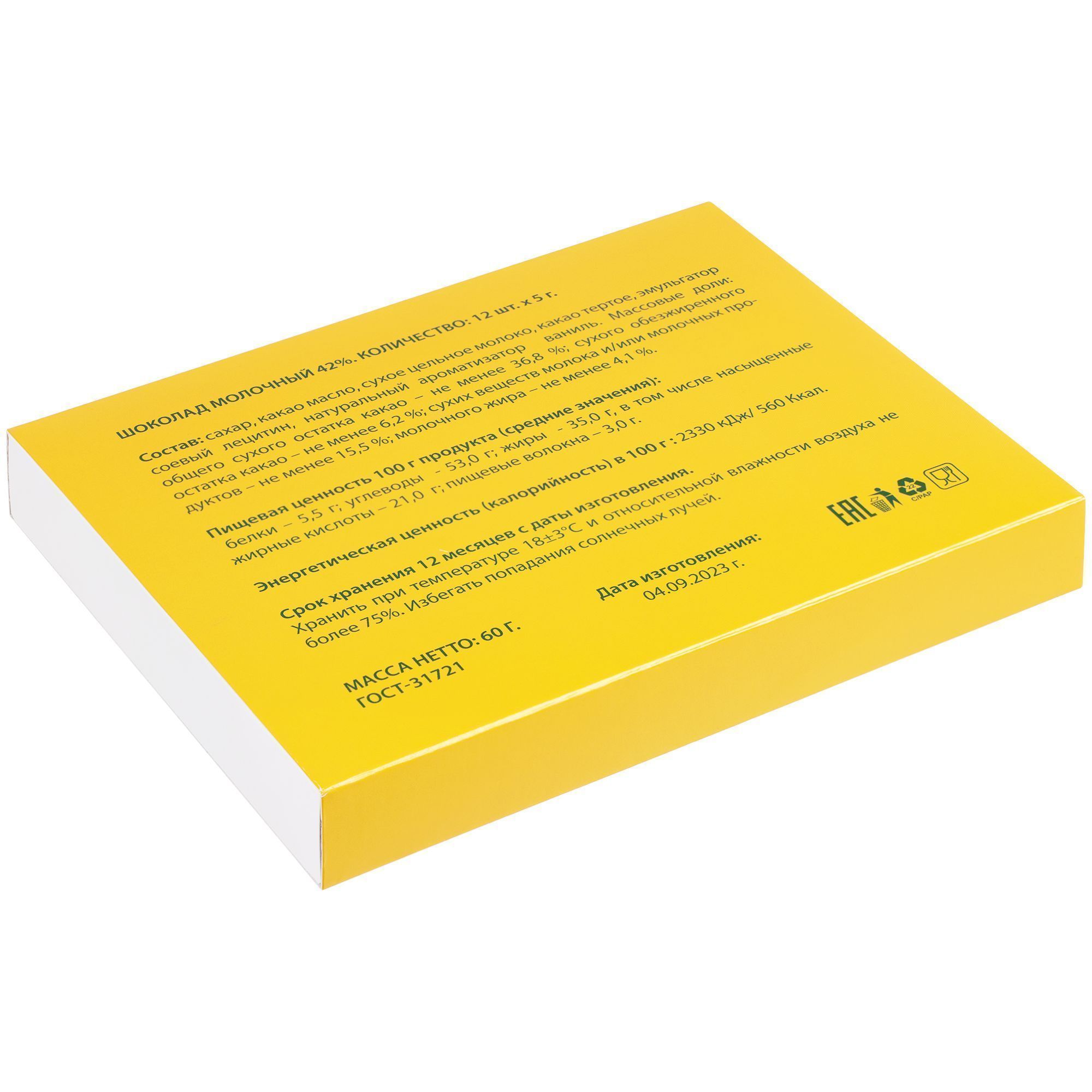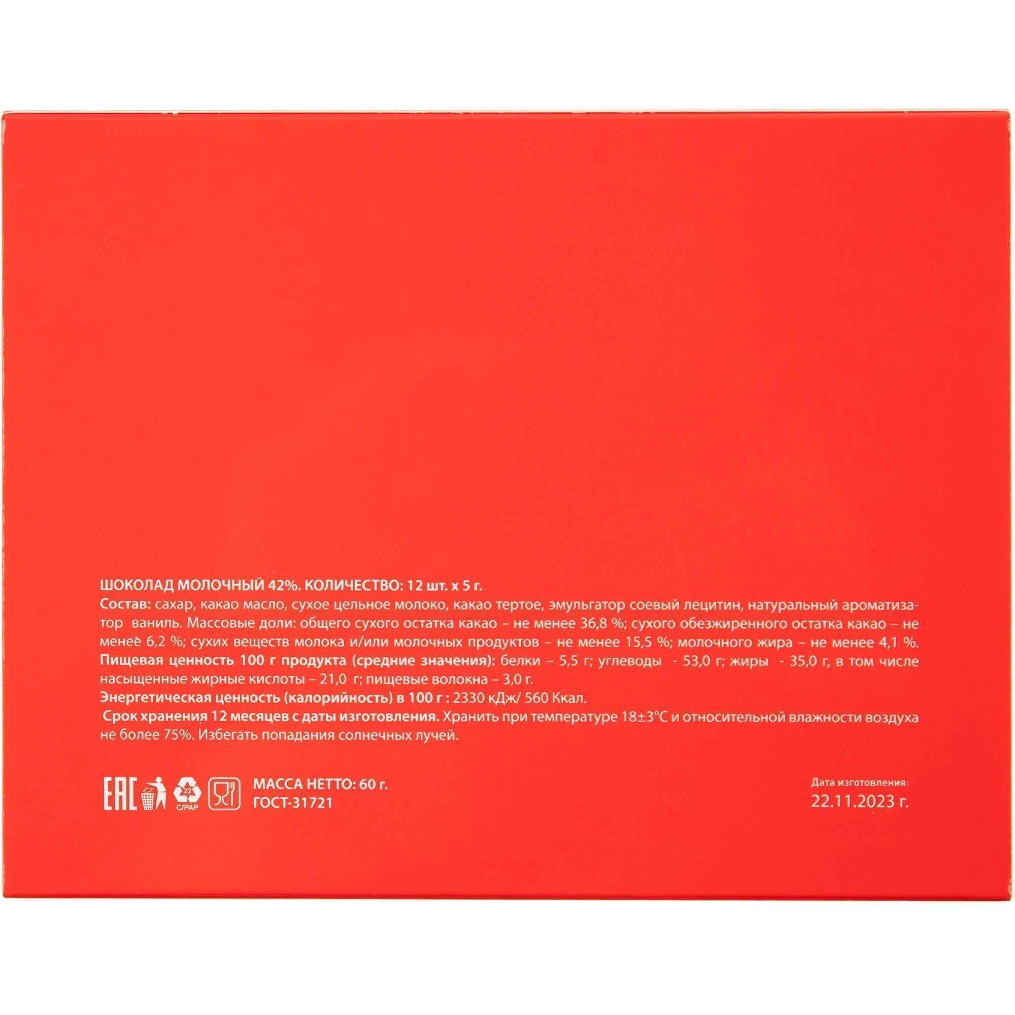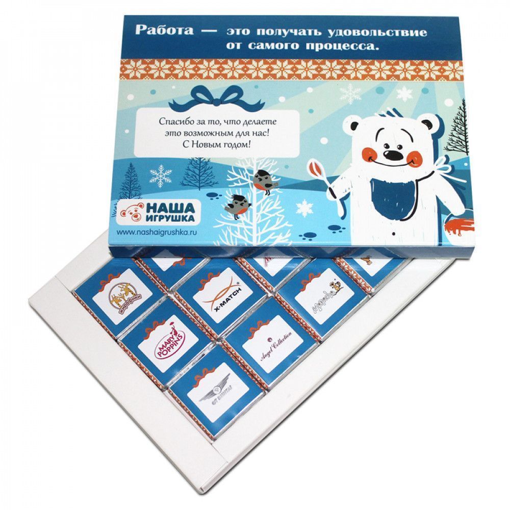- Обертка с полноцветной печатью на каждой плитке шоколада.