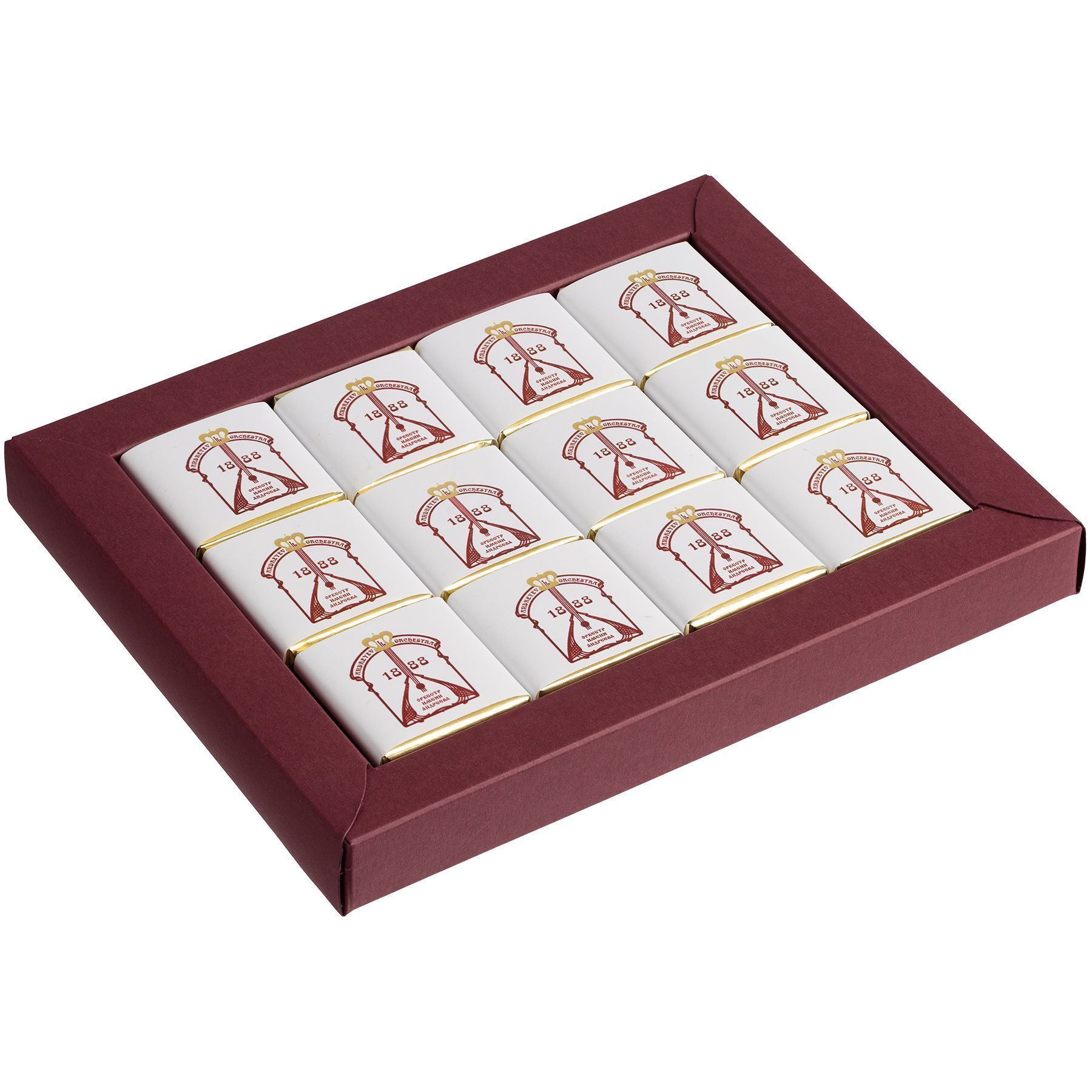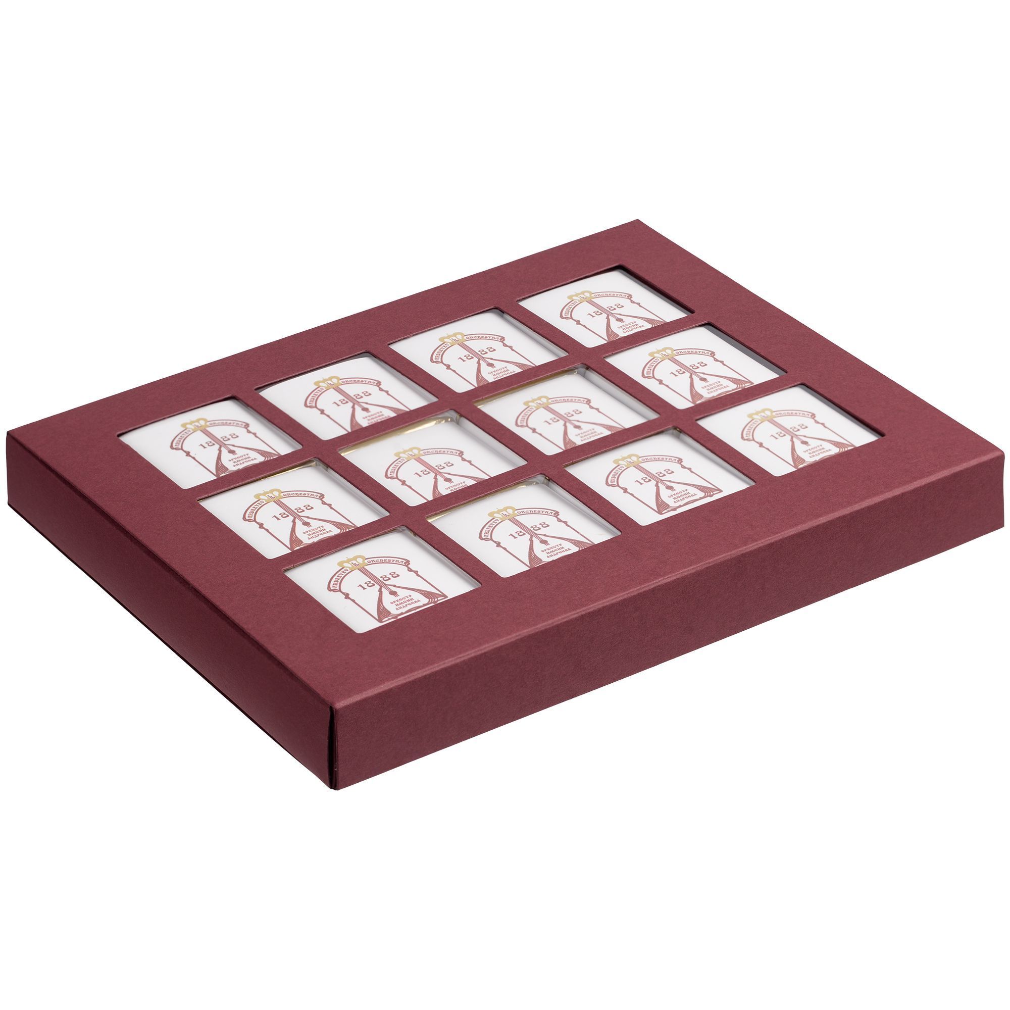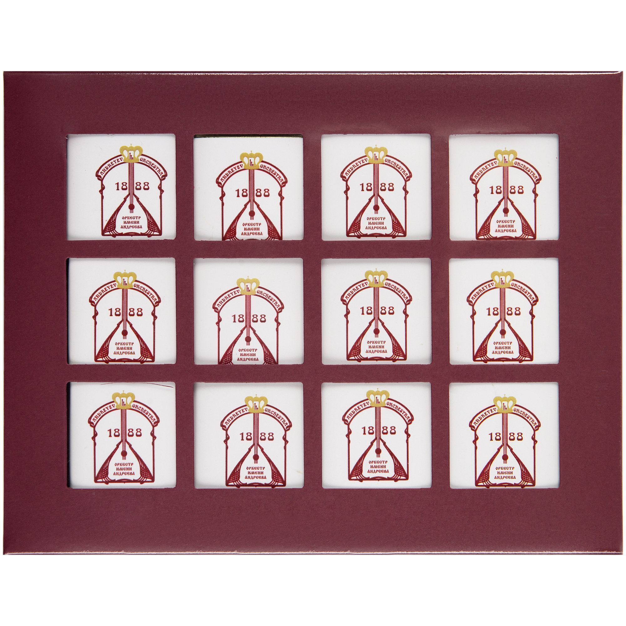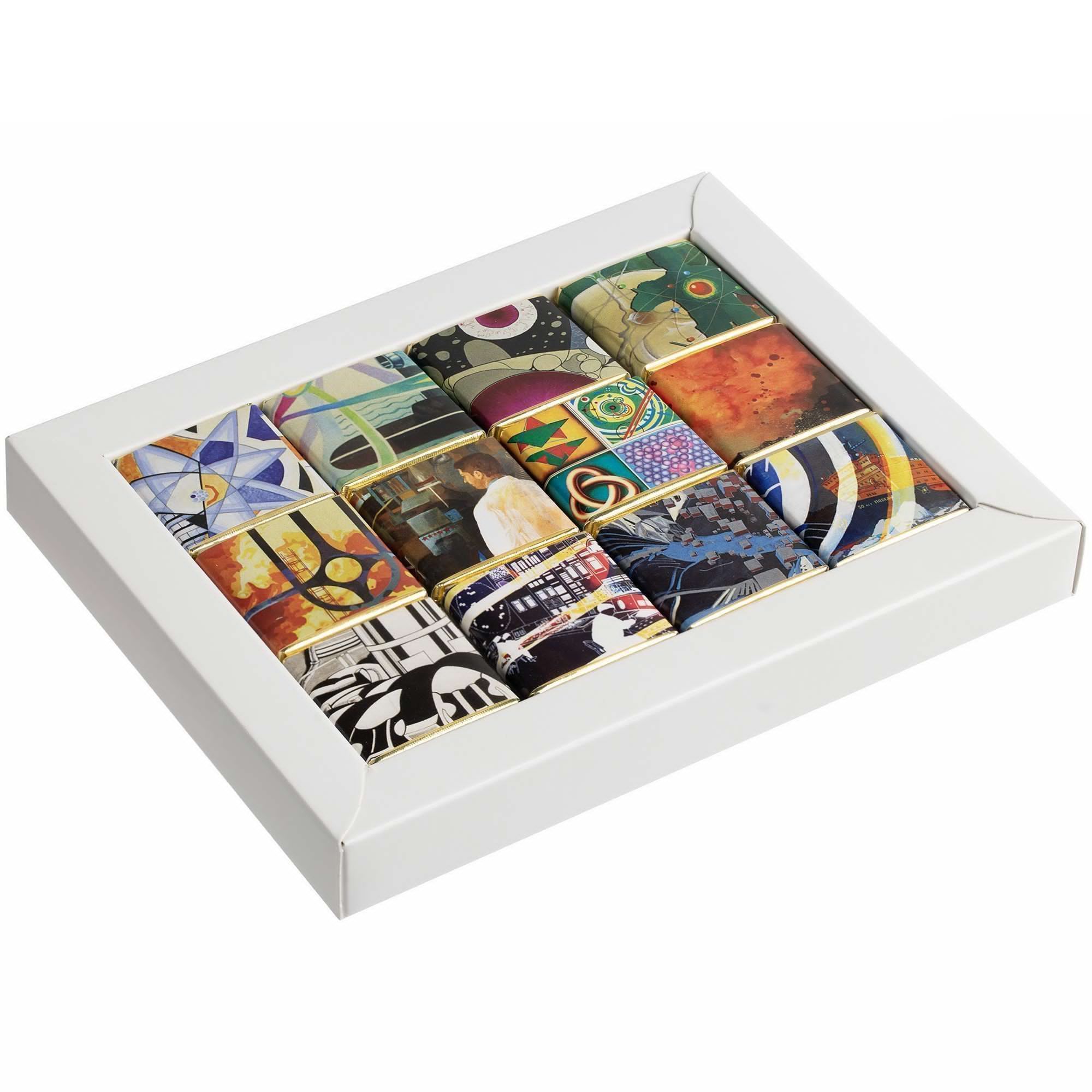 Набор из 12 плиток шоколада. Упакован в коробку с прорубными окошками из прозрачного пластика.