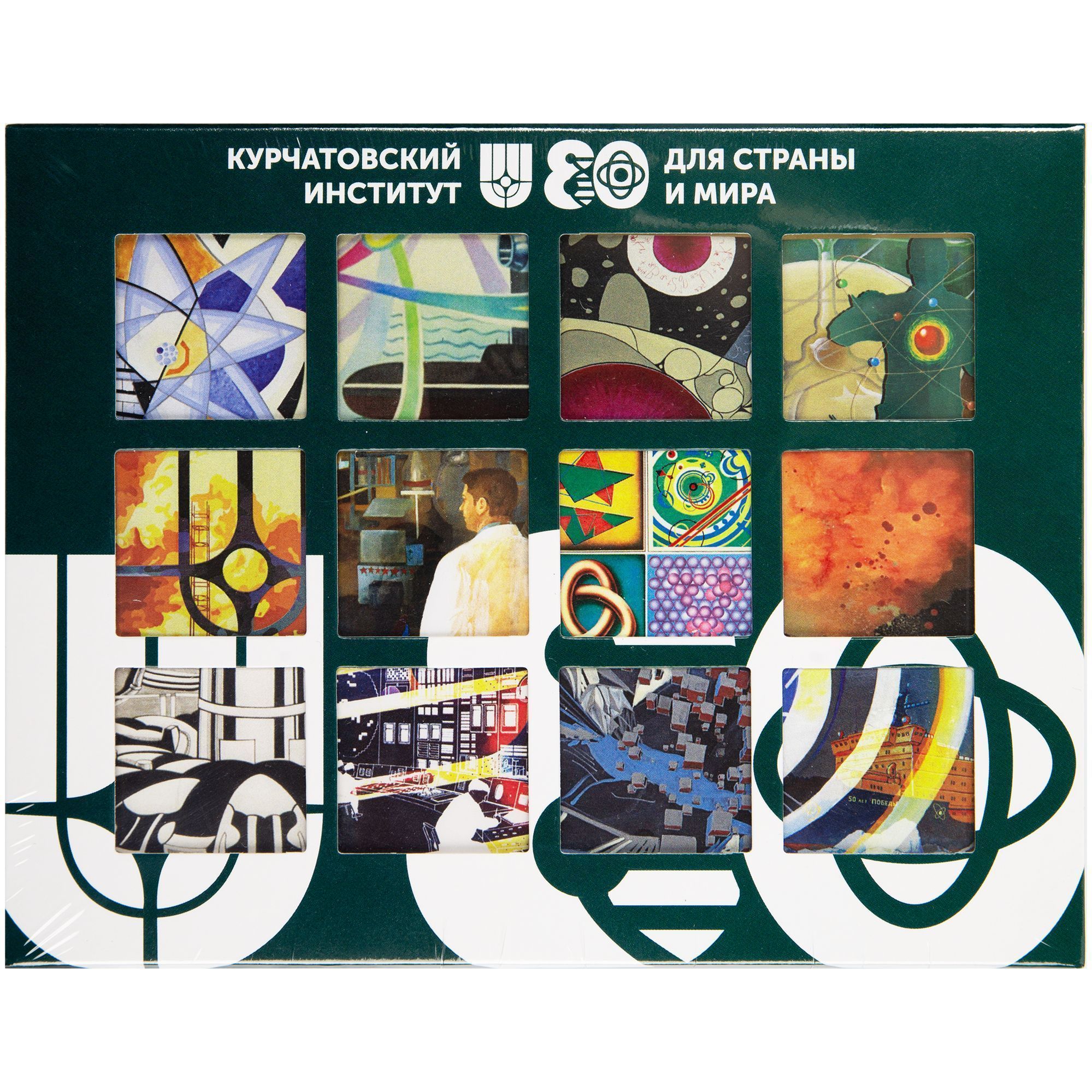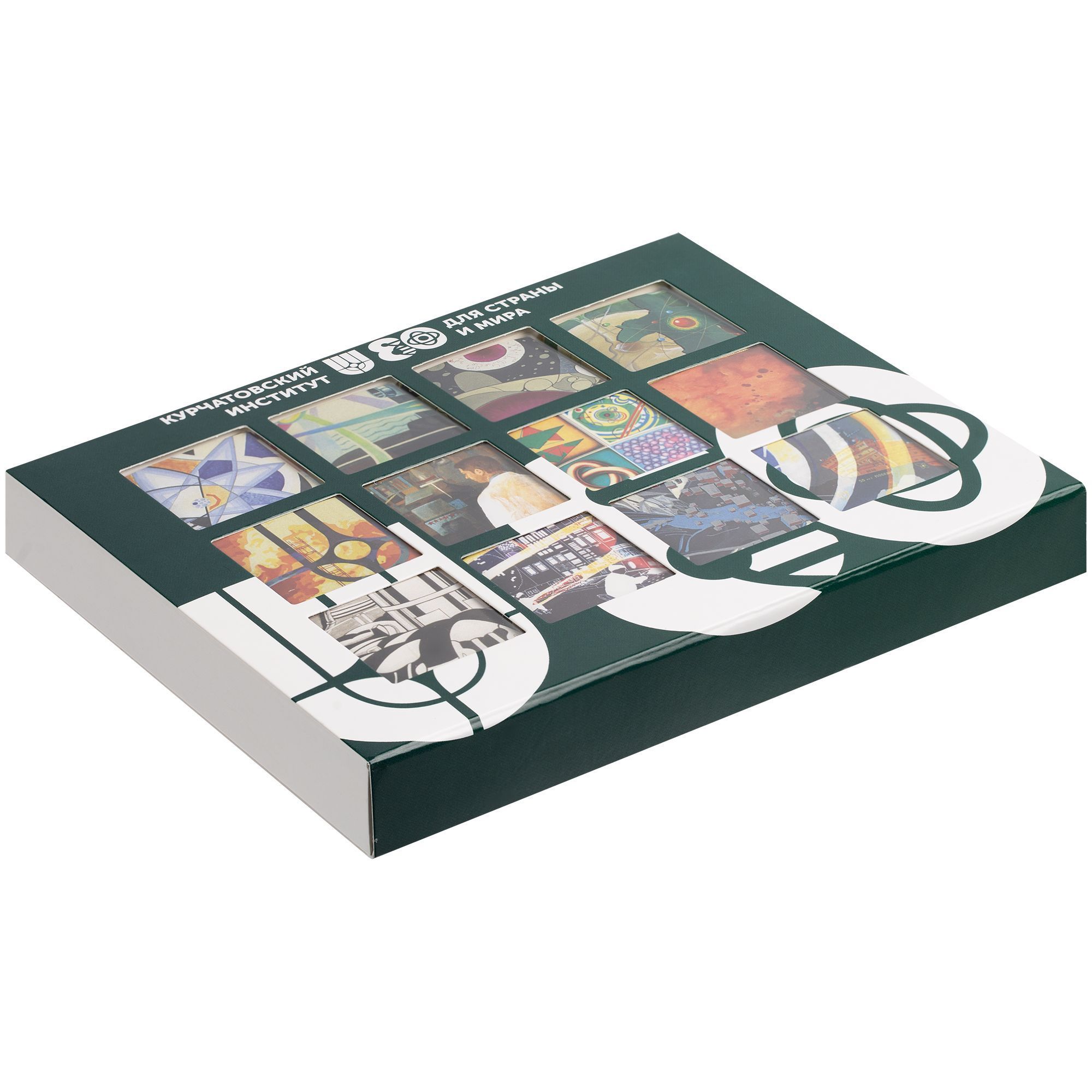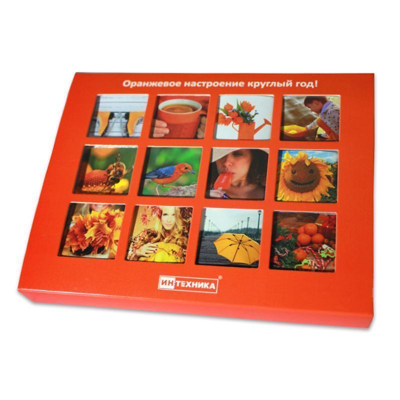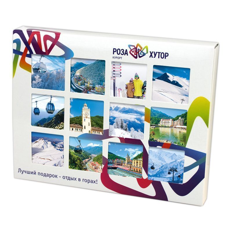Набор из 12 плиток шоколада. Упакован в коробку с прорубными окошками из прозрачного пластика.