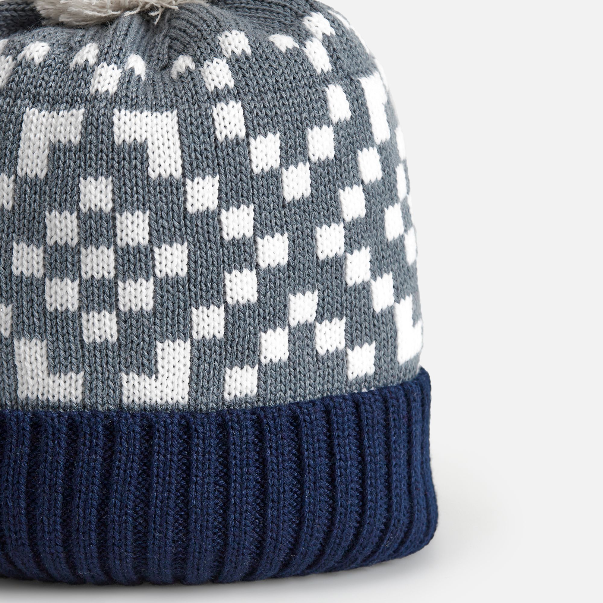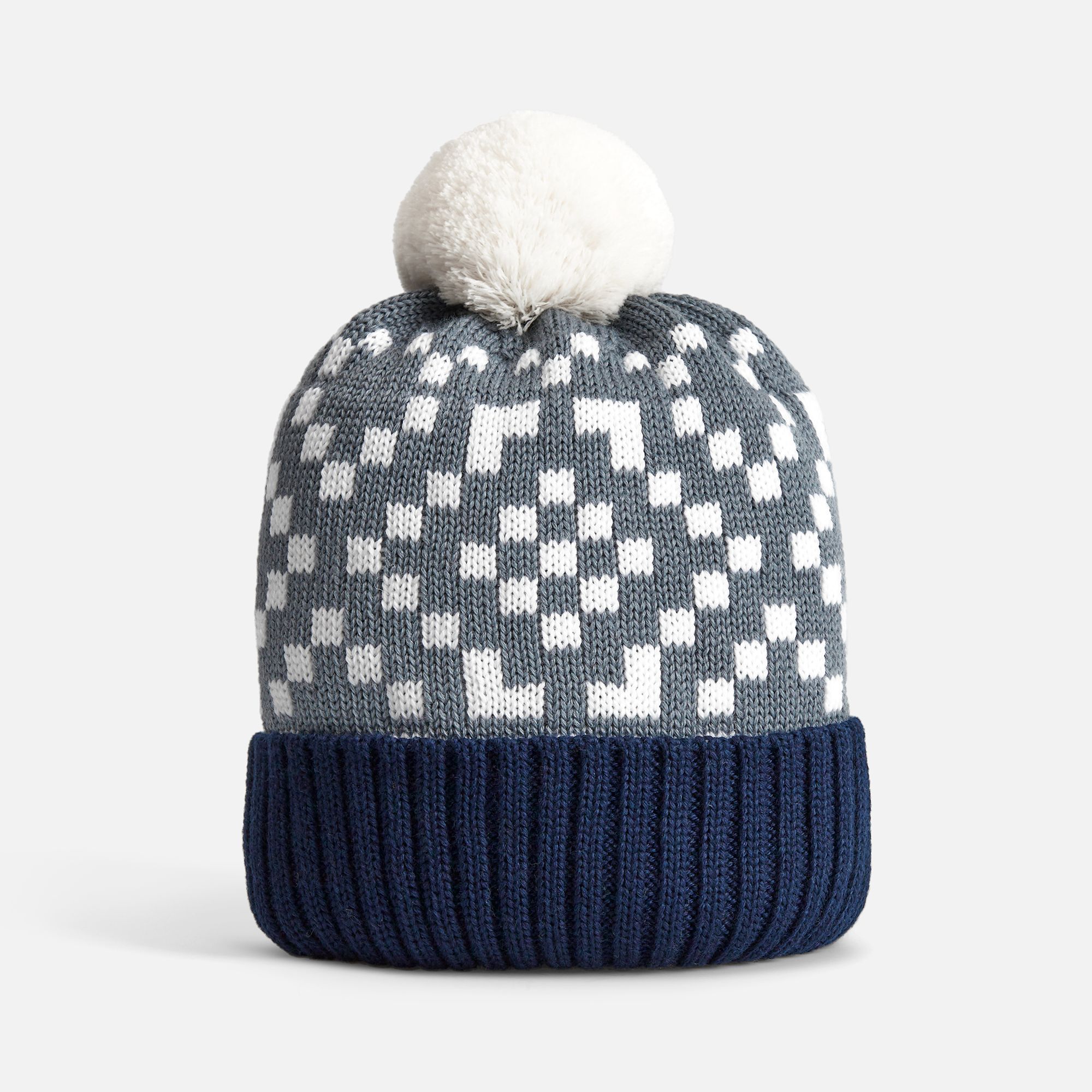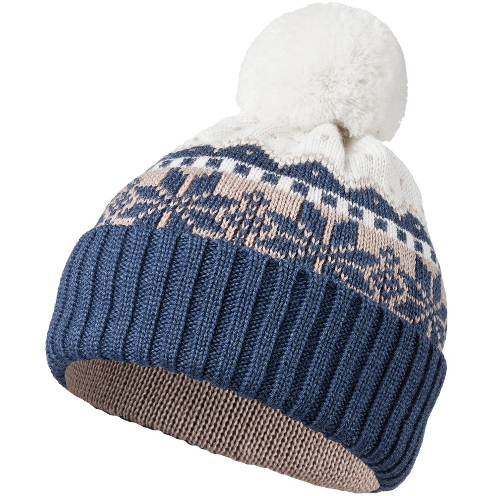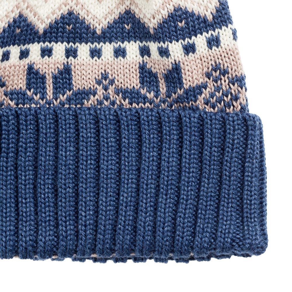 Модель: шапка с жаккардовым узором в 2-3 цвета и отворотом в 1 цвет, помпон 8 см, крупная петля. Шапка некроеная, с макушкой на стяге, которая всегда будет однотонной. Узор максимально простой и графичный, без сложных мелких деталей.