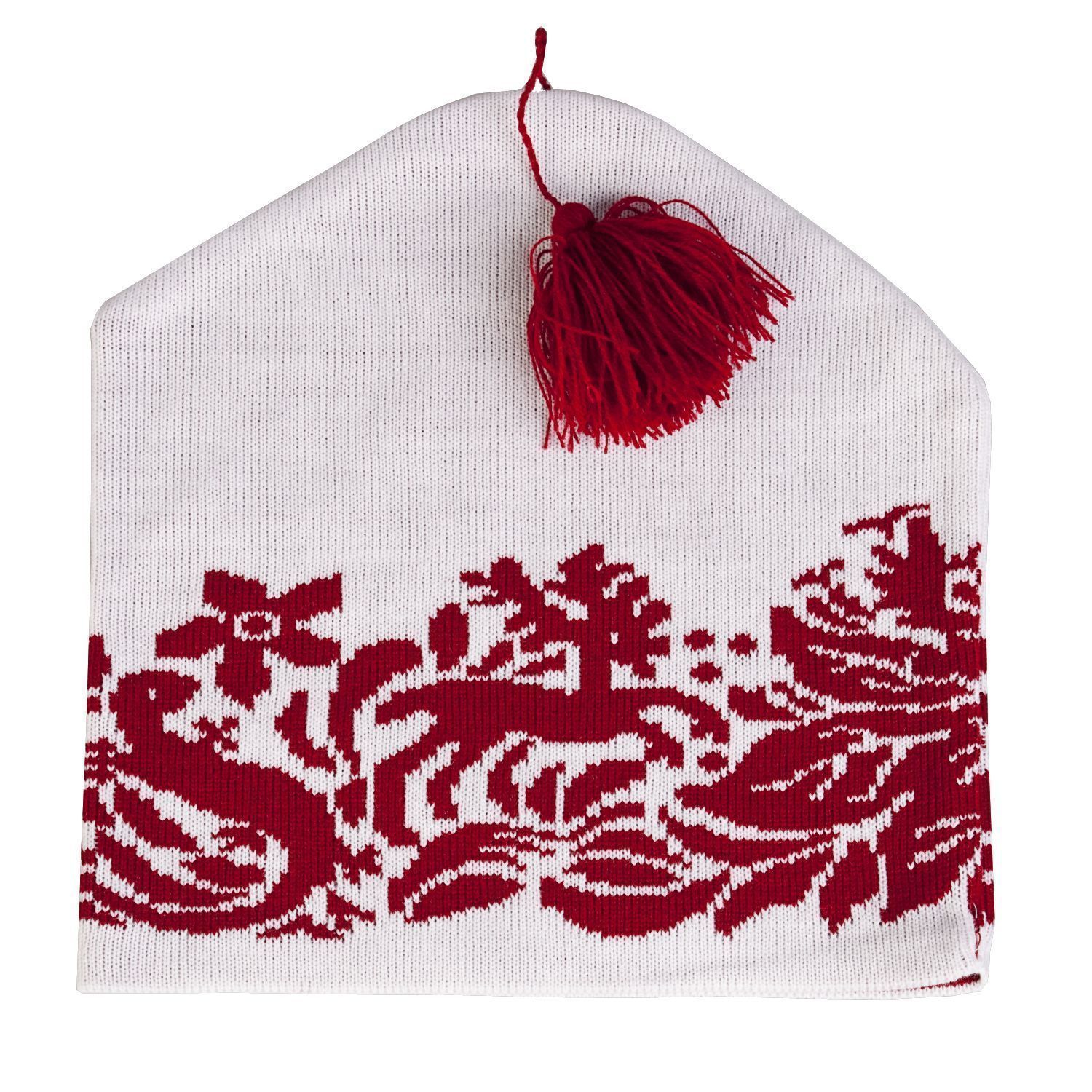Шапка-петушок с вывязанным логотипом и индивидуальным рисунком в фирменной цветовой гамме.