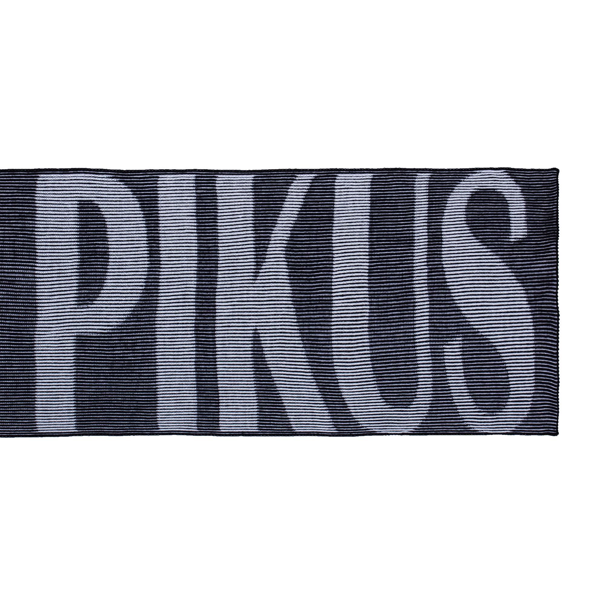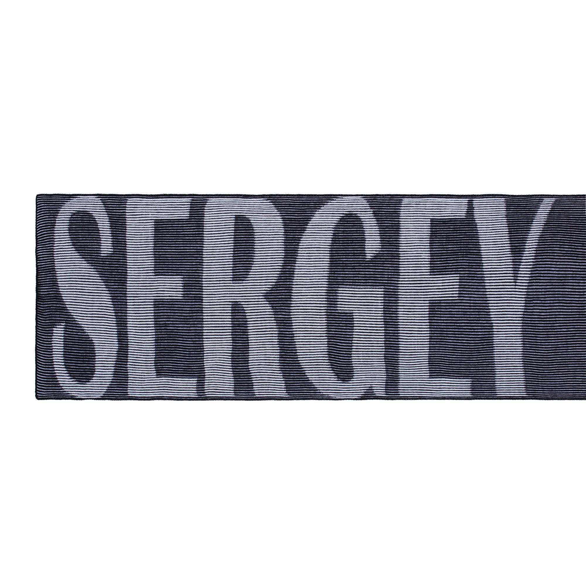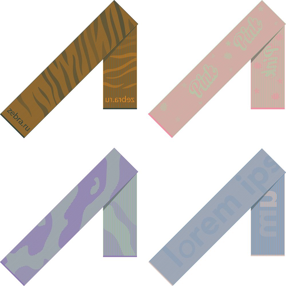 Модель: шарф с жаккардовым узором, рисунчатый эффект получается за счет смены петель. Вязание возможно только в 2 цвета: рисунок читается с обеих сторон шарфа, но на обратной стороне происходит инверсия цвета — текст оказывается в зеркальном отражении. Модель не имеет швов, вяжется единым полотном. Имеет лицевую и изнаночную сторону.