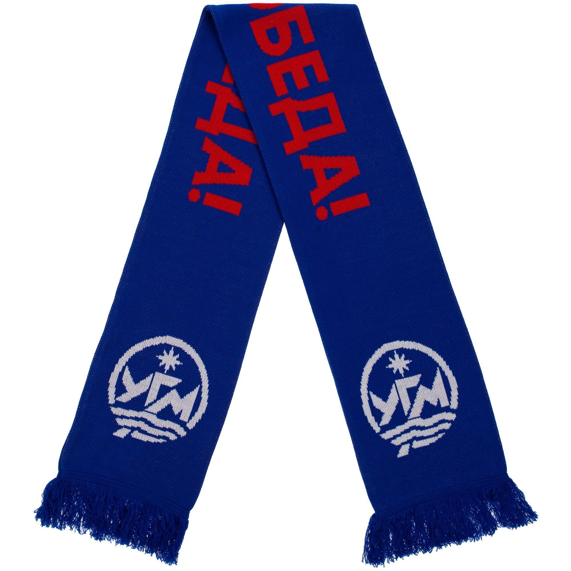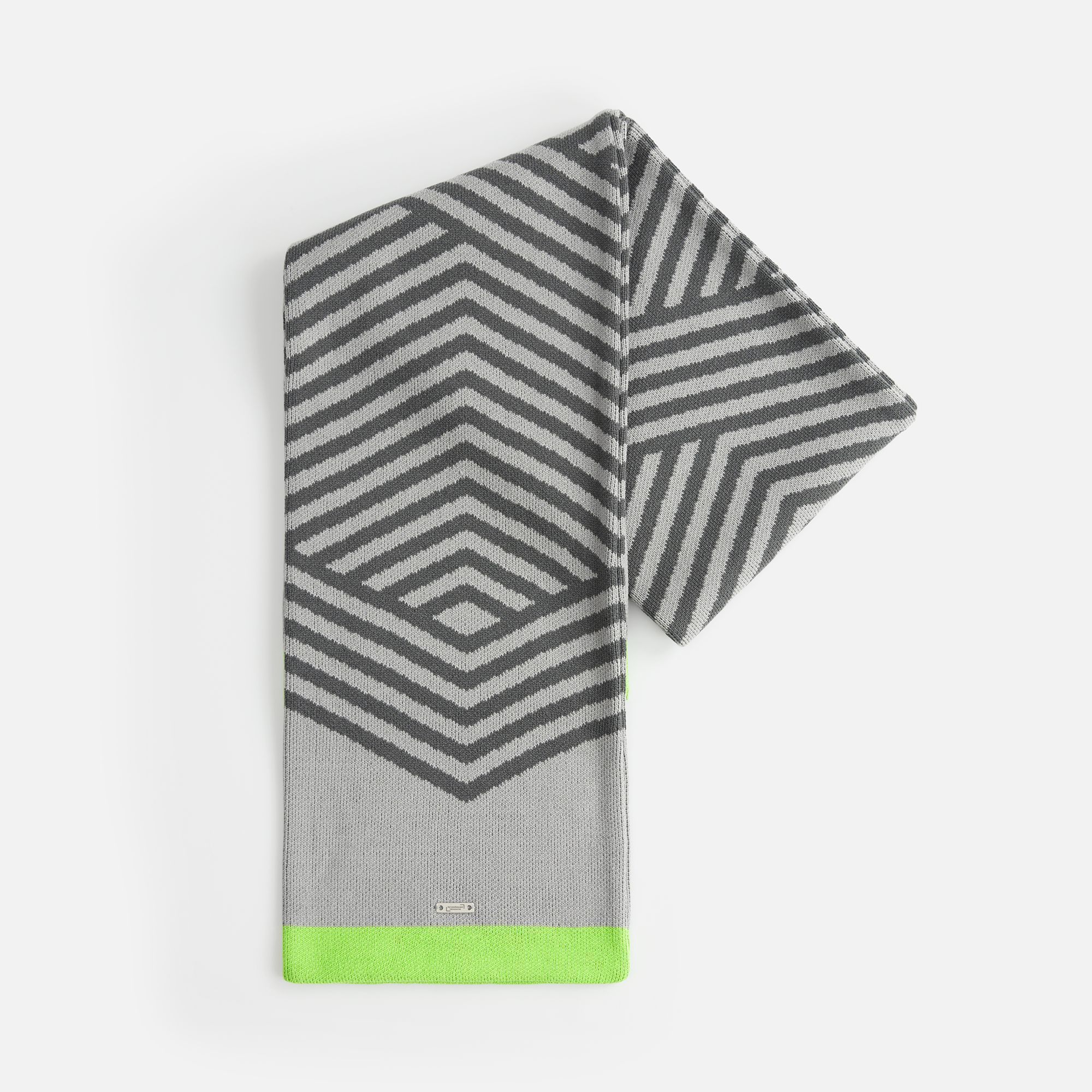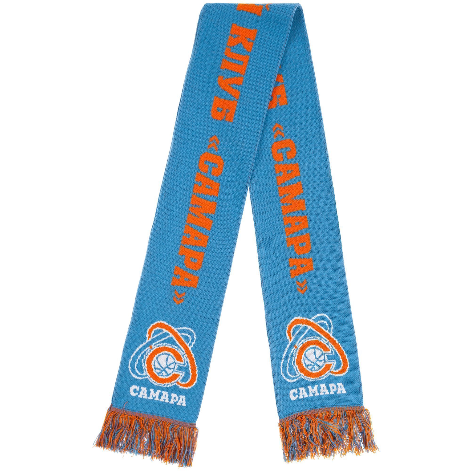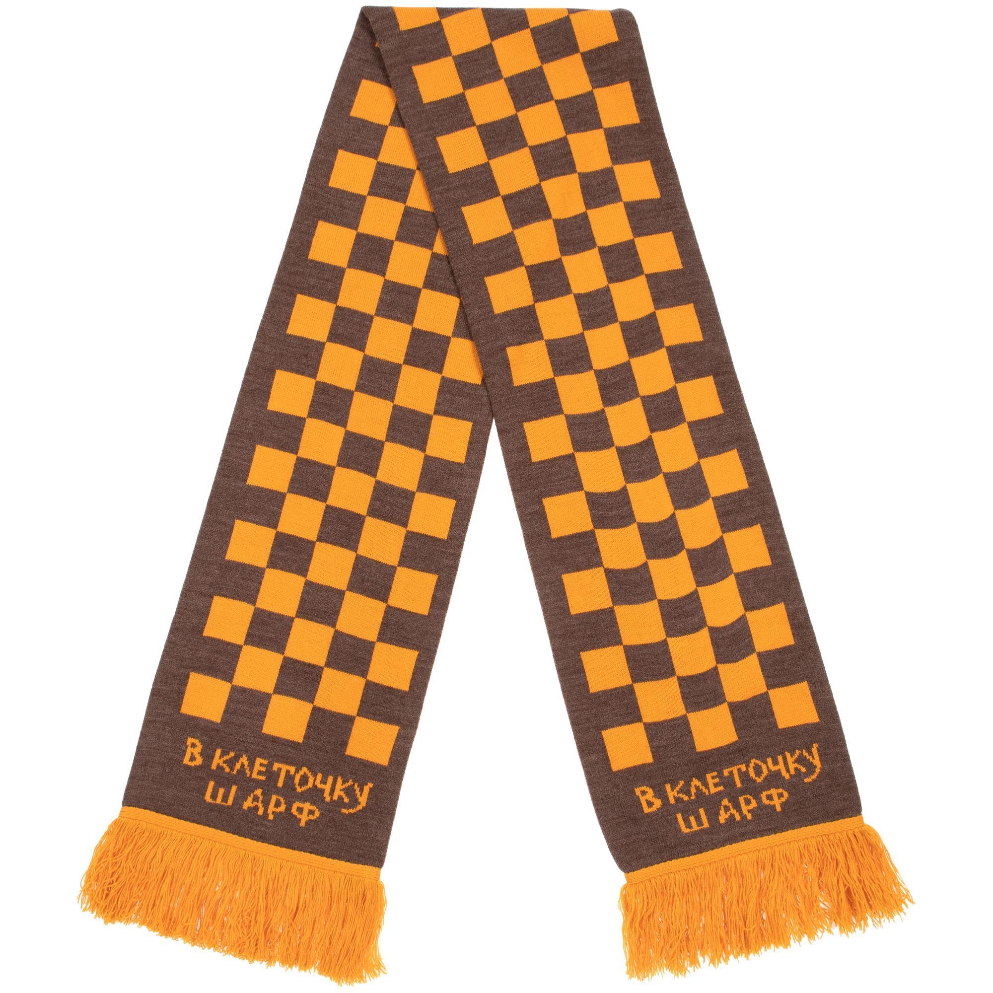 Шарф с вывязанным логотипом и индивидуальным рисунком в фирменной цветовой гамме.