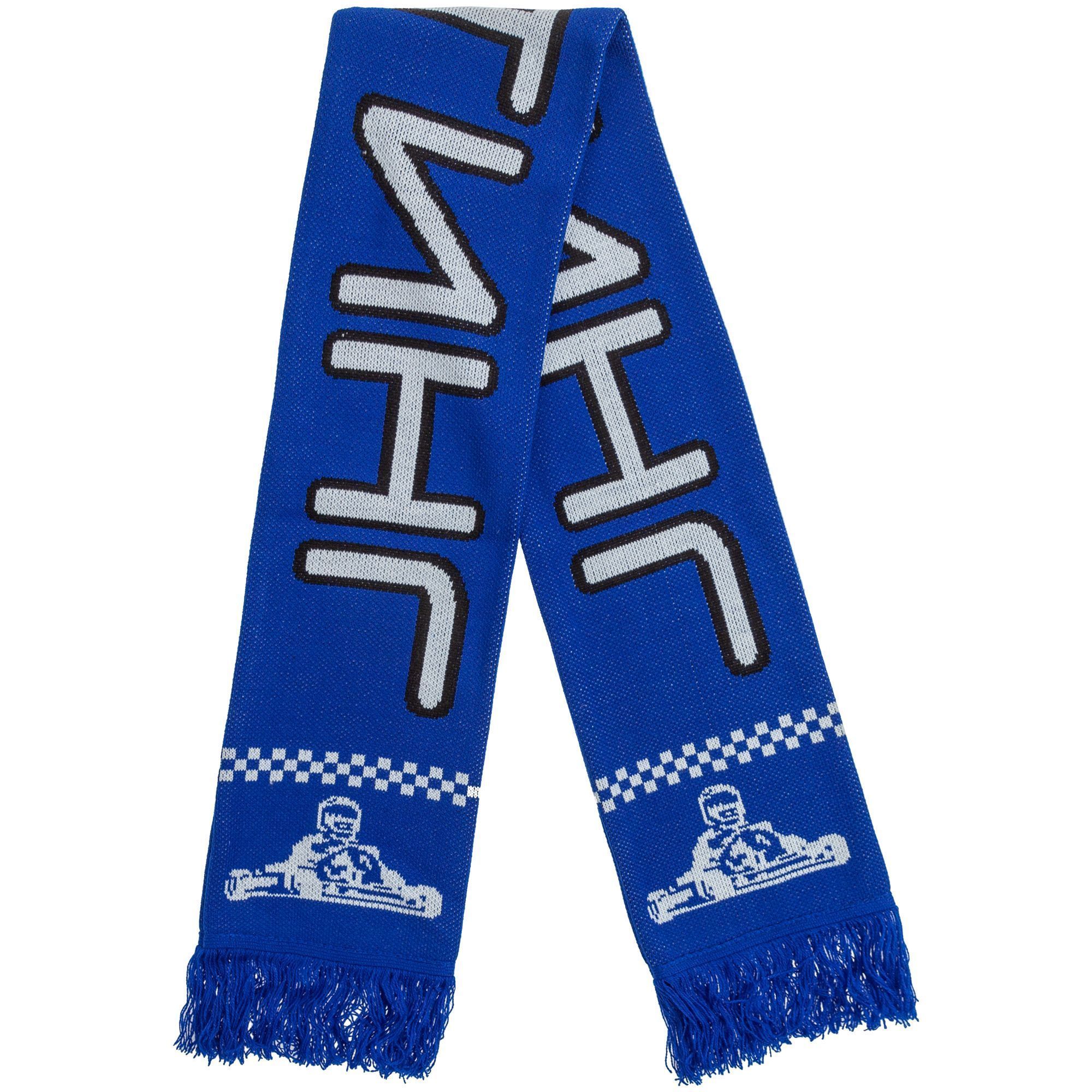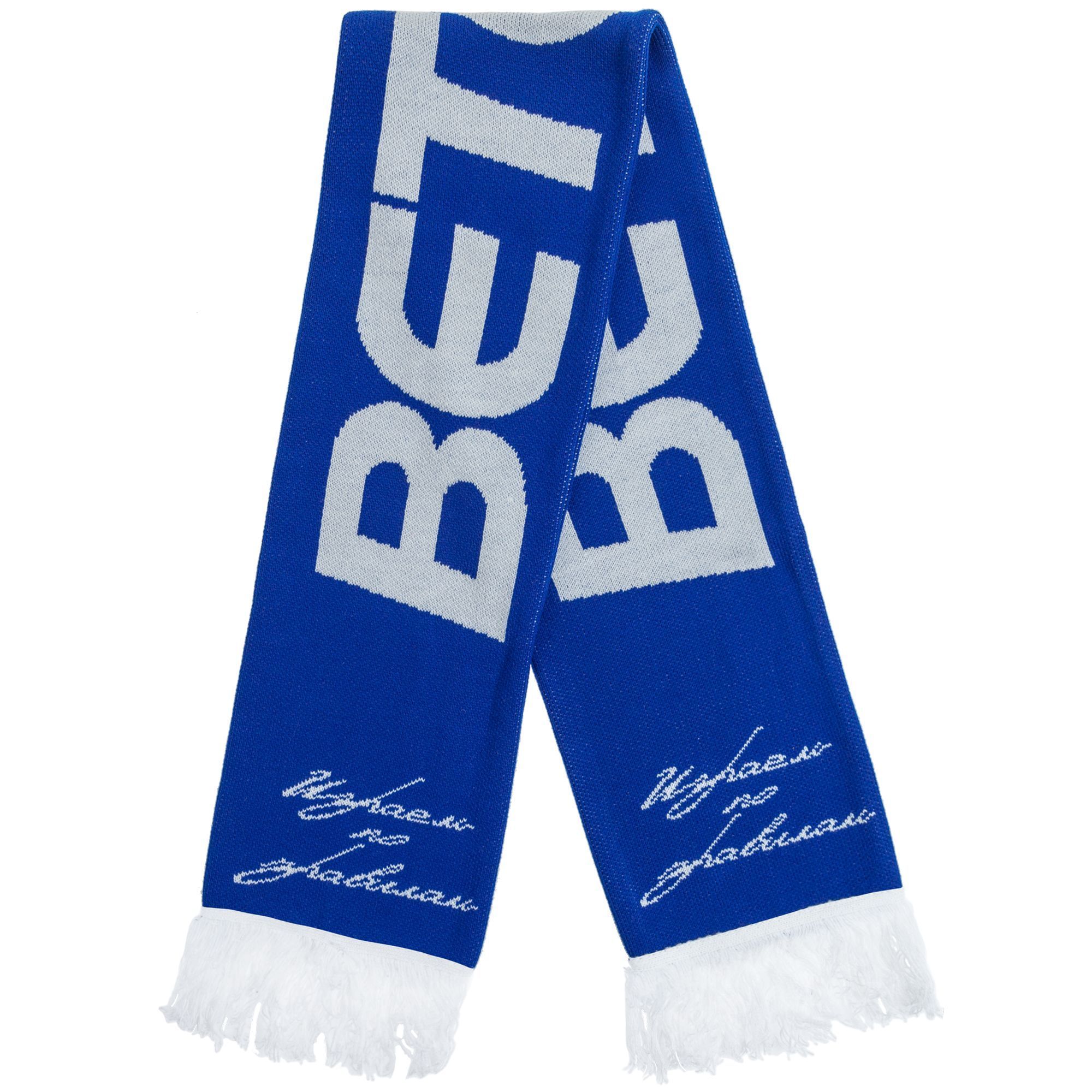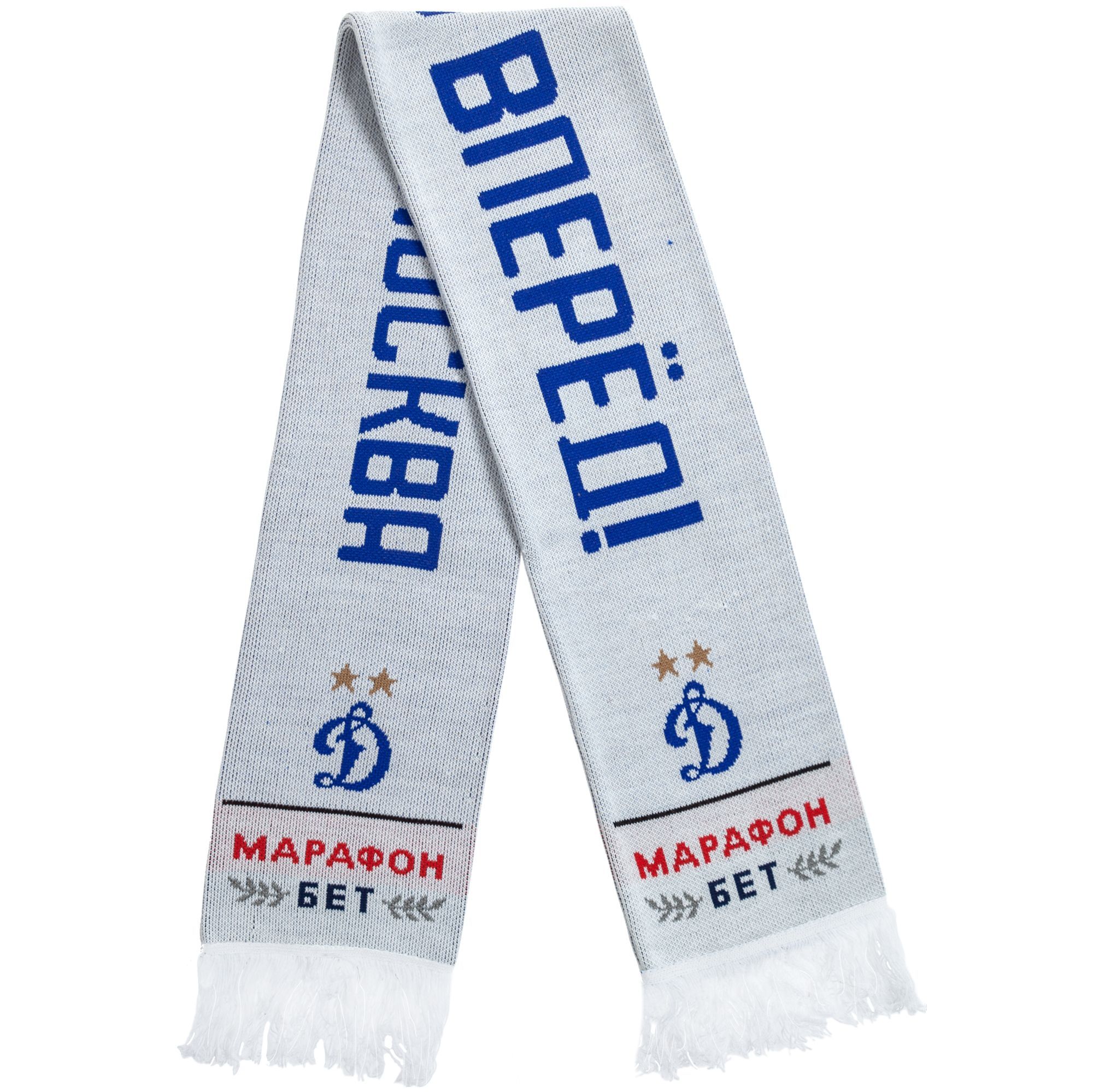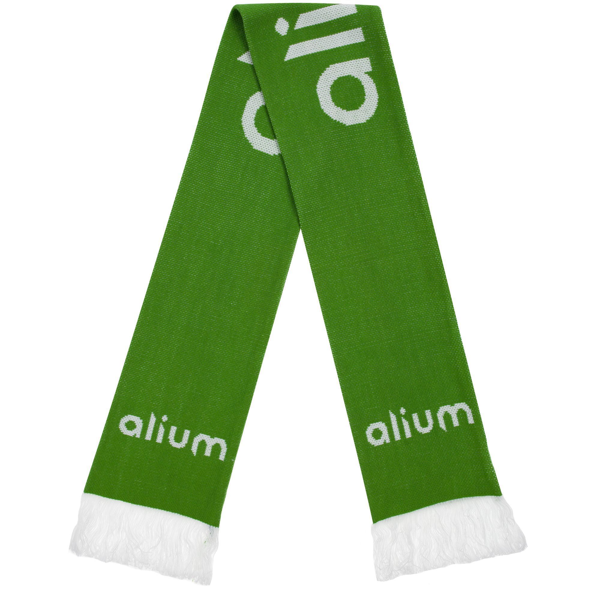 Шарф с вывязанным логотипом и индивидуальным рисунком в фирменной цветовой гамме.
