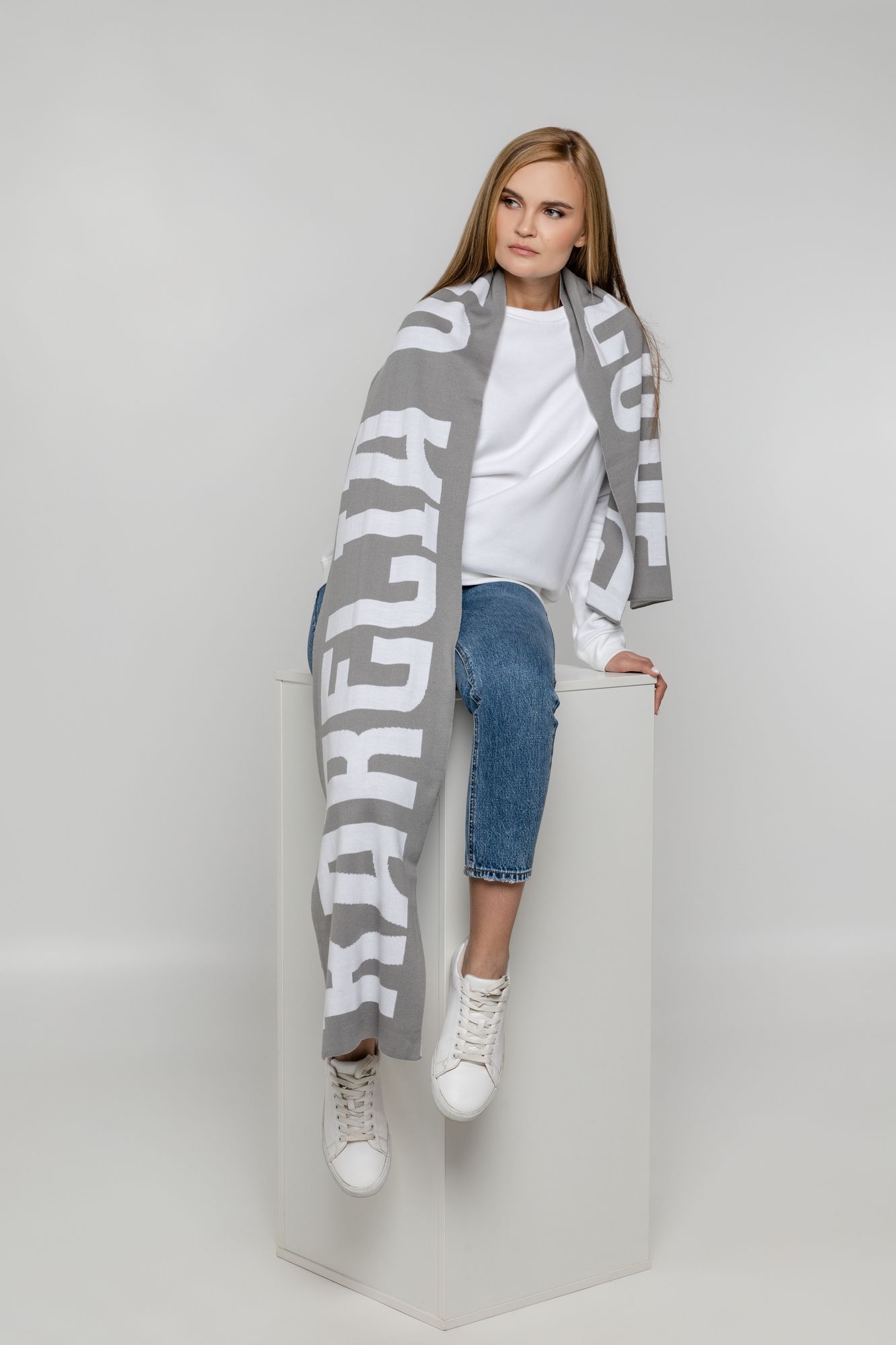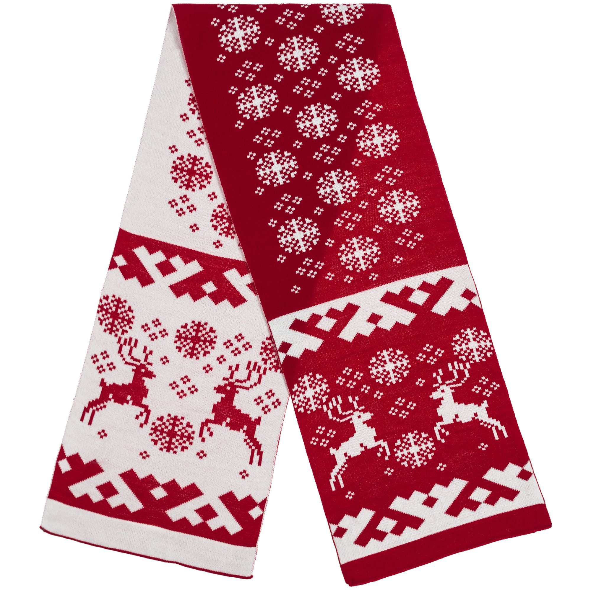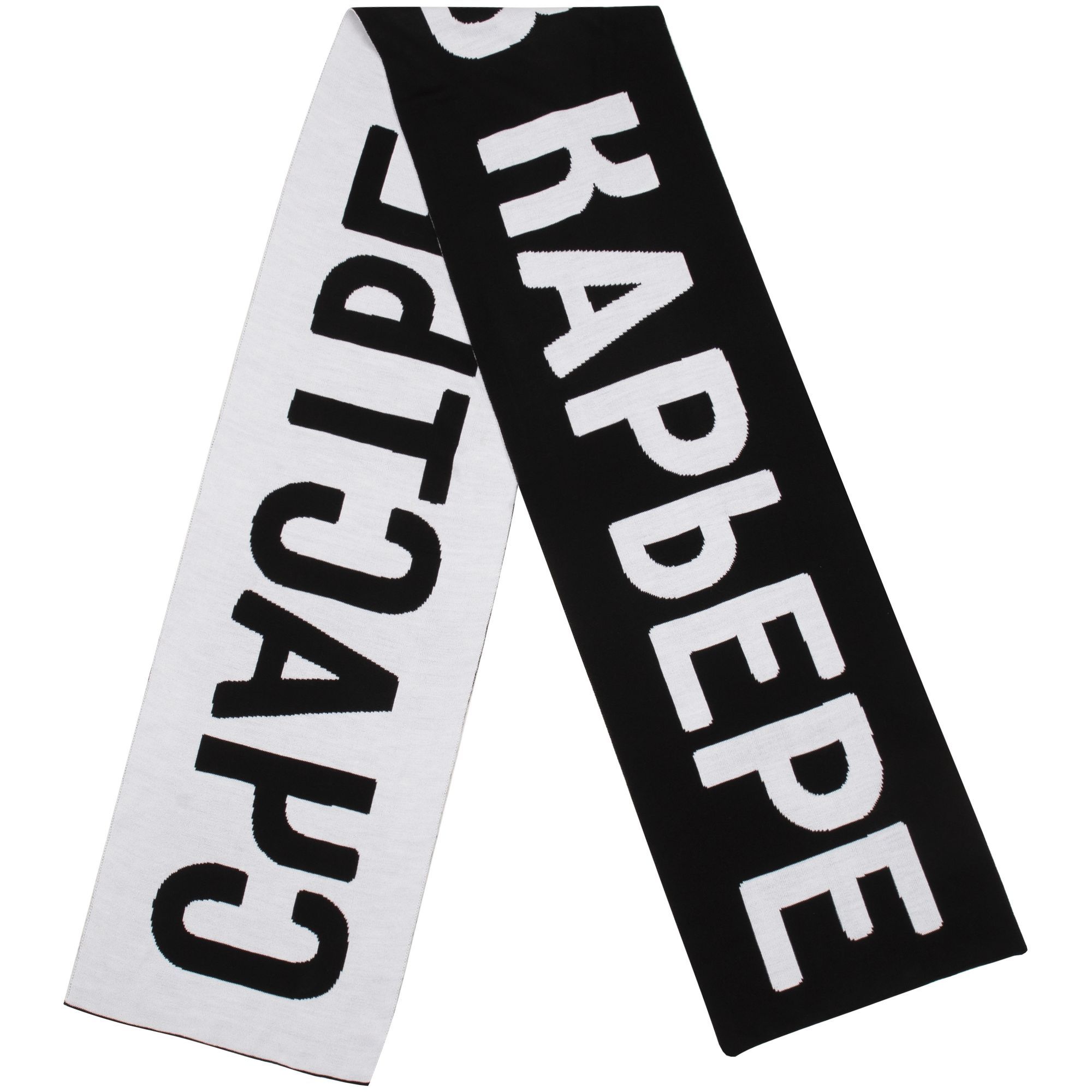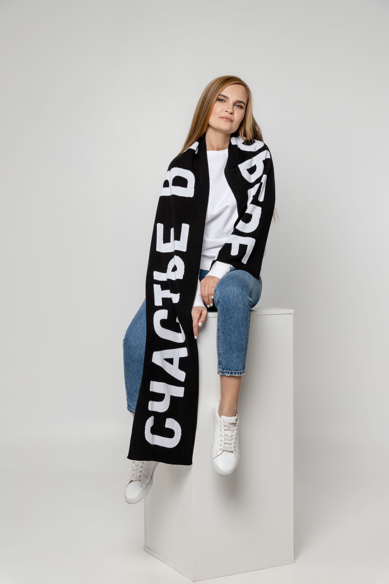 Шарф с вывязанным логотипом и индивидуальным рисунком в фирменной цветовой гамме.