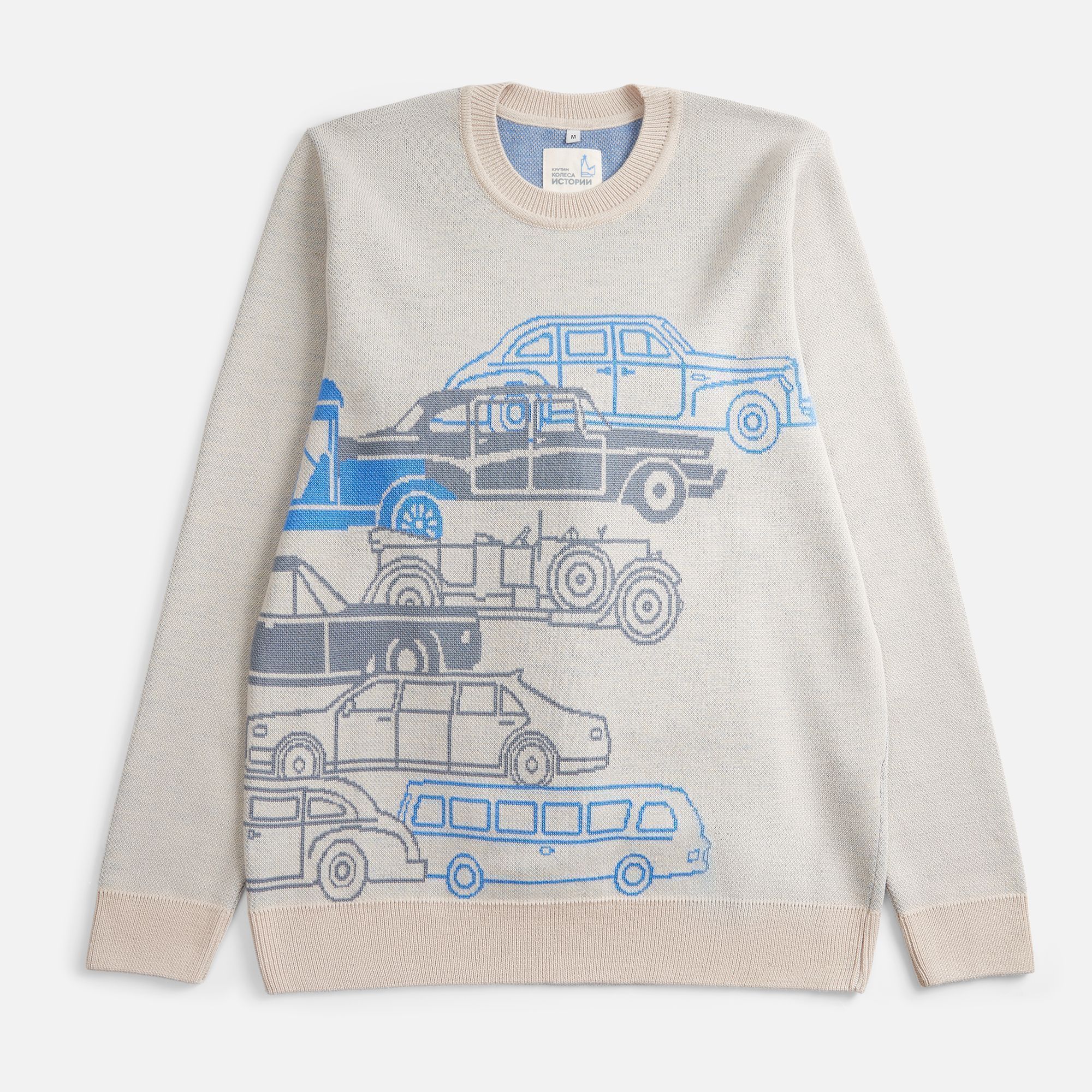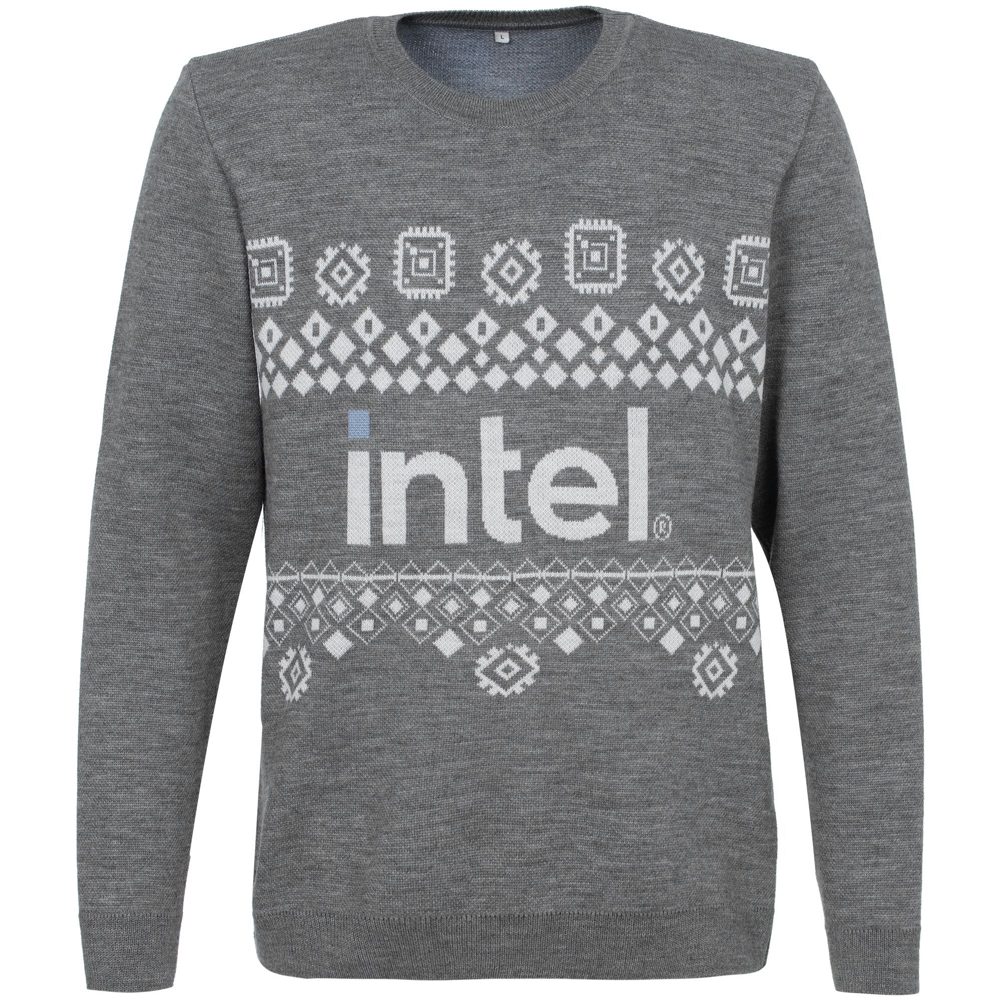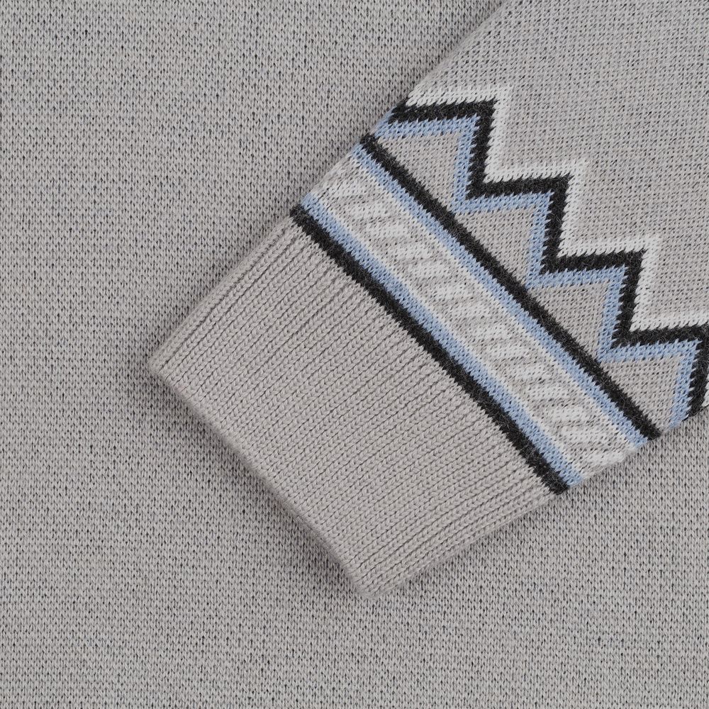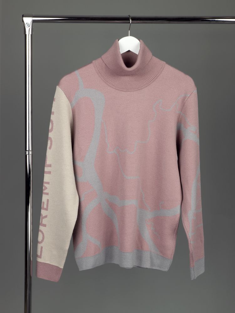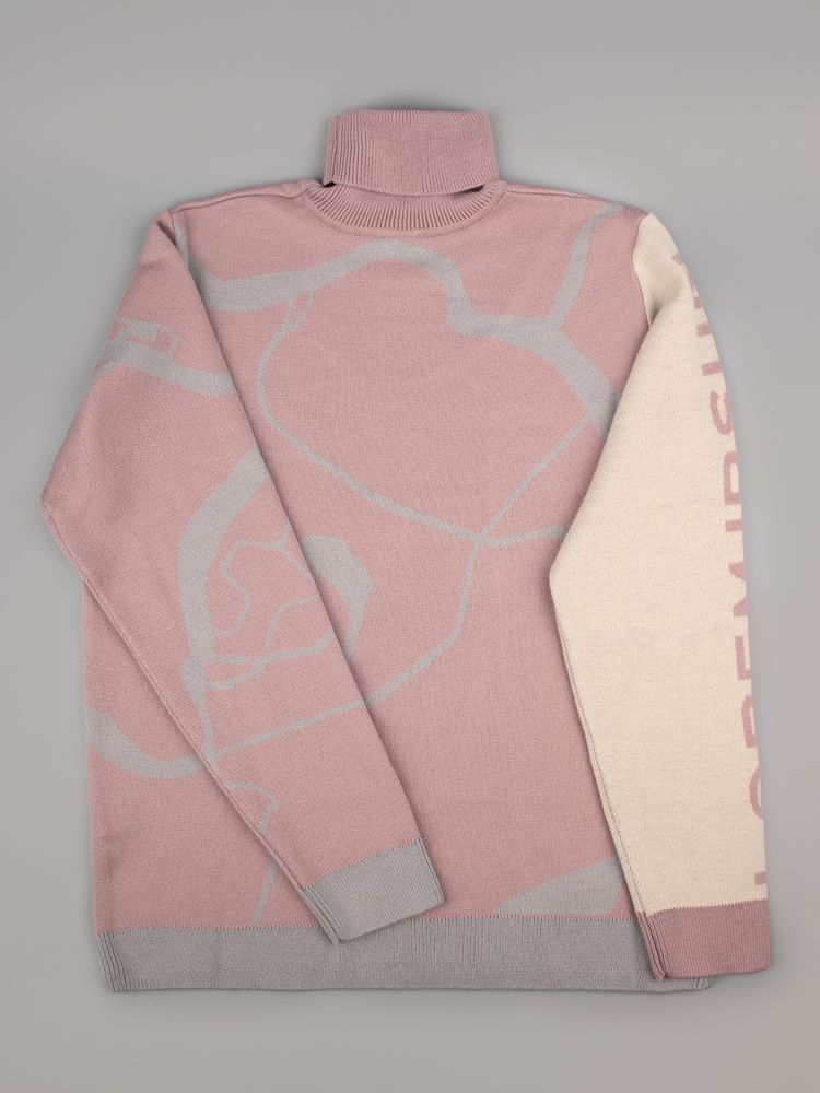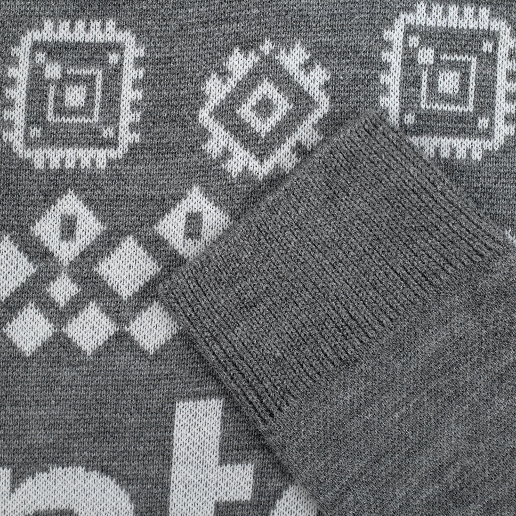 Свитер с вывязанным логотипом и индивидуальным рисунком в фирменной цветовой гамме.