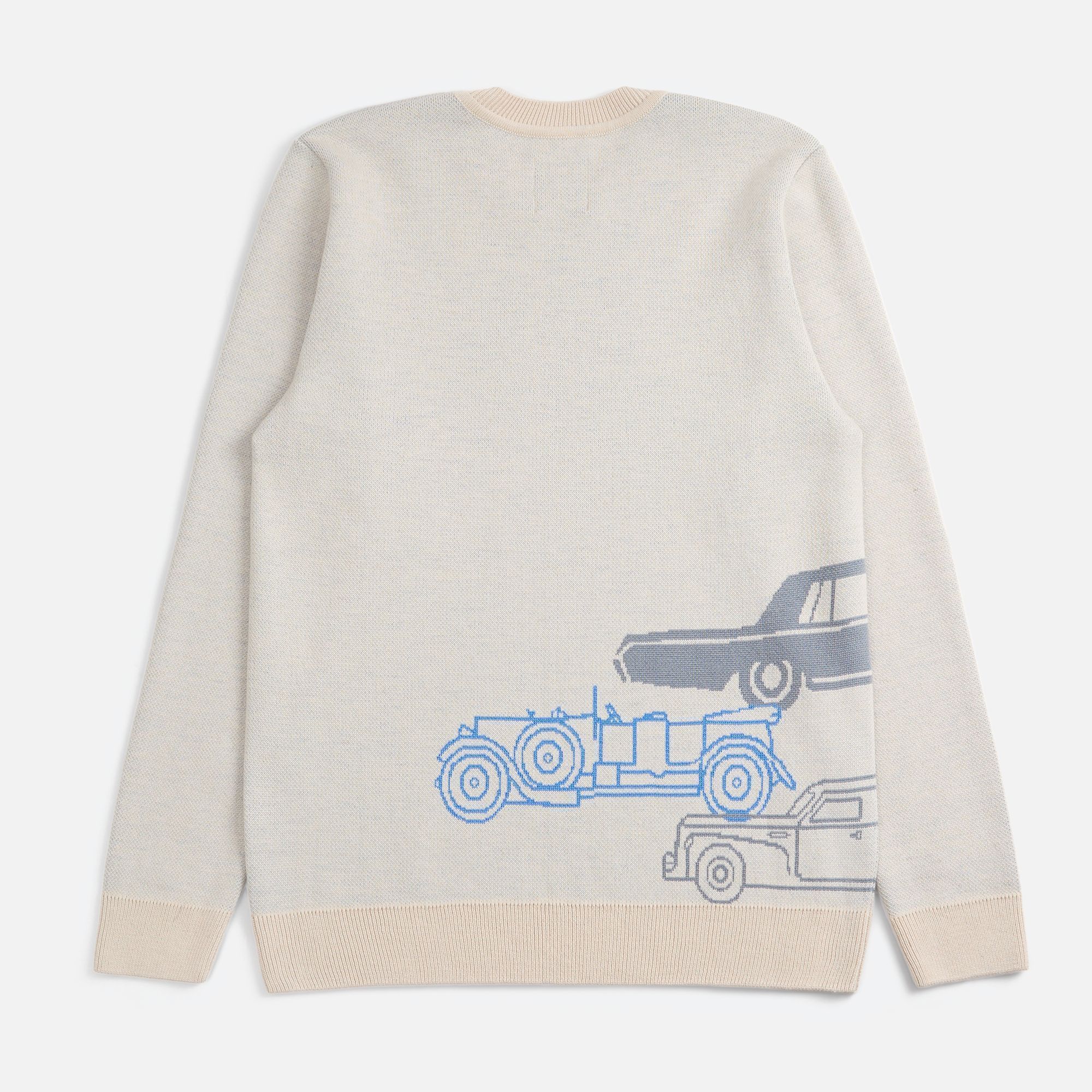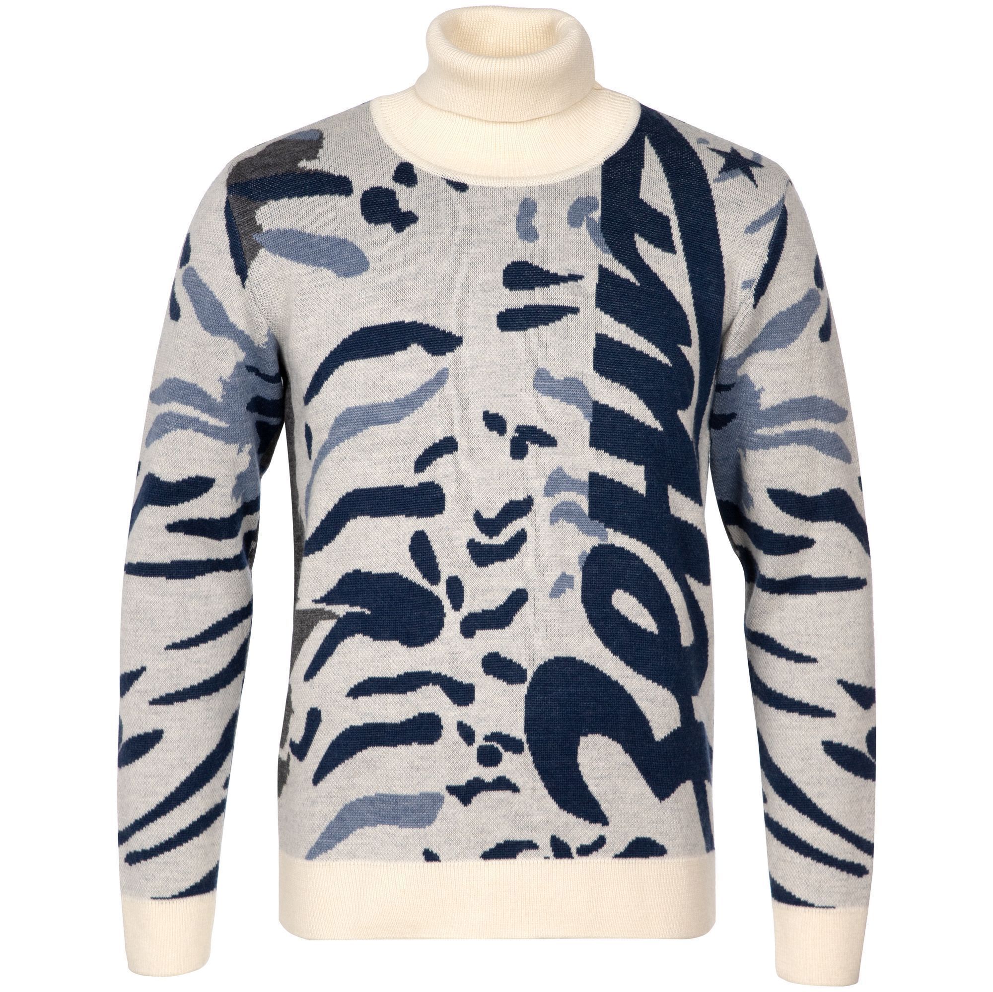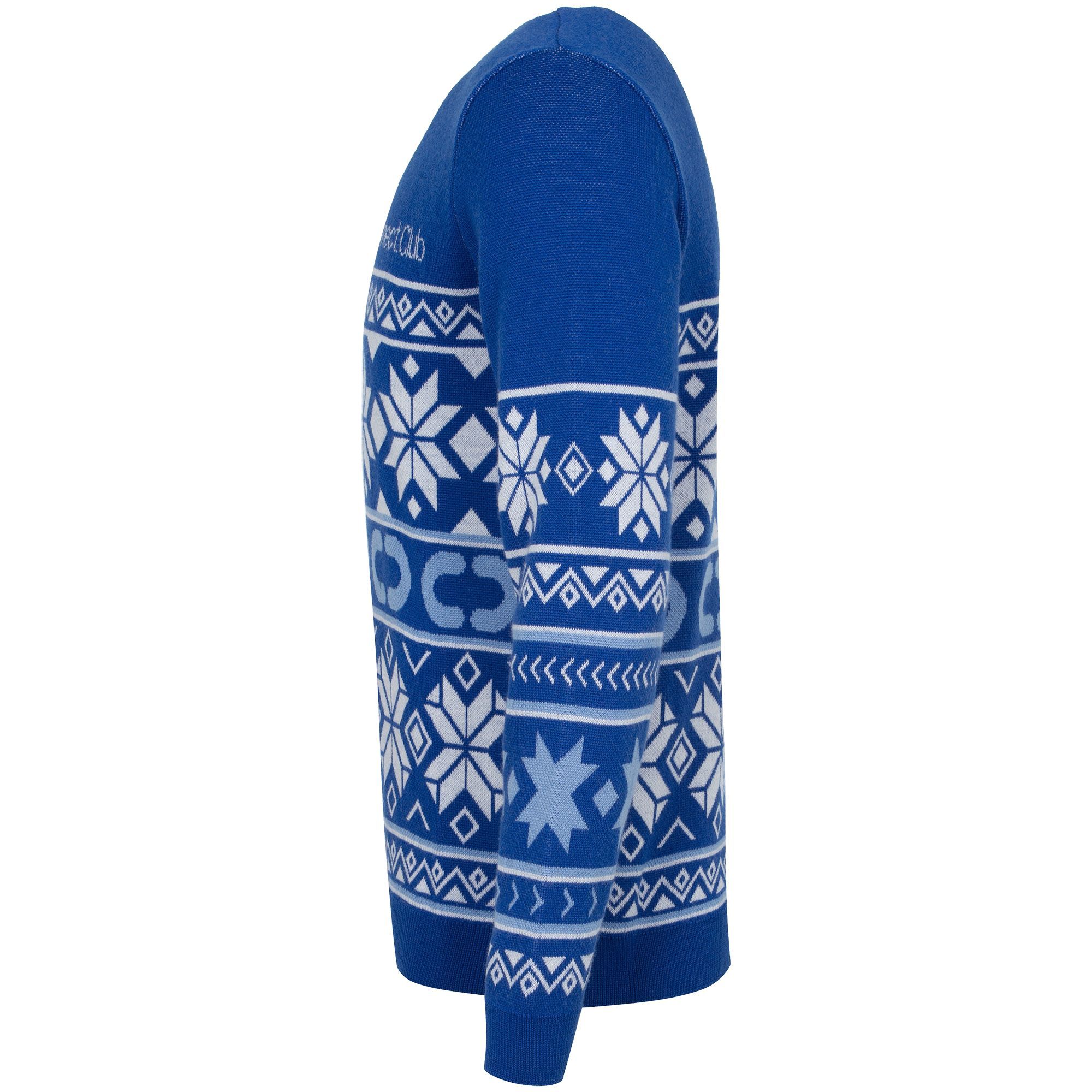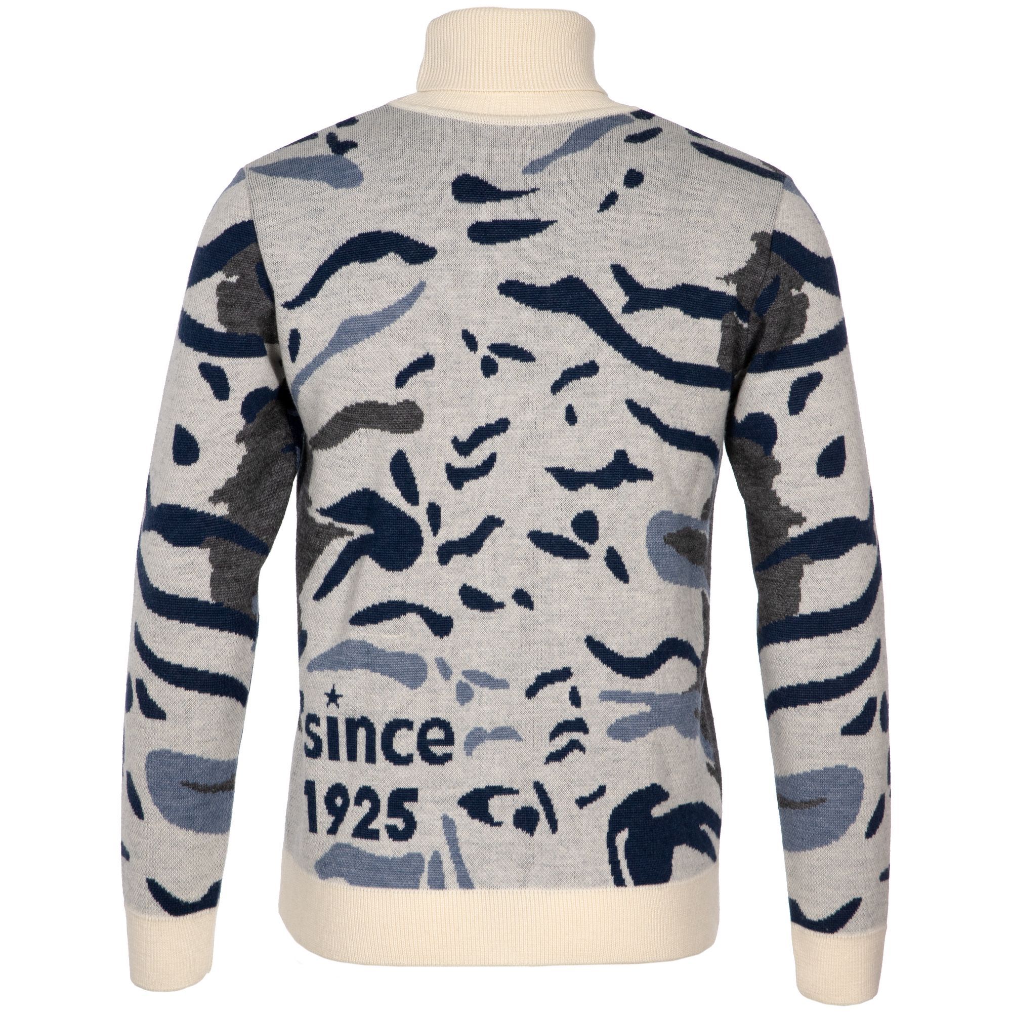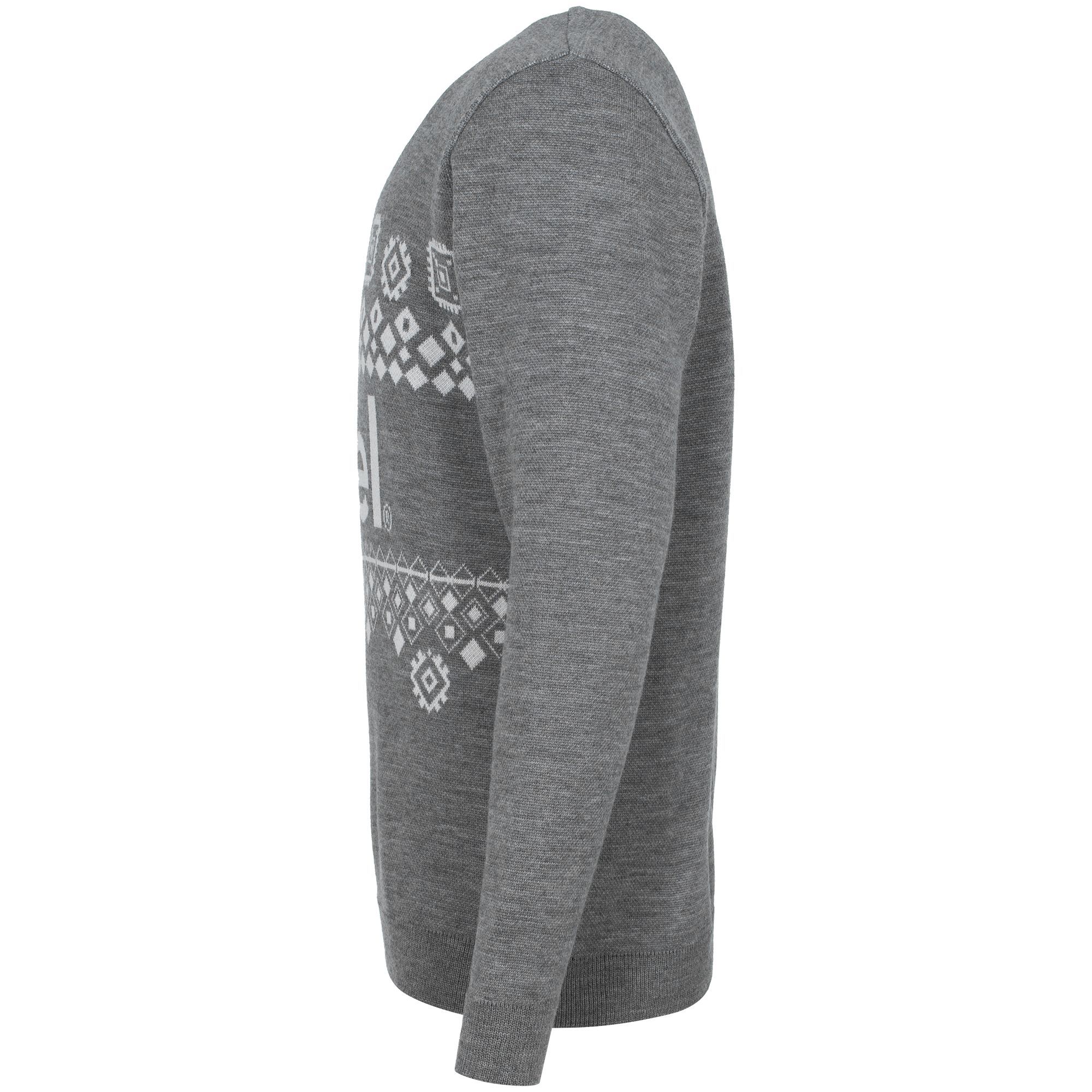 Свитер с вывязанным логотипом и индивидуальным рисунком в фирменной цветовой гамме.