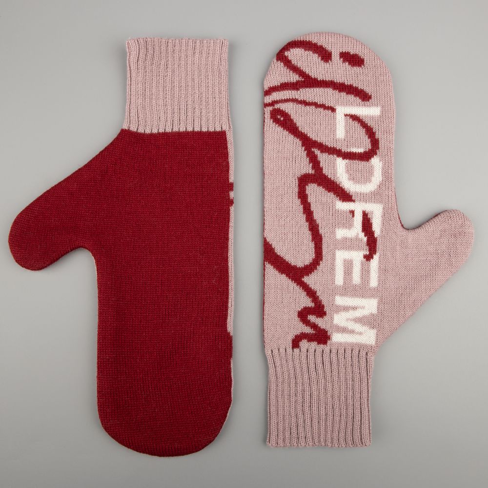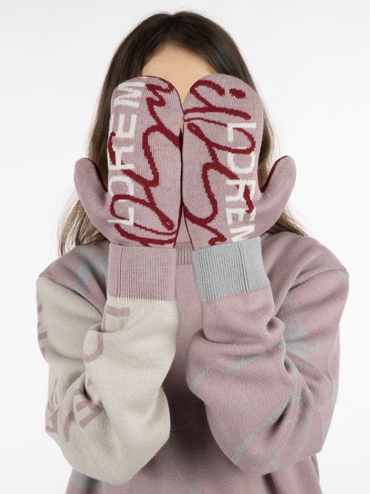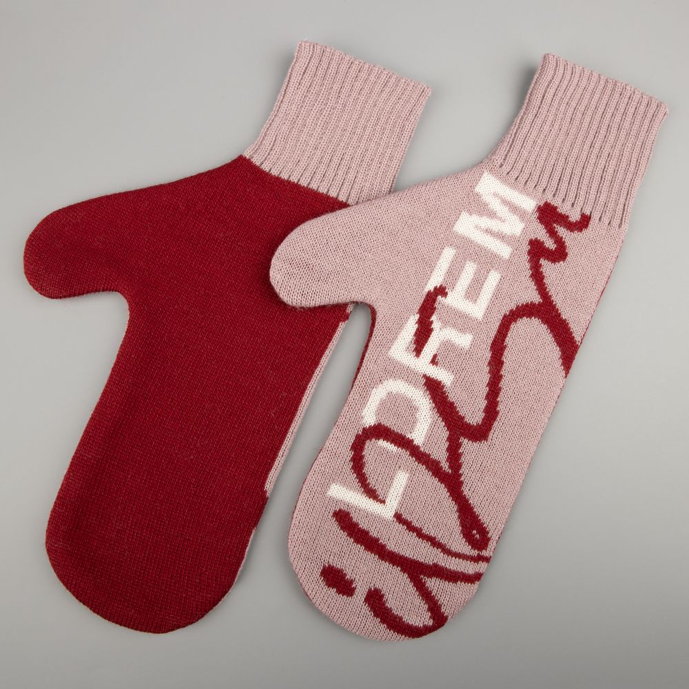 Варежки с вывязанным логотипом и индивидуальным рисунком в фирменной цветовой гамме.