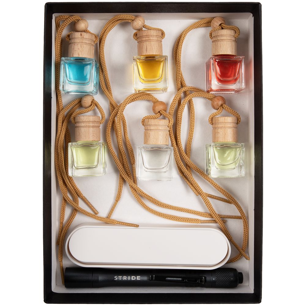 ароматизатор - стекло, дерево; коробка - переплетный картон; визитка - пластик; фонарик - алюминий