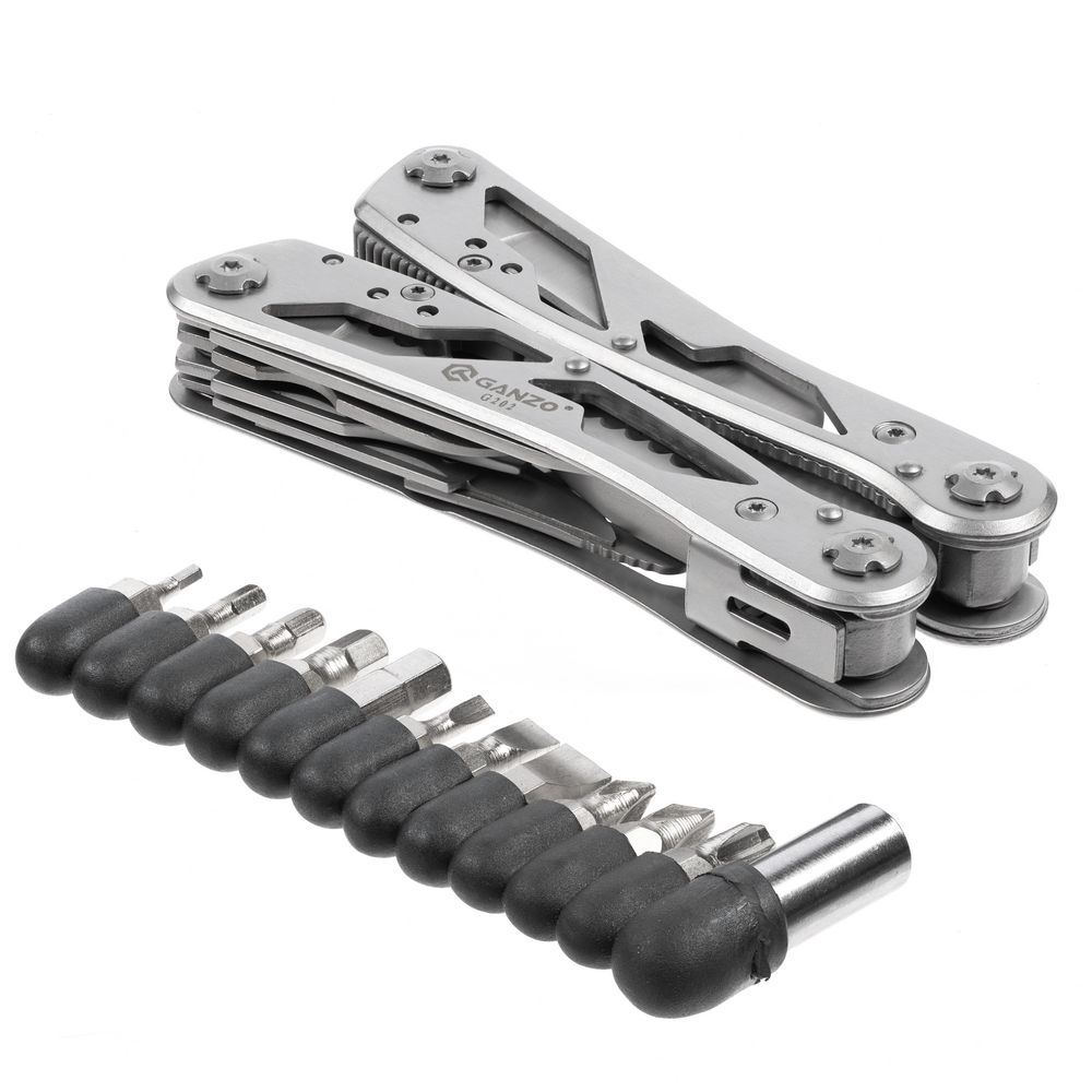 В комплекте мультитул, чехол и набор из 12 съемных бит.