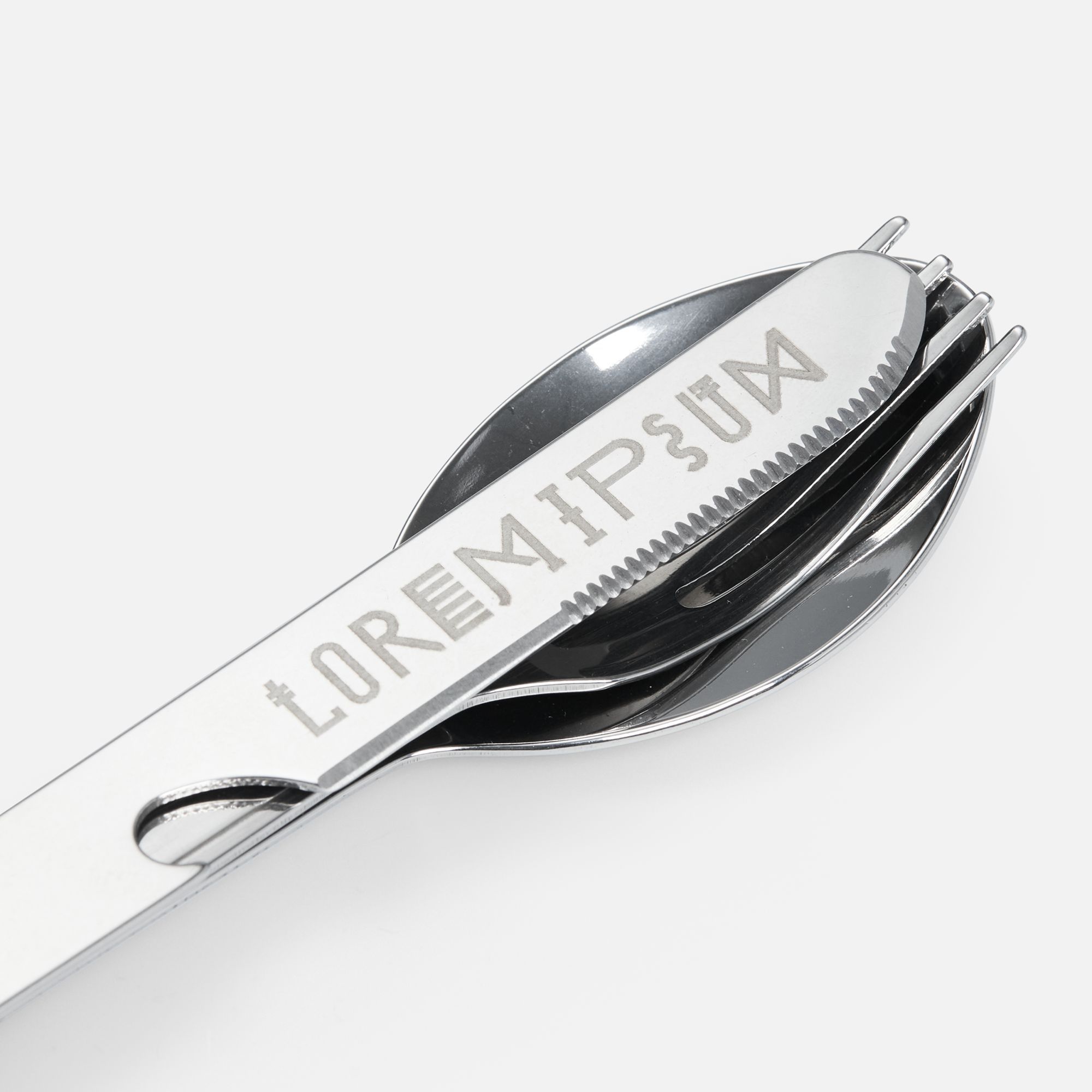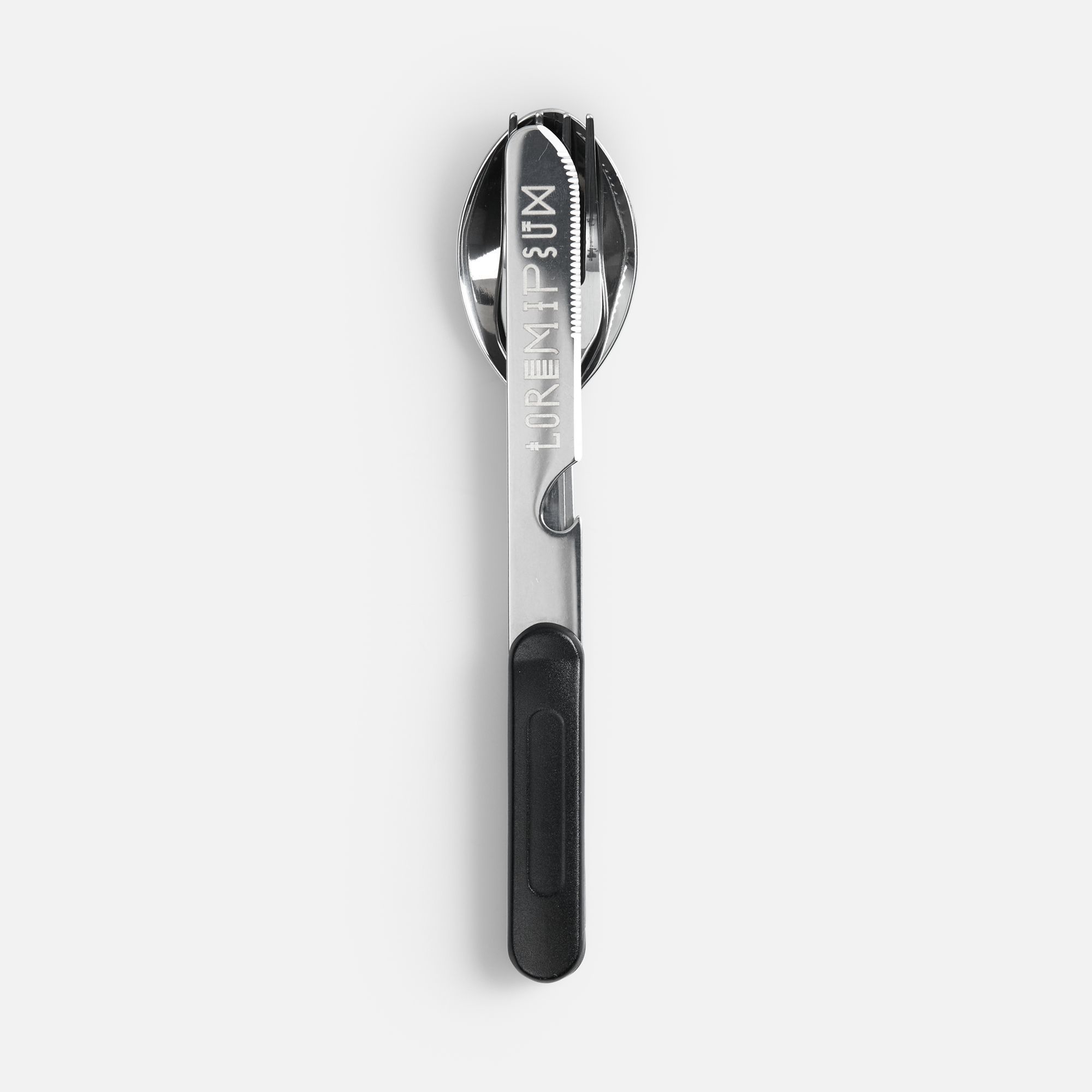 Набор столовых приборов из ложки, вилки и ножа с открывашкой с разборной конструкцией.