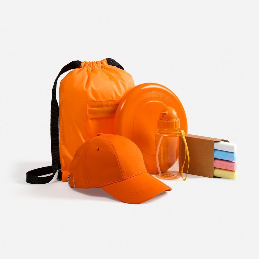 Детский набор для творчества: 4 цветных мелка, бутылка для воды, стильная бейсболка с защитой от солнца, тарелка-фрисби для самых активных и яркий детский рюкзак-мешок — все, что нужно для творческих приключений на свежем воздухе.