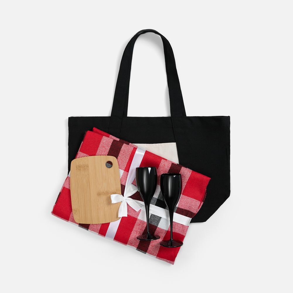 Этот стильный и лаконичный набор для пикника собрал все необходимое для комфортной и уютной вылазки на природу — теплый яркий плед, 2 бокала для шампанского и миниатюрную доску для нарезки и подачи любимых закусок. Все это легко помещается в стильный шопер.
