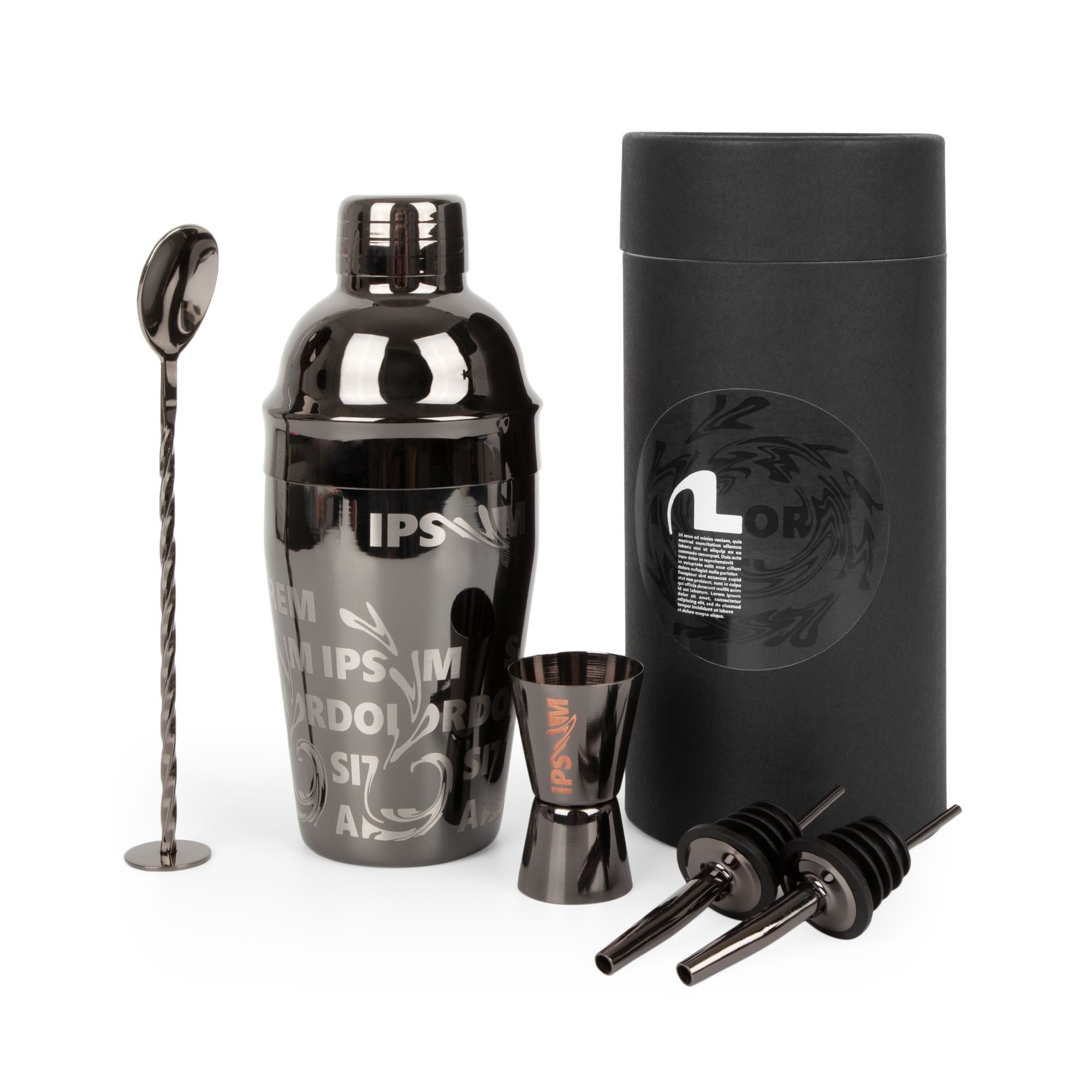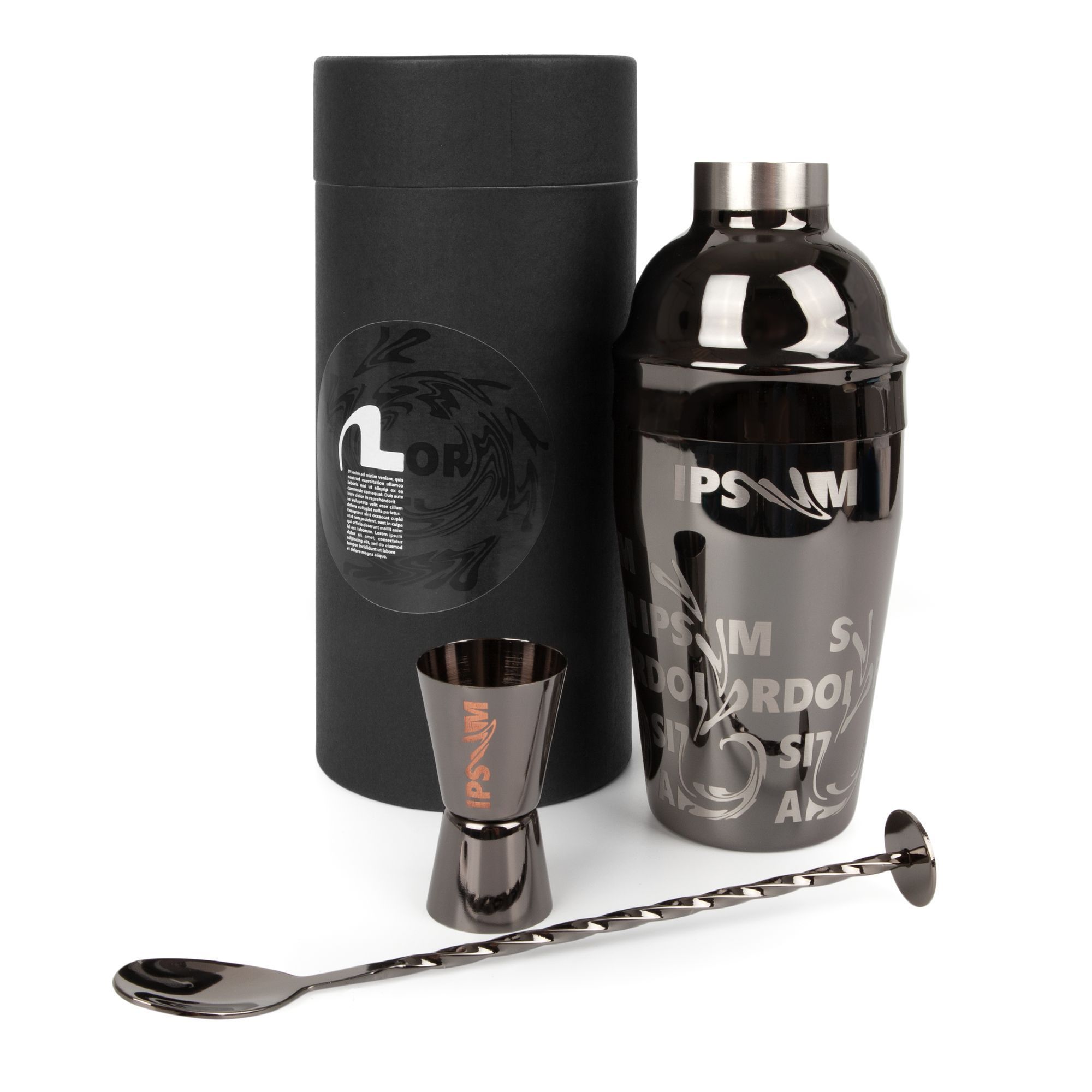 шейкер: диаметр 8,1 см, высота 21 см; джиггер 3,8х3,8х6,8 см; барная ложка 20,5 см; гейзер 10,3х2,9х2,9 см; упаковка 23х10х10 см