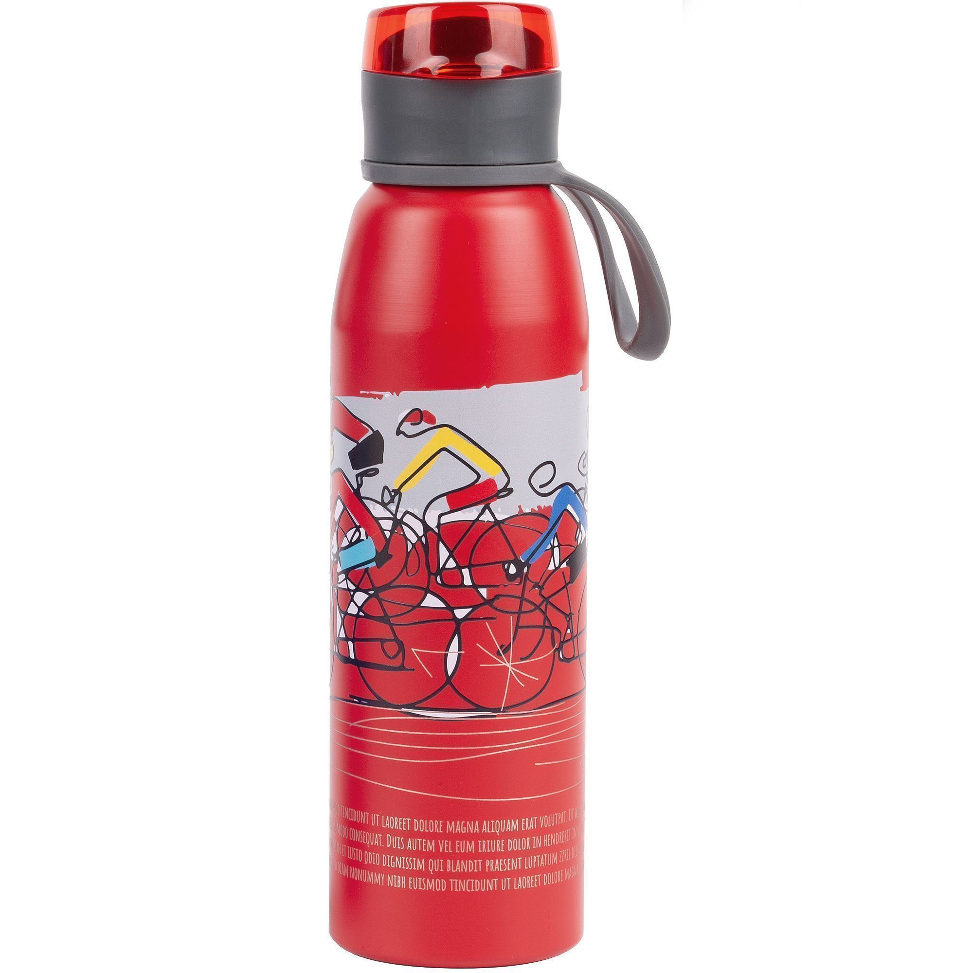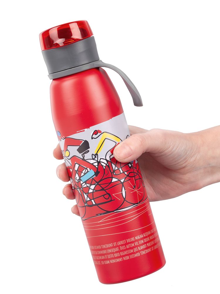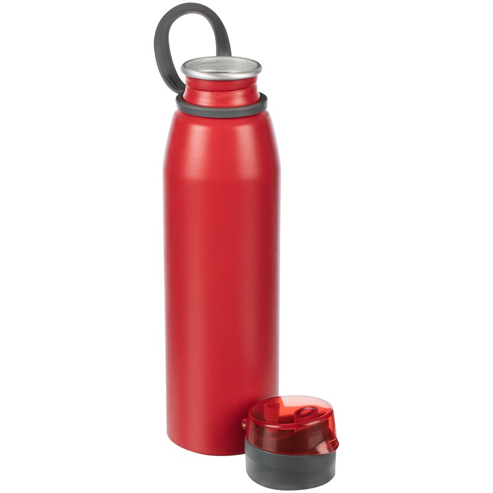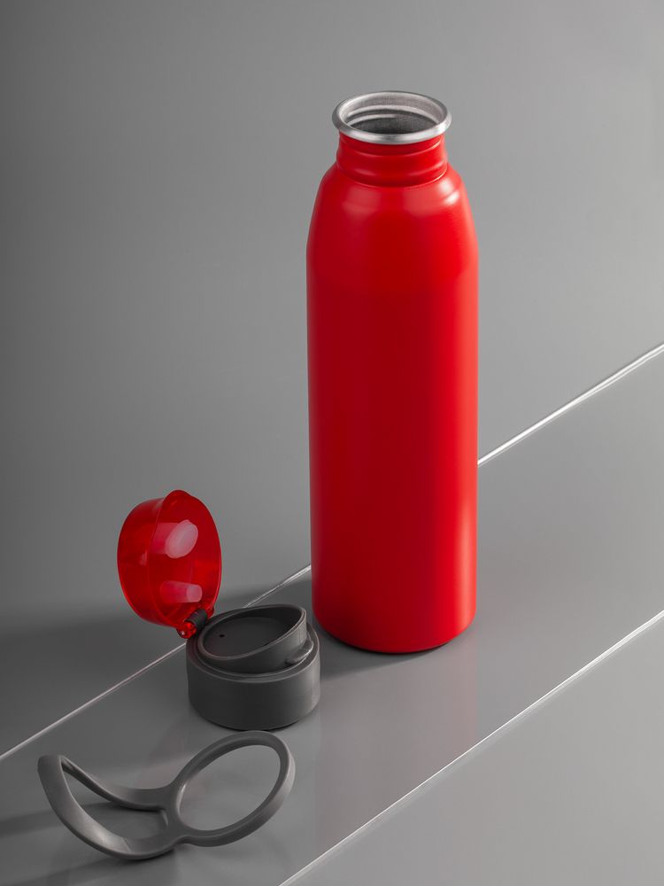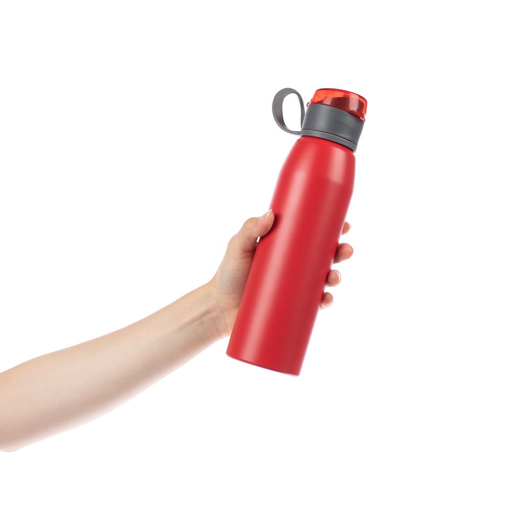 Легкая бутылка для спорта с откидной крышкой и силиконовой петлей для удобной транспортировки.
