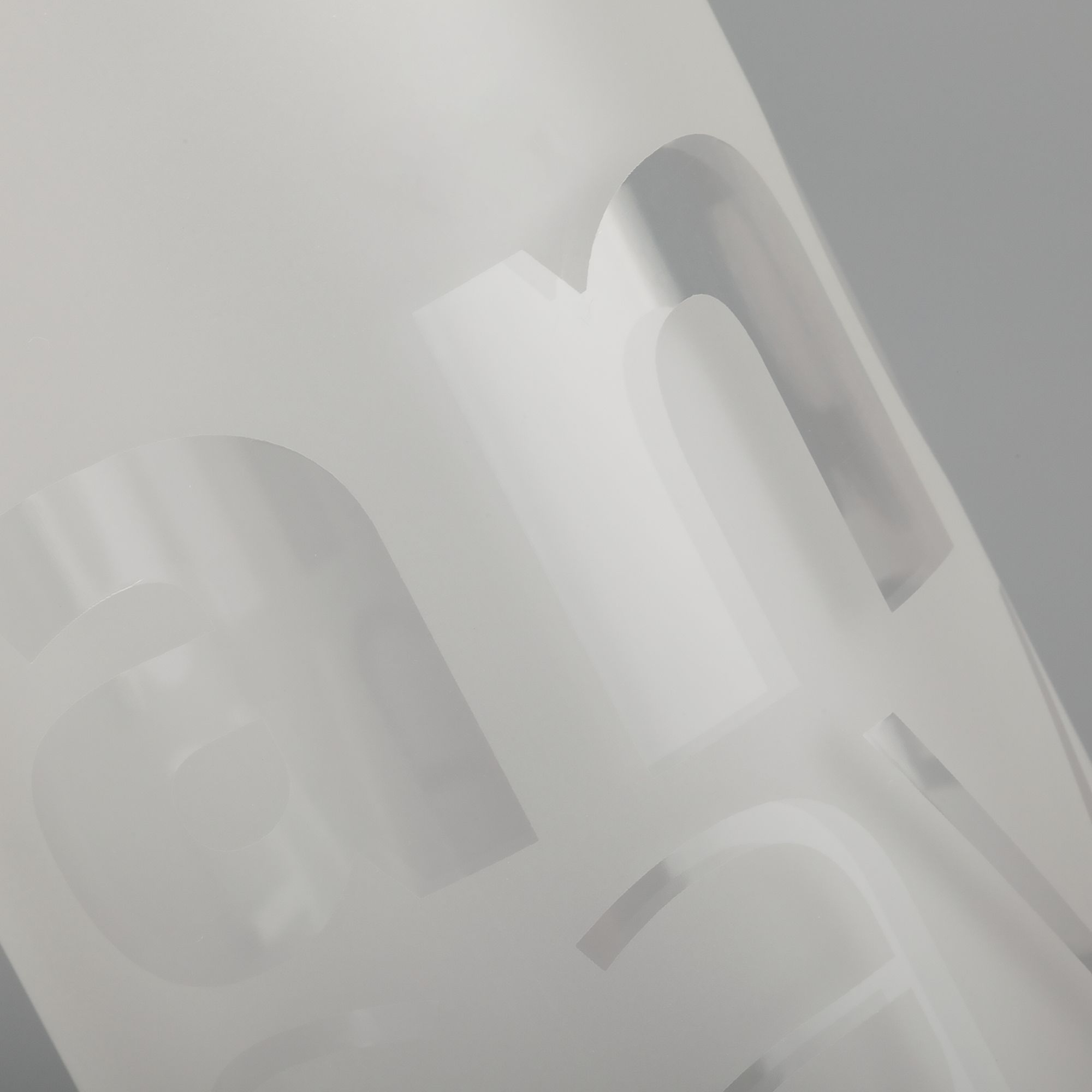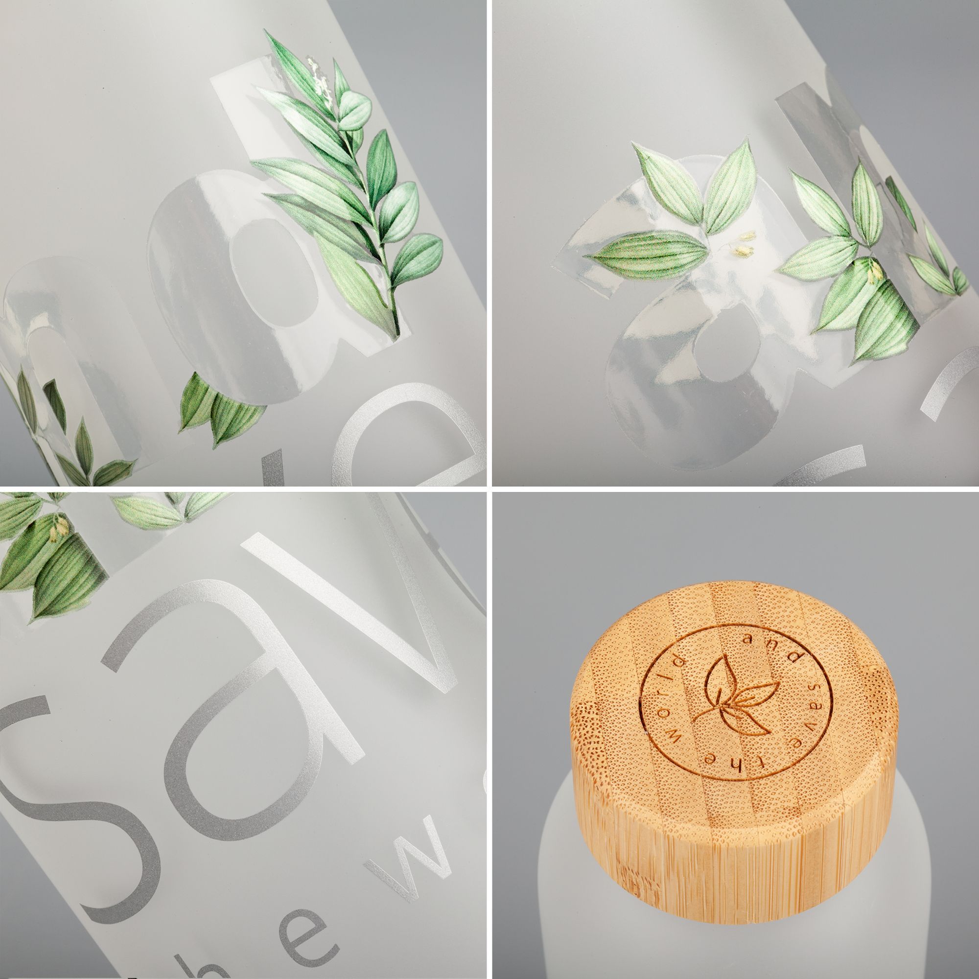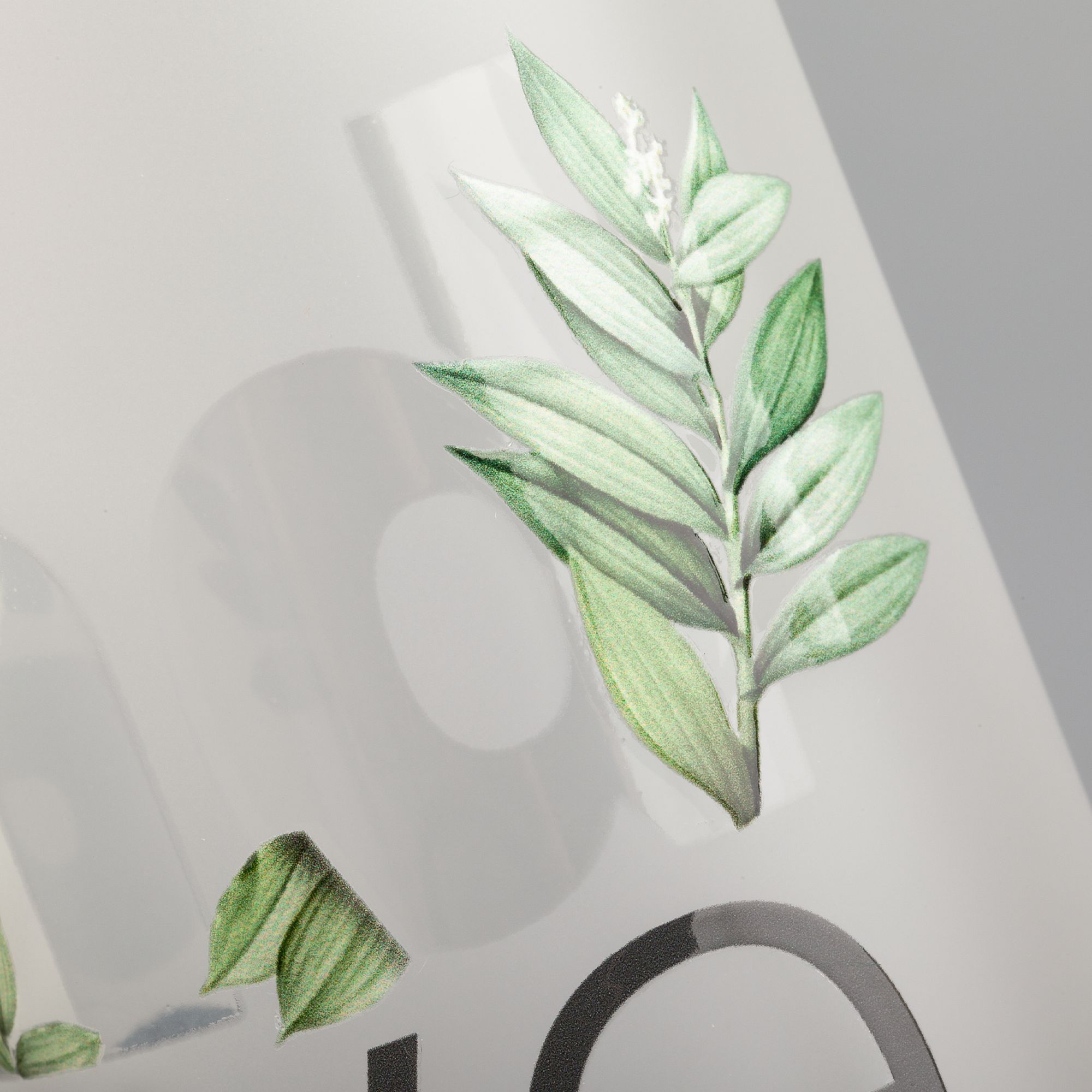 Технология УФ-DTF-печати на бутылке Nube с использованием прозрачного лака позволяет создавать эффект трансформации: матовое покрытие становится прозрачным, открывая новые возможности для креативного дизайна.