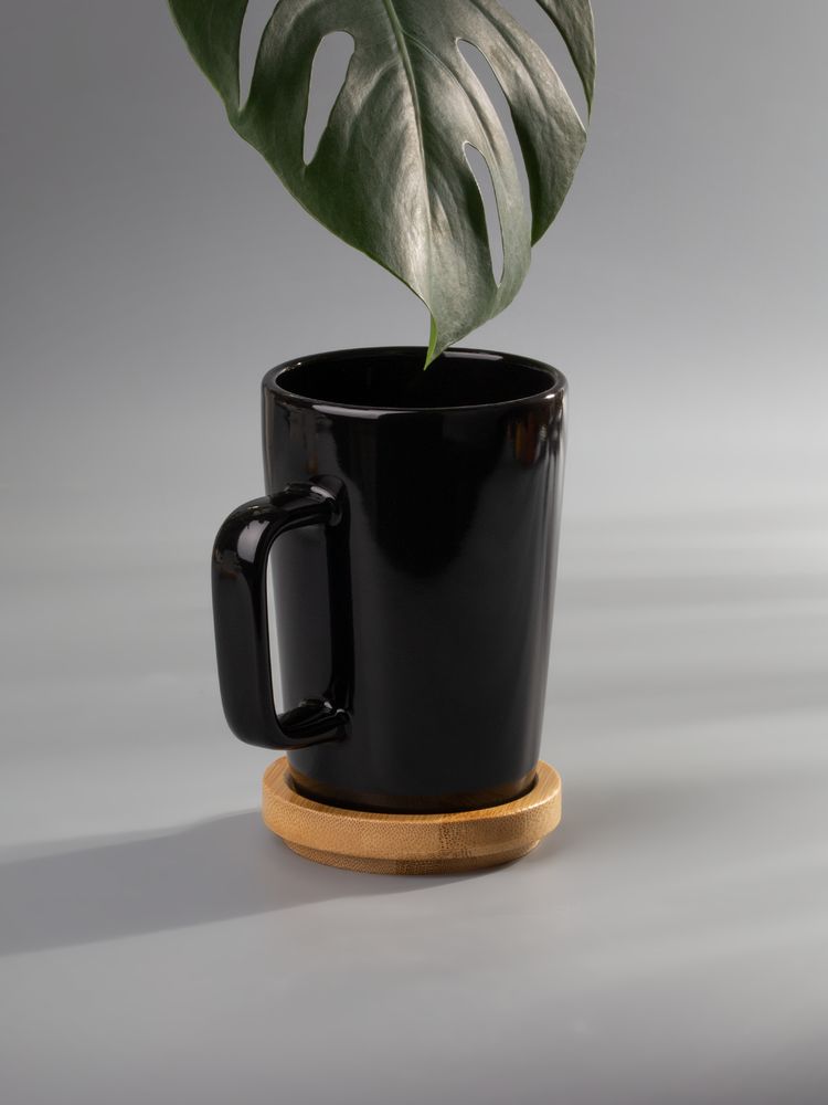 Главная особенность объемной кружки Vierra — это многофункциональная крышка-костер из бамбука. Она поможет защитить напиток от пыли или остывания, а также предотвратит нагревание стола или образование на нем пятен. А еще на ней удобно подавать небольшой комплемент к чаю: печенье или конфета прекрасно ложатся в углубление, составляя со стильной вытянутой кружкой элегантный дуэт.