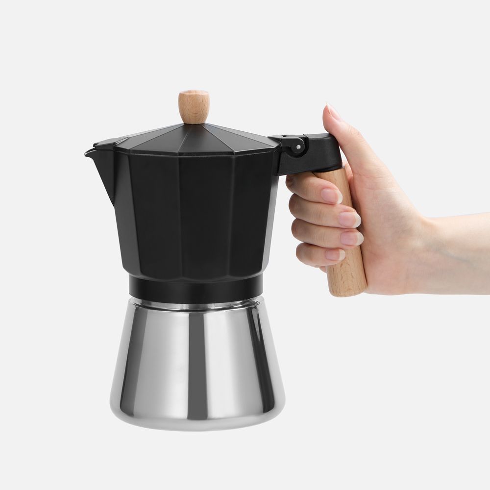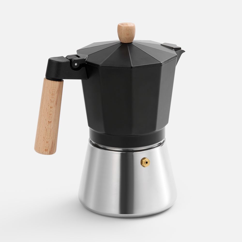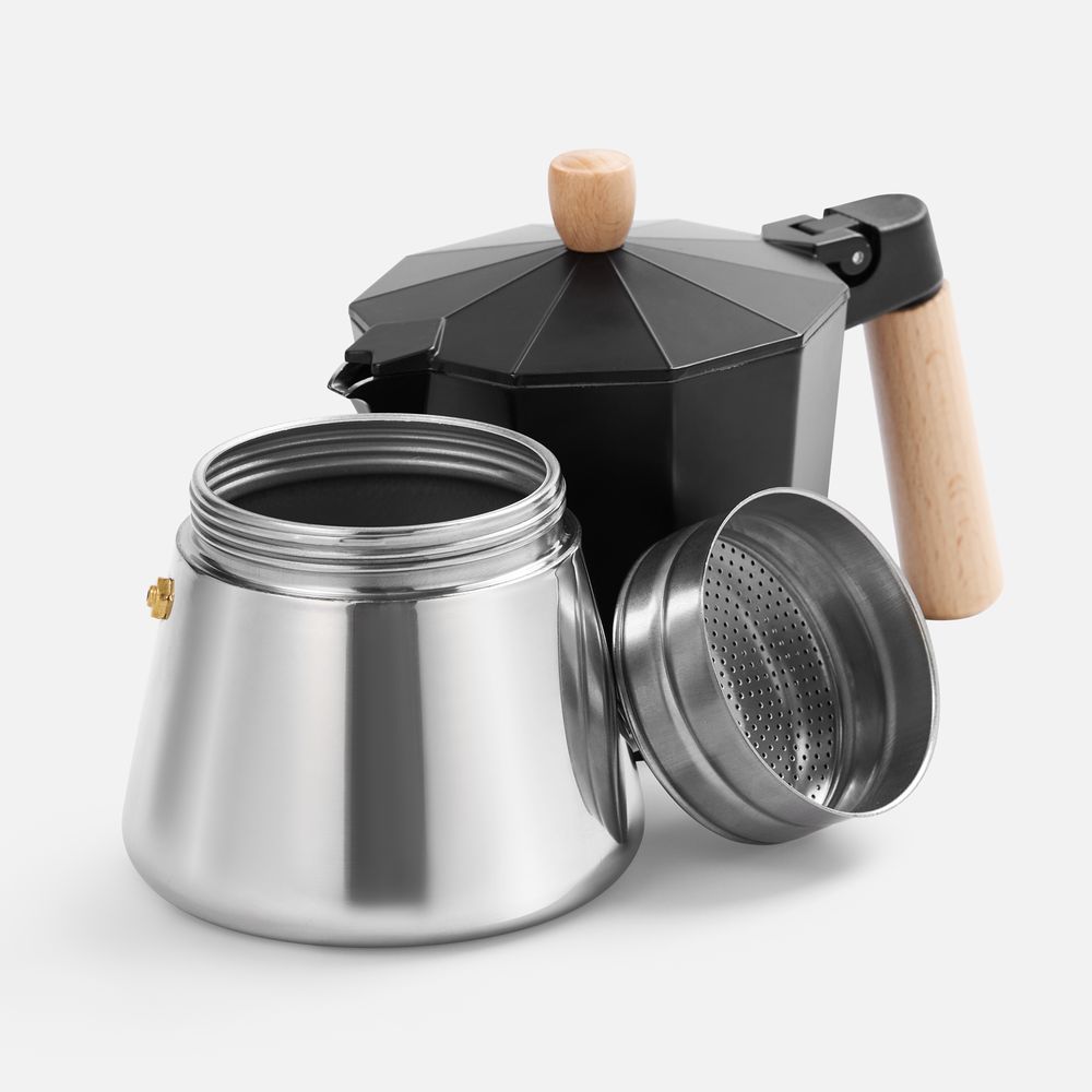 Верхняя часть выполнена из окрашенного алюминия, а нижняя — из нержавеющей стали с зеркальной полировкой, что обеспечивает долговечность и стильный внешний вид. Удобная деревянная ручка не нагревается —комфорт и безопасность при использовании гарантированы. Эта кофеварка позволит быстро и легко приготовить классический эспрессо, чтобы наслаждаться свежим крепким кофе снова и снова.