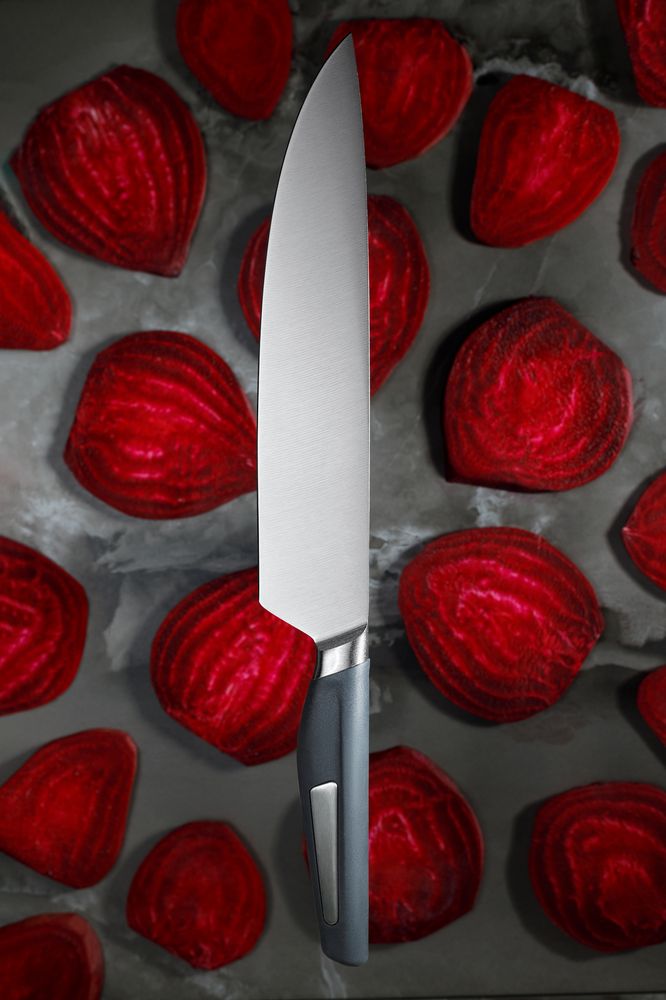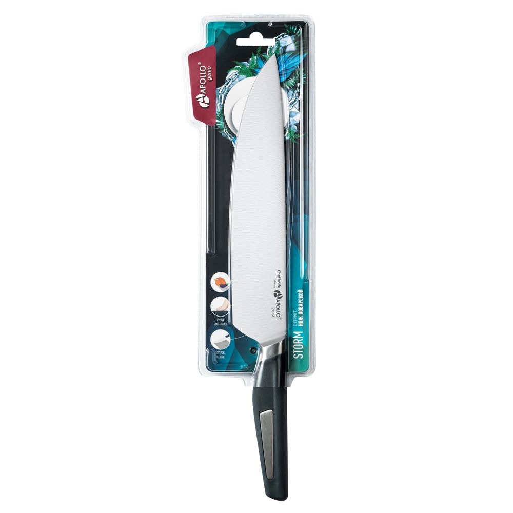 Серия ножей Storm имеет кованую гарду, которая делает нож прочным и сбалансированным, а работу с ним легкой и удобной. Лезвие ножа Storm выполнено из нержавеющей стали и долго держит заточку. Специальная форма рукоятки и ее приятное на ощупь прорезиненное покрытие не позволяют ножу выскальзывать из руки во время использования.
