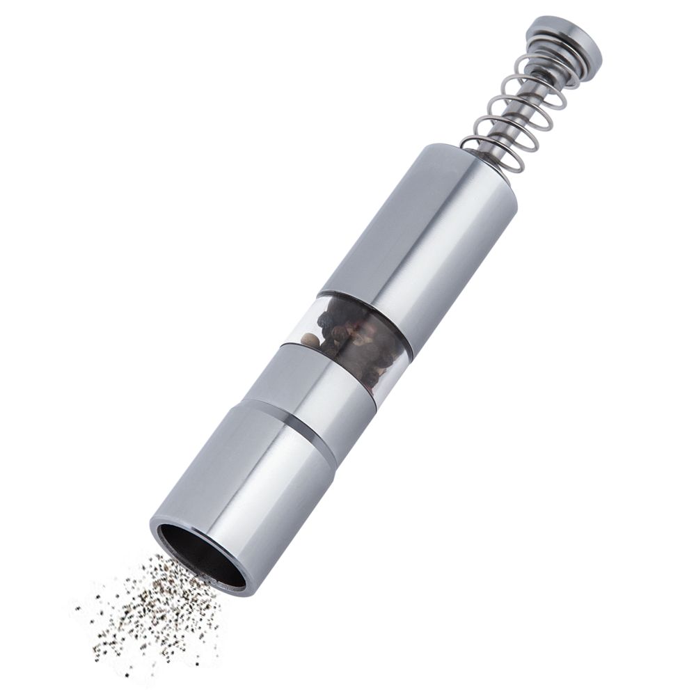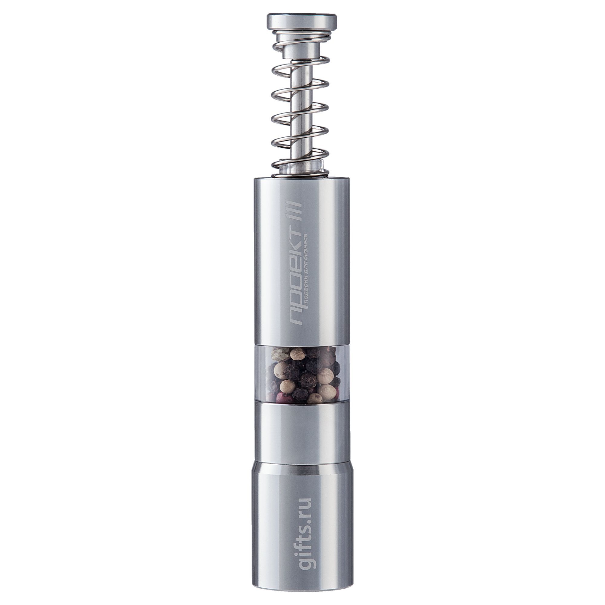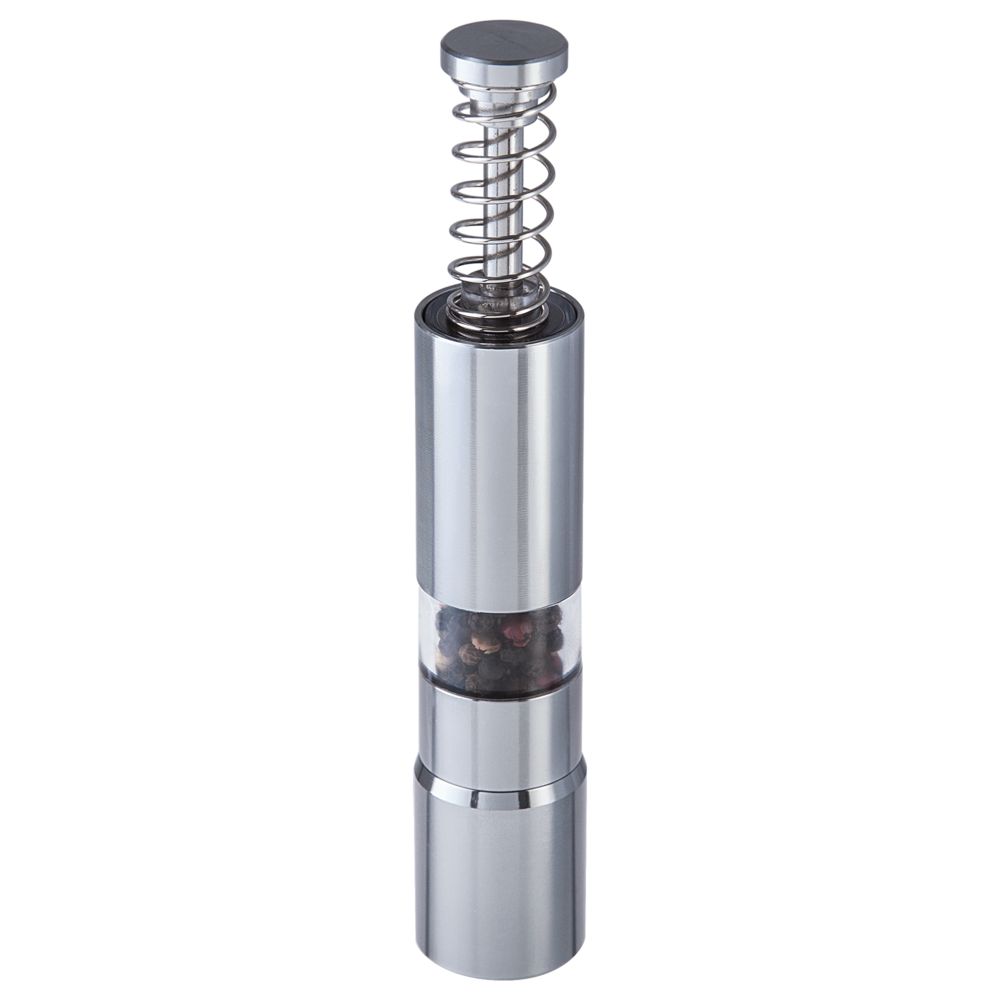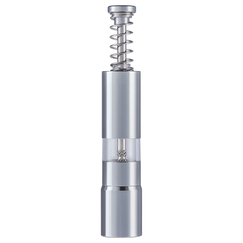 Ручная мельница с пружинным механизмом и металлическими жерновами.