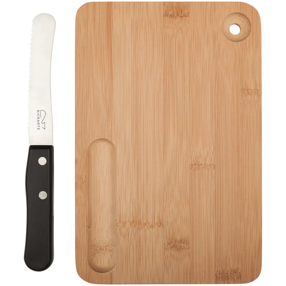 Разделочная доска и нож Fruhstuck — идеальный дуэт для правильного начала дня. Зубчатое лезвие ножа позволит без усилий разрезать свежую булочку, а при помощи закругленного кончика не составит труда равномерно намазать масло или джем.