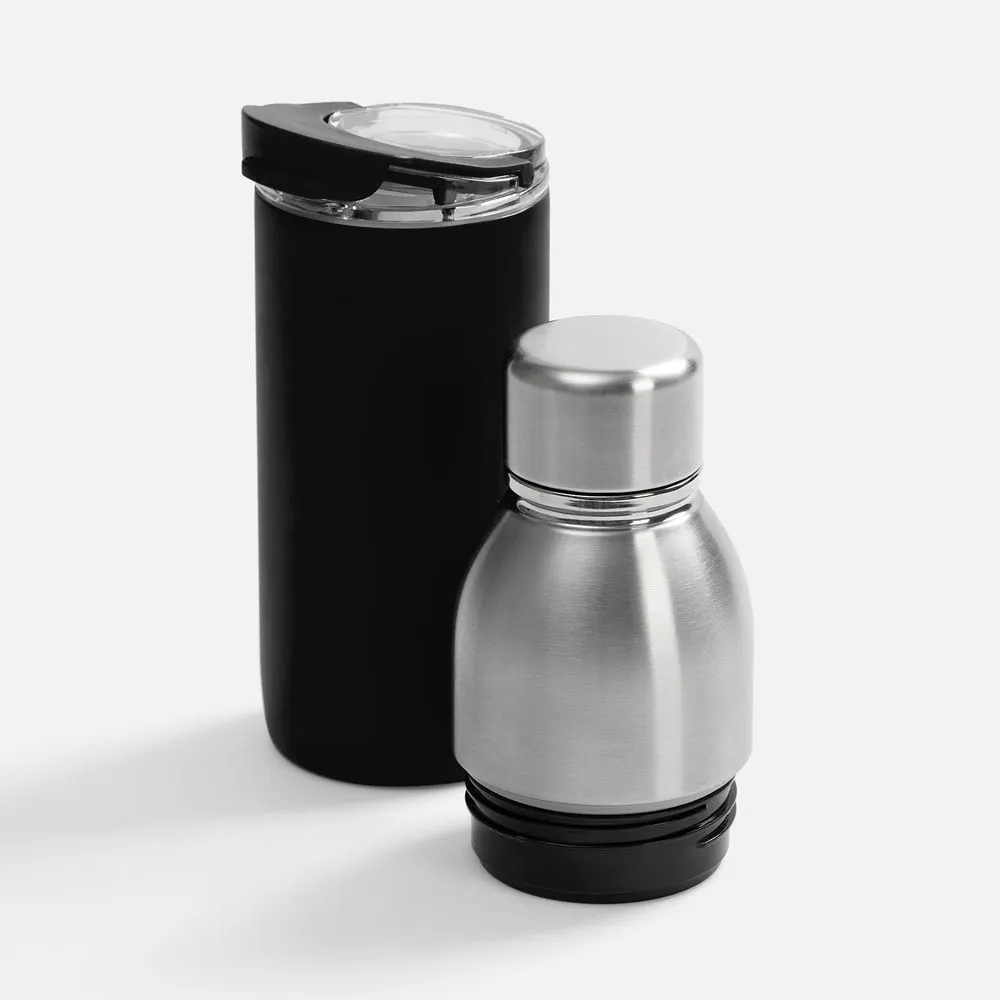 Varianti — это яркий пример посуды с двойной функциональностью. Один и тот же корпус можно превратить как в термостакан для чая и кофе с пластиковой крышкой, так и в термобутылку для прохладительных напитков со стальной крышкой.